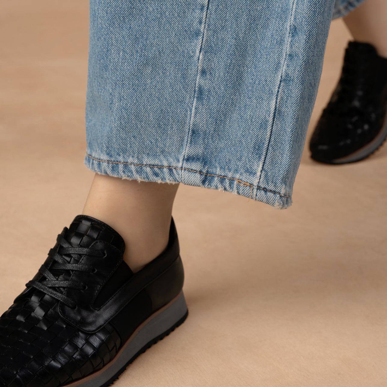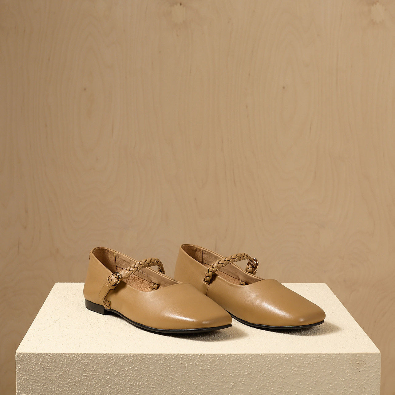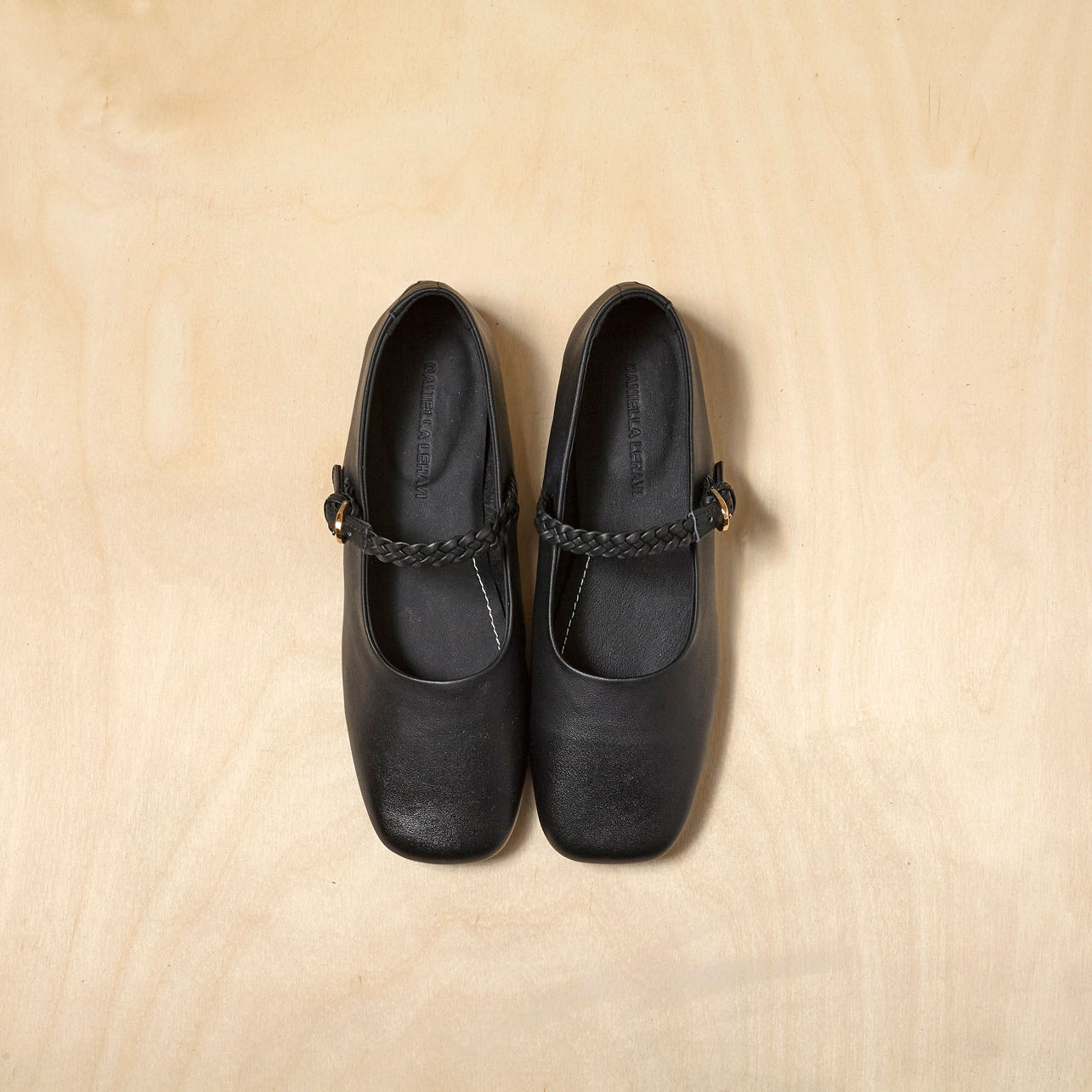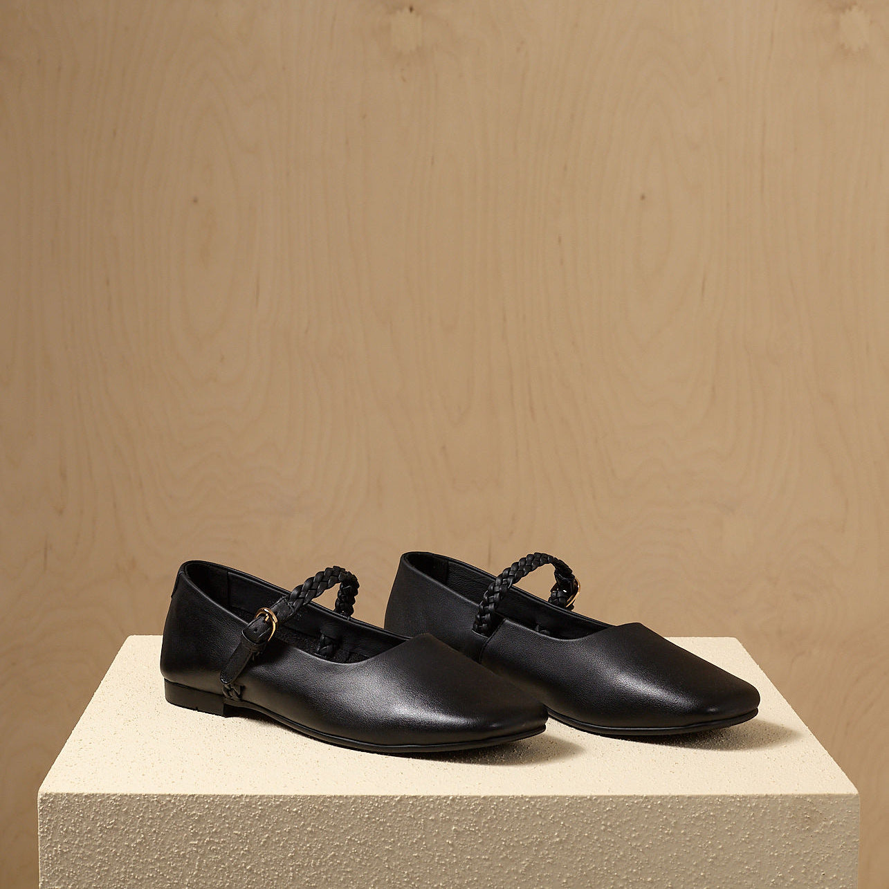 נעליים שטוחות בעיצוב סגור ומעודן, עשויות עור קלוע בגימור רך ומחבק.