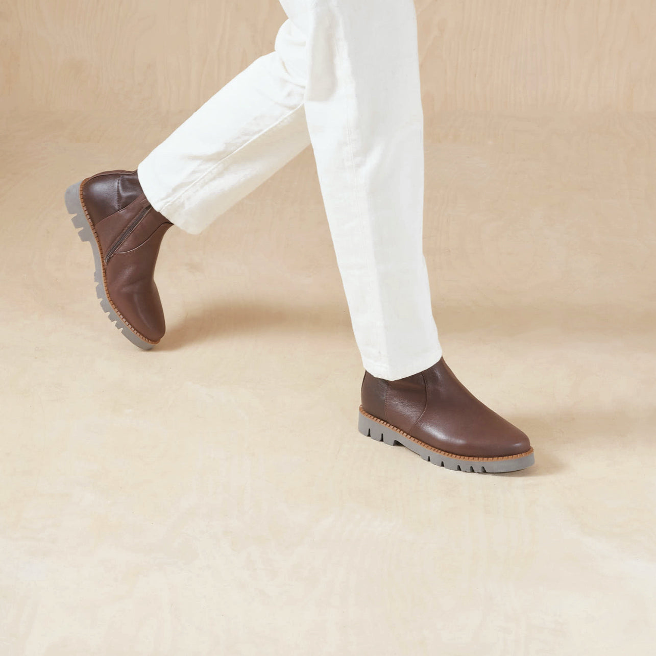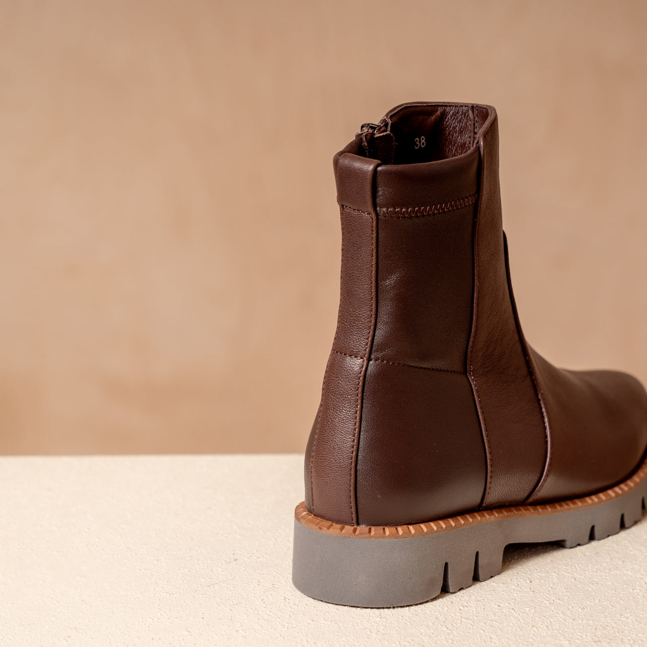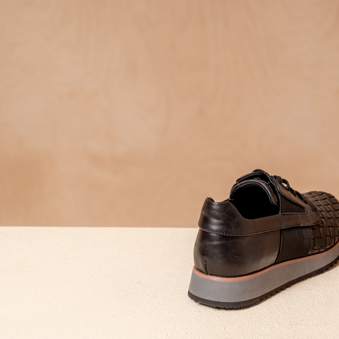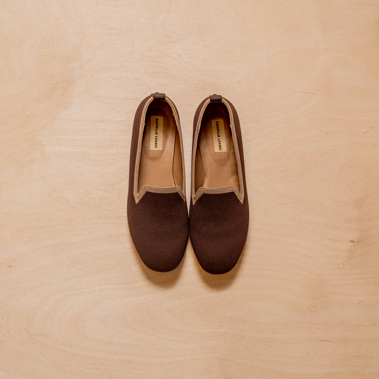 אותו דגם קיים גם בגוון שוקולד עשיר, עם סוליה בהירה ותפרים בהירים.