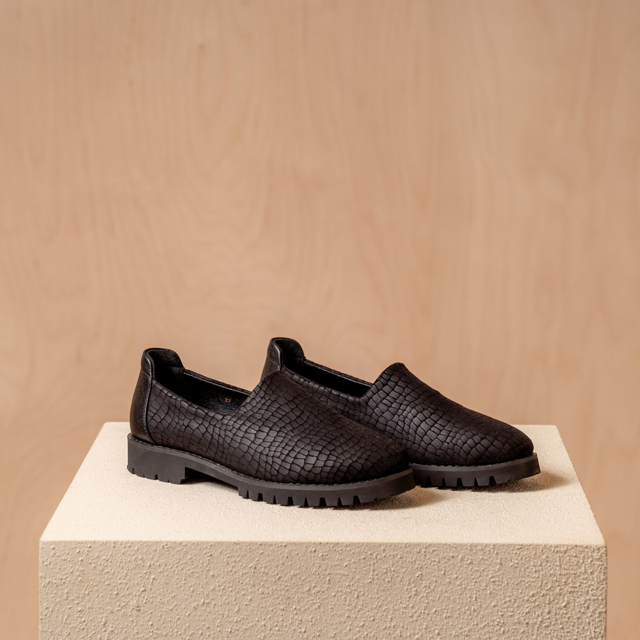מוקסינים שחורים עם תפר בהיר, סוליה בולטת, עקב קטן וברק מטושטש.