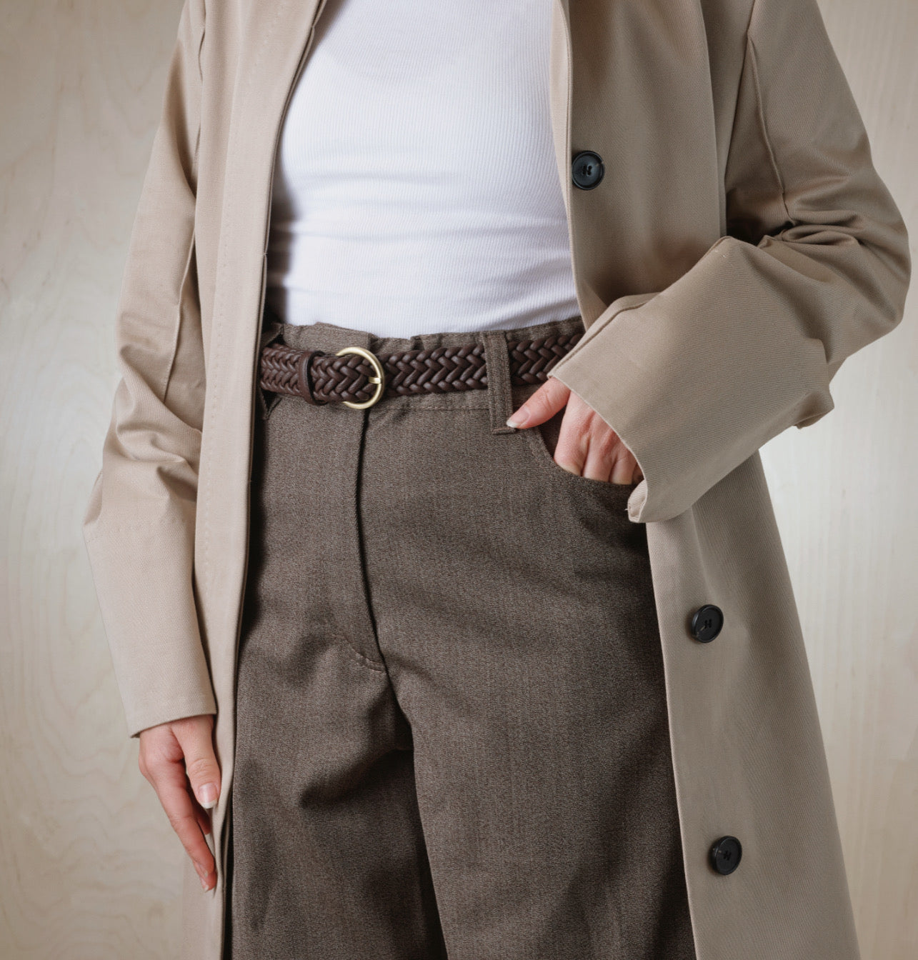 Braided belt  בעלת מראה טבעי ואלגנטי שמוסיף עומק לכל הופעה. הקליעה מעניקה לה טקסטורה עשירה ונוכחות ייחודית, והאבזם המתכתי משלים את המראה באיזון מושלם בין קלאסיות לפשטות מודרנית.