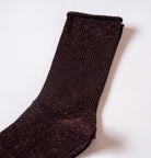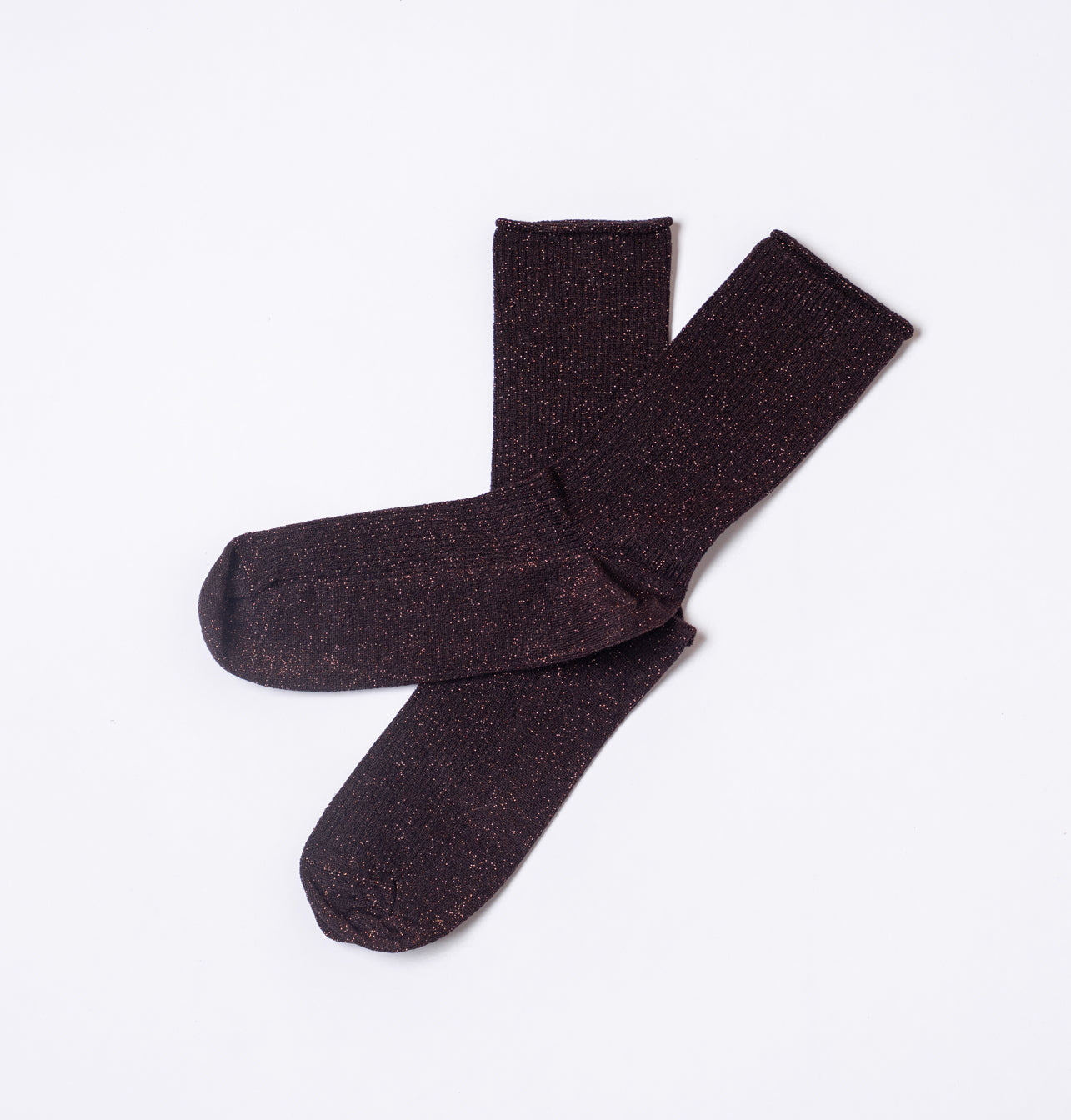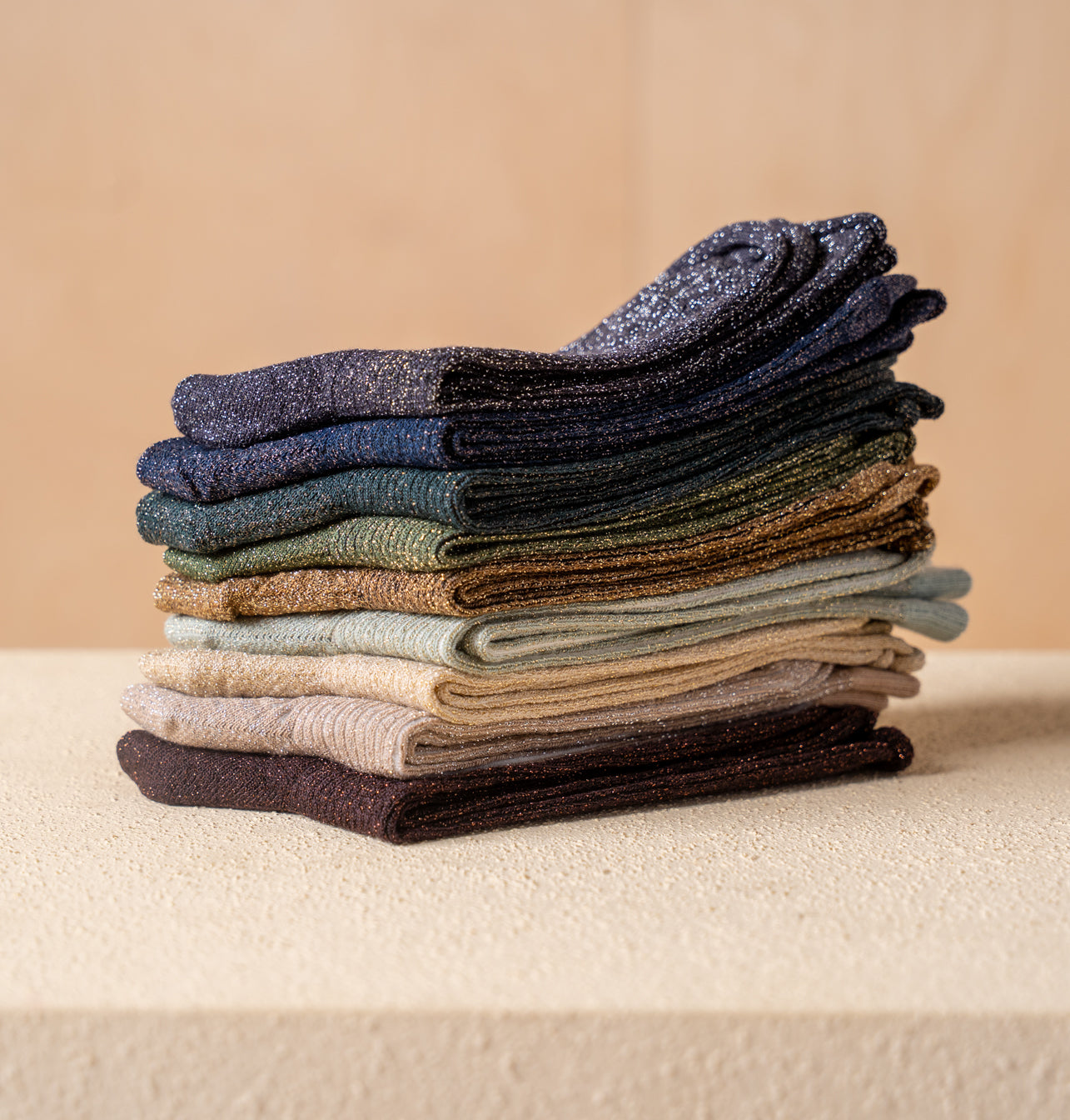 גרבי הלורקס המנצנצות עשויות בעיקר מסיבי במבוק ליוסל, סיב טבעי ואקולוגי לחלוטין. ליוסל הוא חומר רך וקל משקל, בעל תכונות ספיגה, תוך שהוא עמיד במיוחד. במובן מסוים, החומר המושלם. מבחינת סגנון, יש קיפול במקום הגבול הקלאסי למגע אלגנטי יותר. הצד הנמתח מאפשר לגרביים להתאים לצורת כל הרגליים, גדולות כקטנות.