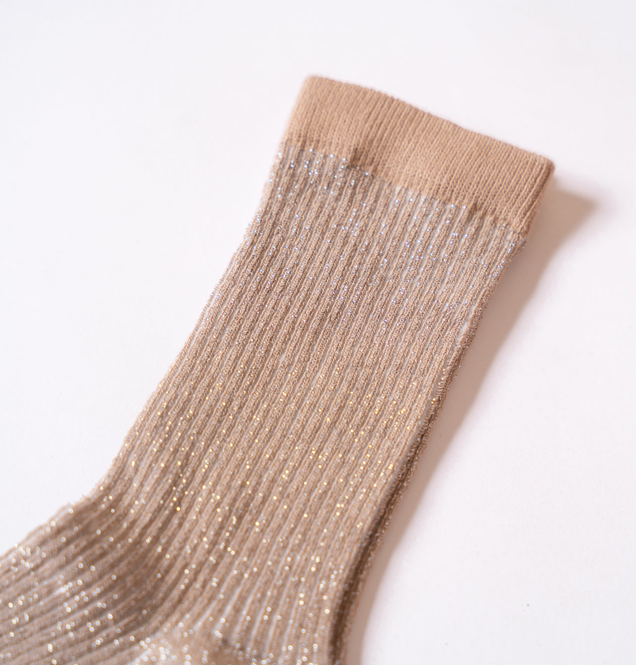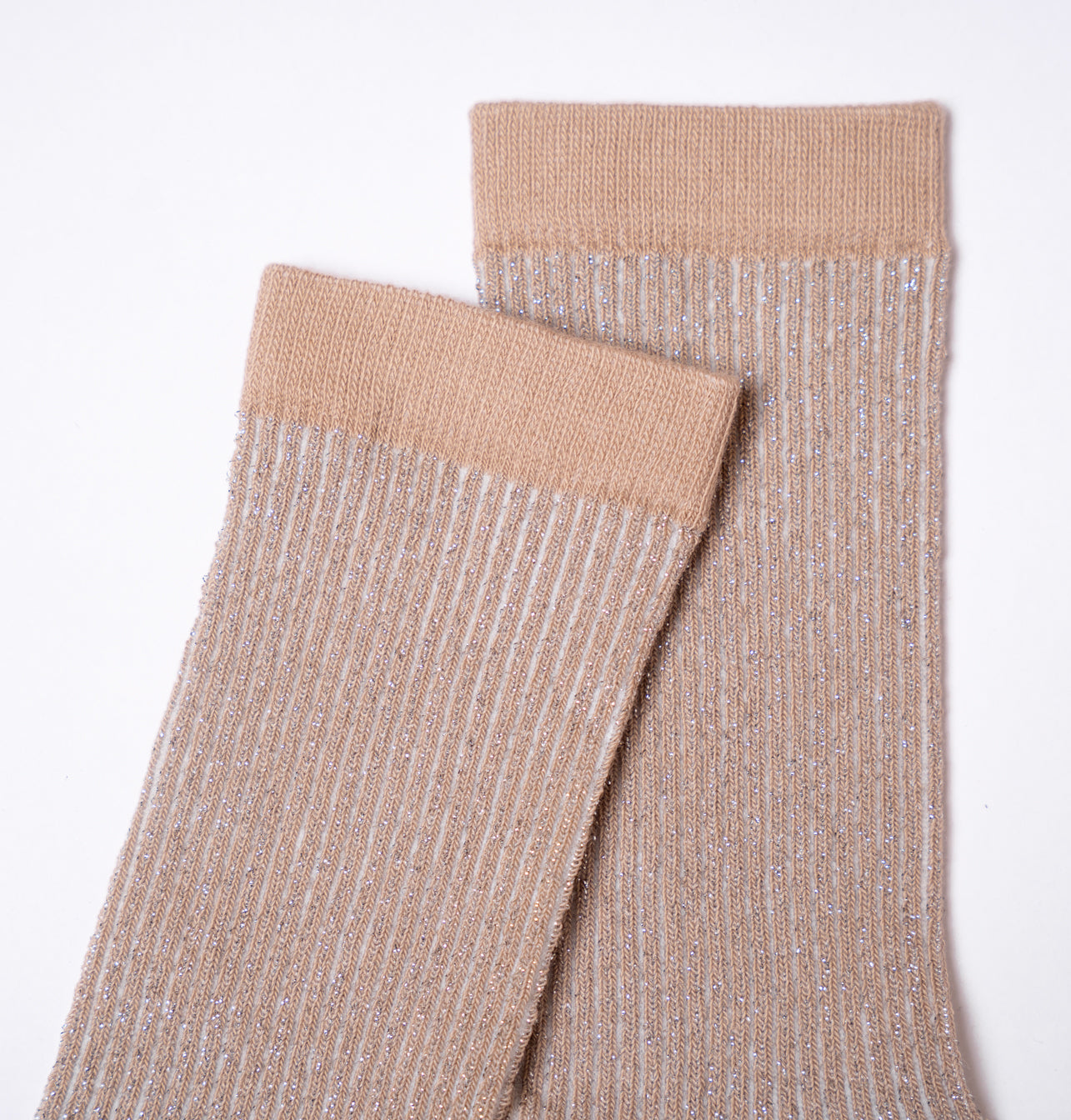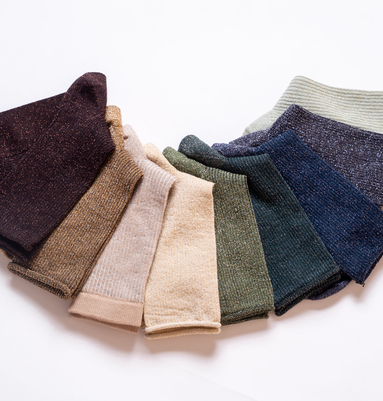 גרבי הלורקס המנצנצות עשויות בעיקר מסיבי במבוק ליוסל, סיב טבעי ואקולוגי לחלוטין. ליוסל הוא חומר רך וקל משקל, בעל תכונות ספיגה, תוך שהוא עמיד במיוחד. במובן מסוים, החומר המושלם. מבחינת סגנון, יש קיפול במקום הגבול הקלאסי למגע אלגנטי יותר. הצד הנמתח מאפשר לגרביים להתאים לצורת כל הרגליים, גדולות כקטנות.