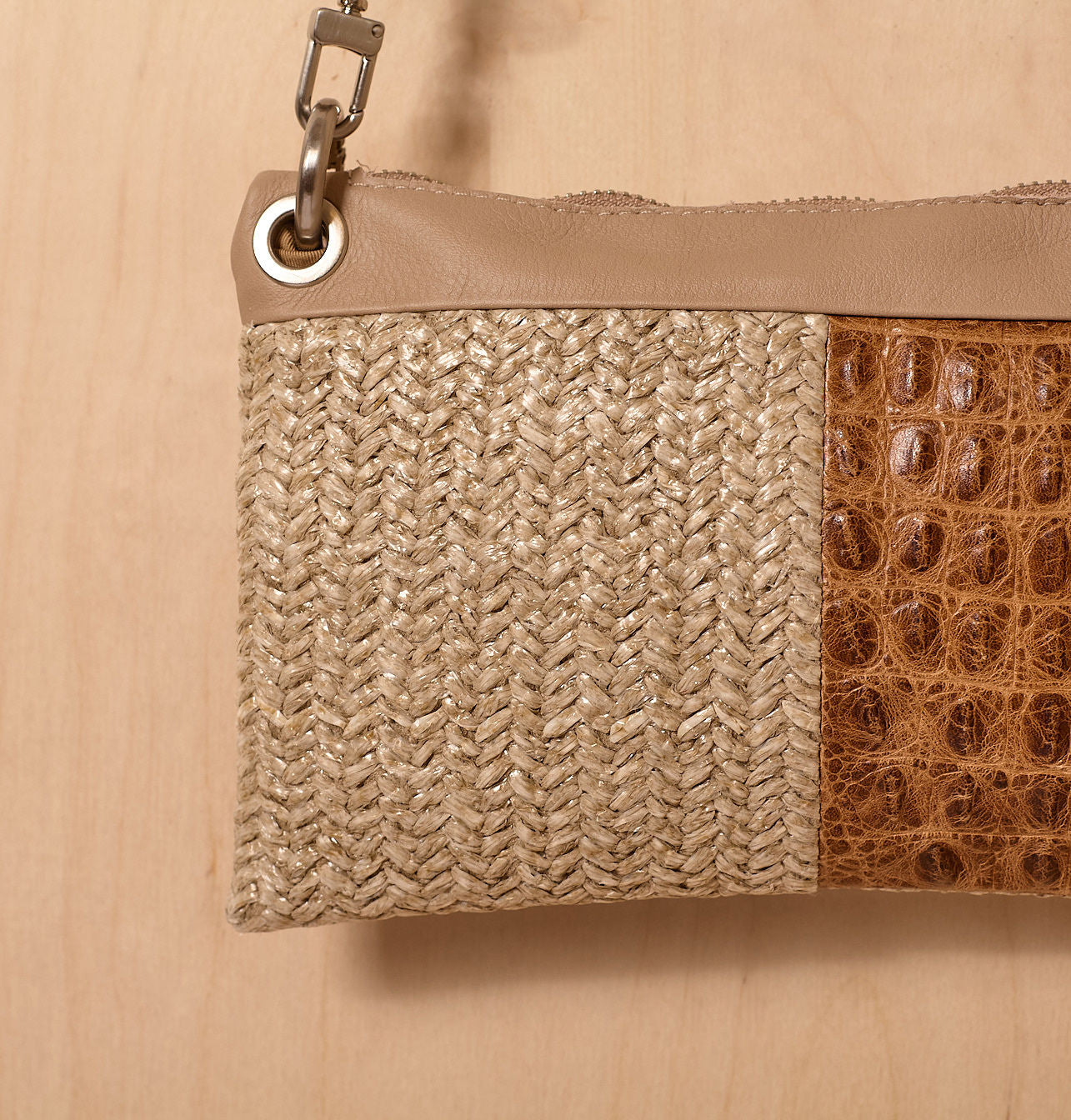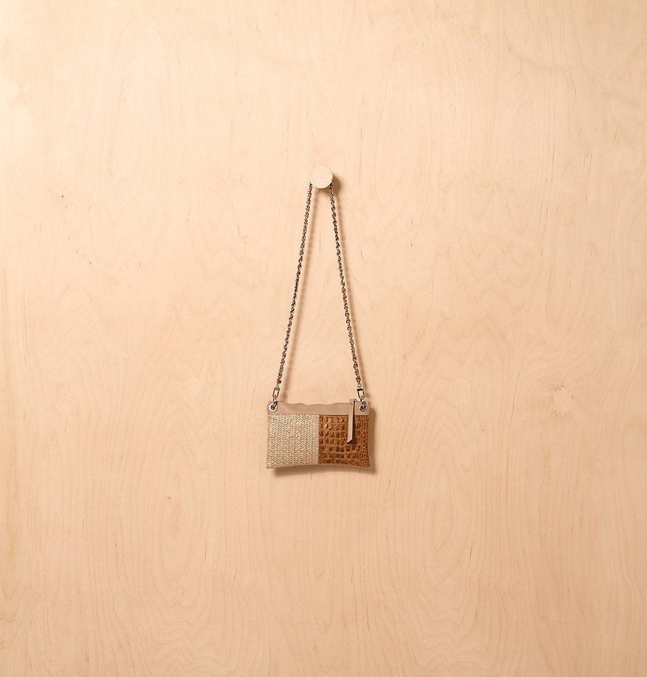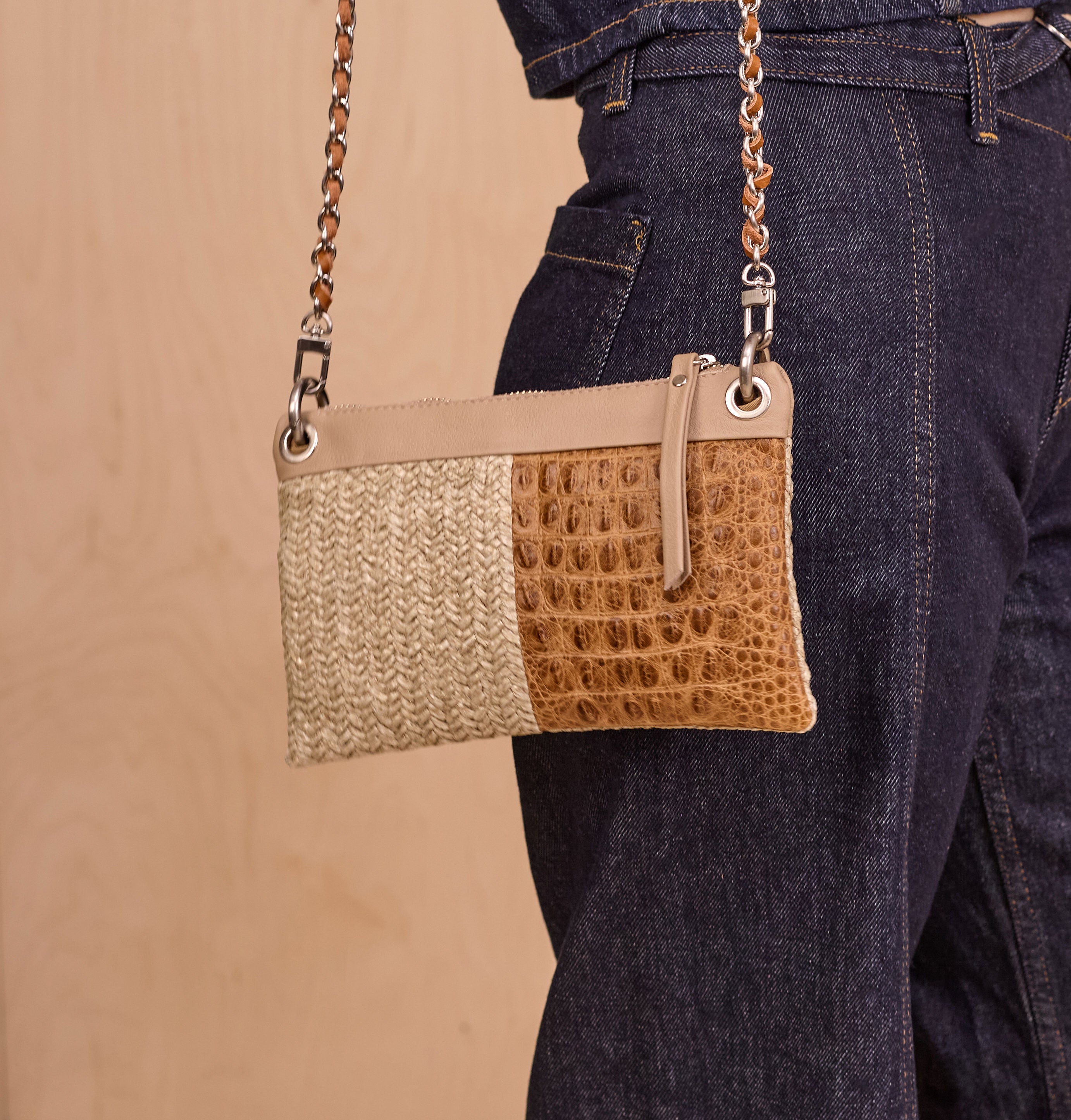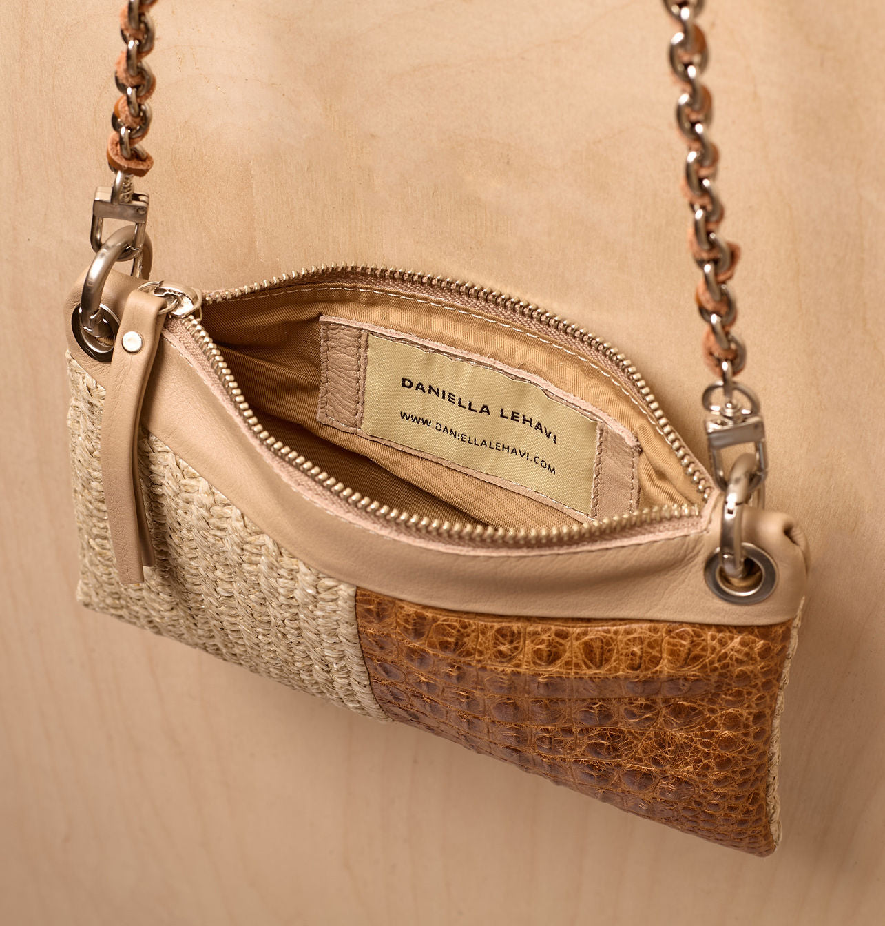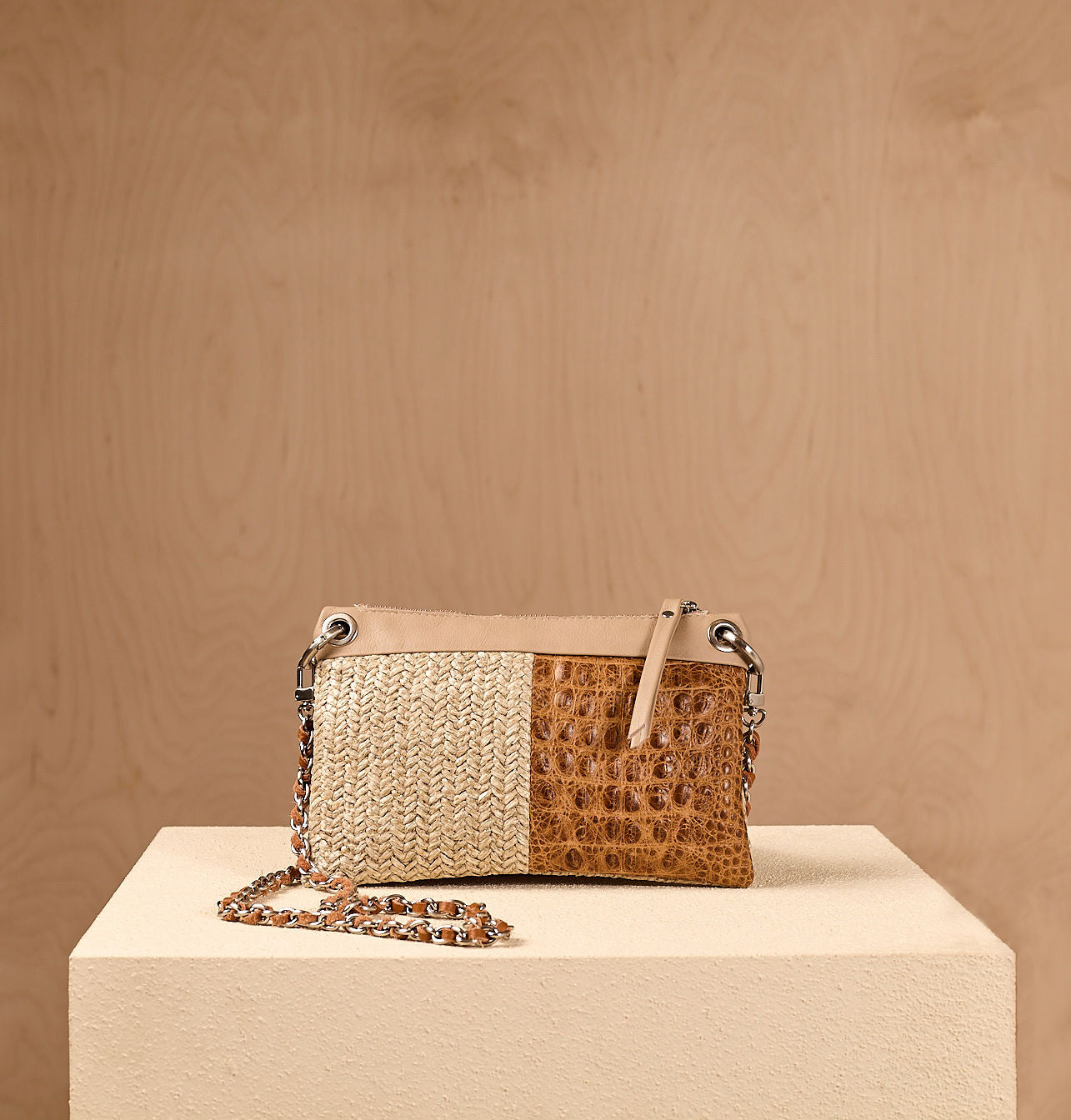 תיק קלאץ' מיני בעיצוב ייחודי, המשלב שלושה Malika Clutch סוגים של טקסטורות בעור וקש. מיועד לנשיאת חפצים קטנים, וכולל רצועה בעבודת יד משולבת עור ושרשרת מתכת, הניתנת להסרה לנוחות מרבית. לתיק תא מרכזי עם סגירת רוכסן וכיס פנימי קטן פתוח.