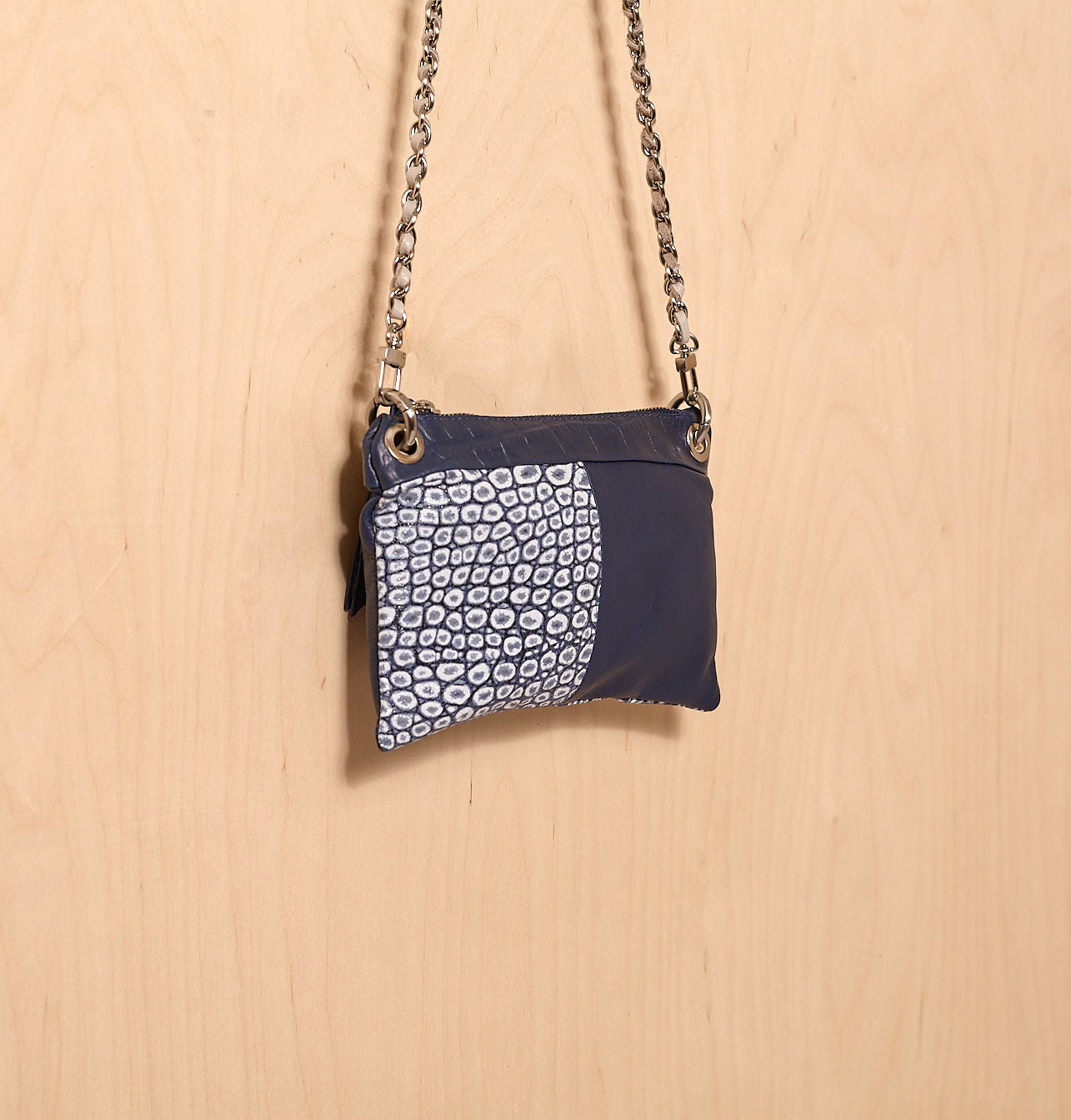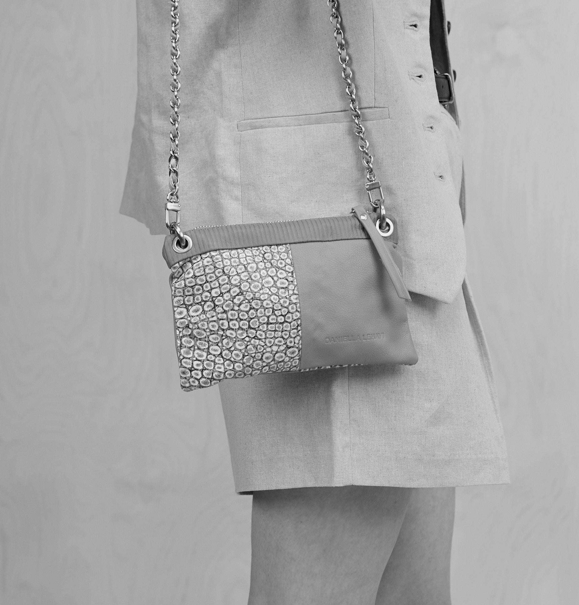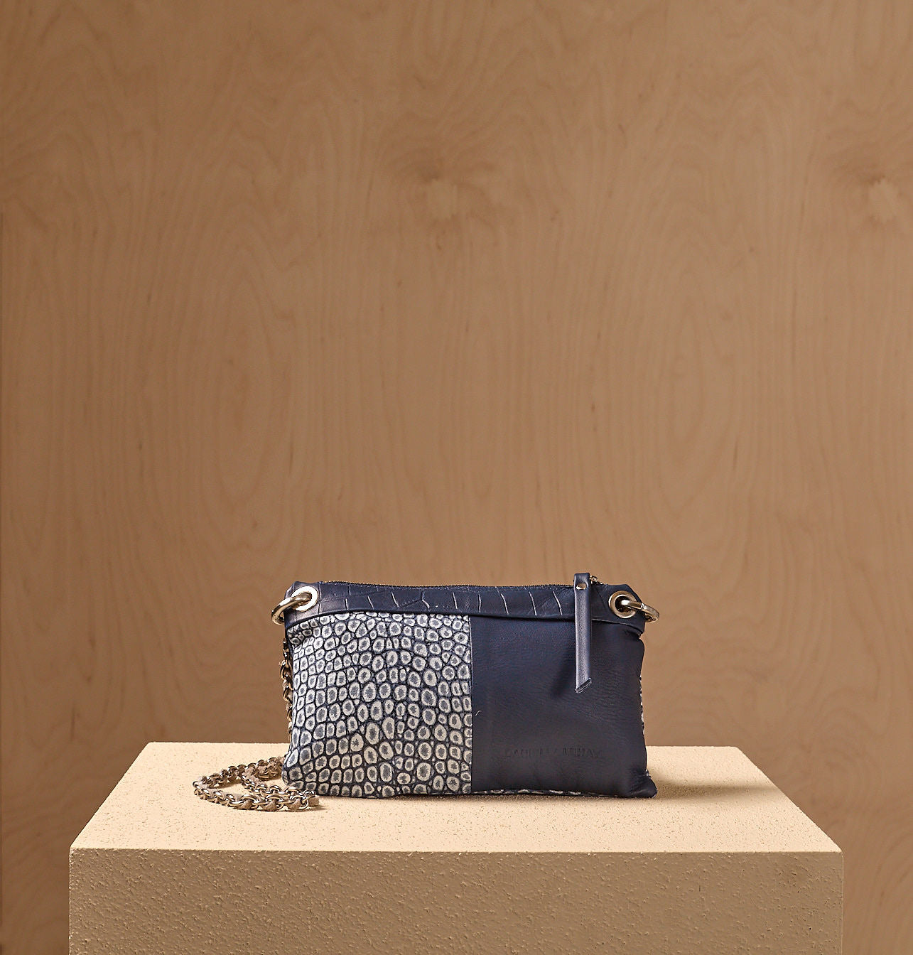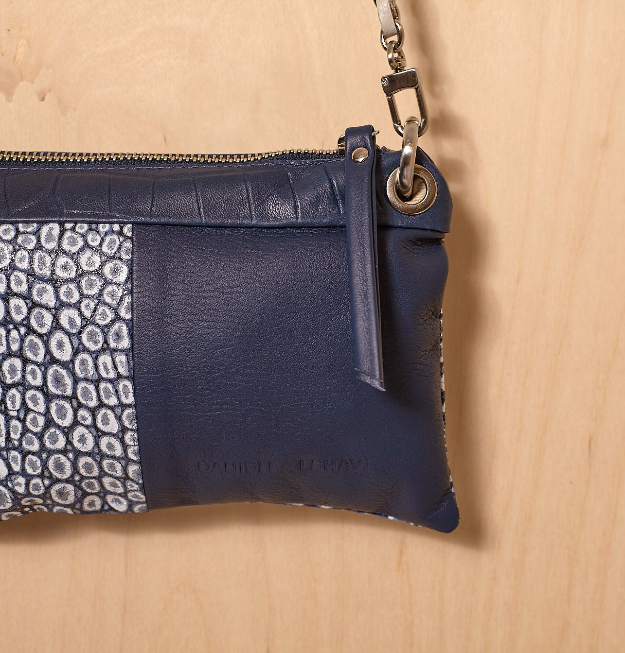 Malika Clutch הוא תיק קלאץ' בגודל מיני – מיועד לנשיאת חפצים קטנים. הוא כולל רצועה מושחלת בעבודת יד, בשילוב עור ושרשרת, כך שתוכלי לשאת אותו כקלאץ' או כתיק צד. שילוב ייחודי של שלושה סוגי עורות בטקסטורות שונות מוסיף לו ייחודיות ועניין. לתיק תא עיקרי בסגירת רוכסן וכיס פנימי קטן ופתוח.