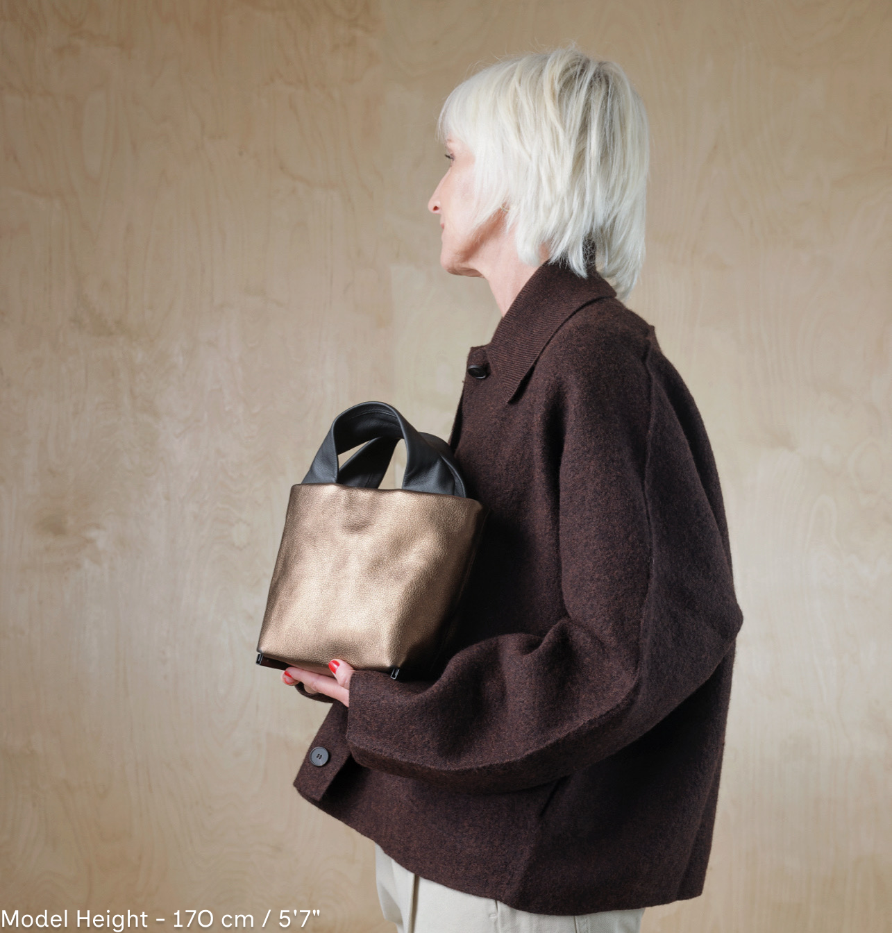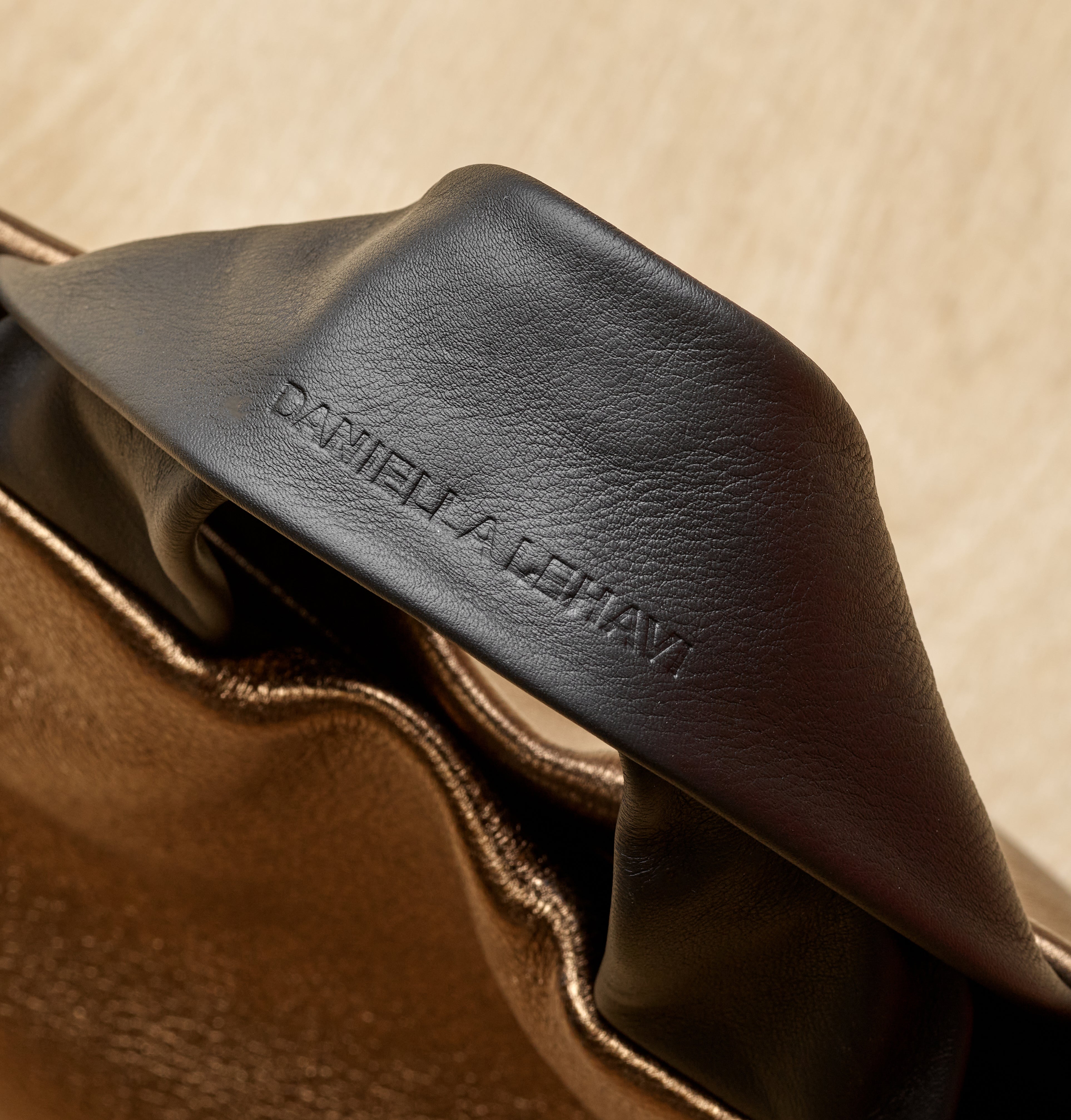 Alexa Chain Mini תיק שנבנה סביב צללית רכה שמחזיקה צורה נקייה ומדויקת. הידיות מאפשרות אחיזה טבעית ונינוחה, ורגליות המתכת המוכרות שלנו מוסיפות קו תעשייתי עדין שמדגיש את המפגש בין רכות לעוצמה. יש בו אלגנטיות ונוכחות שמורגשת מבלי לבקש תשומת לב. השרשרת הדקה מאפשרת לשאת אותו על הגוף, והידיות יוצרות אפשרות לנשיאה קרובה יותר. שתי האפשרויות מדגישות את היכולת שלו להתאים את עצמו למראה ערב נקי ומדויק.