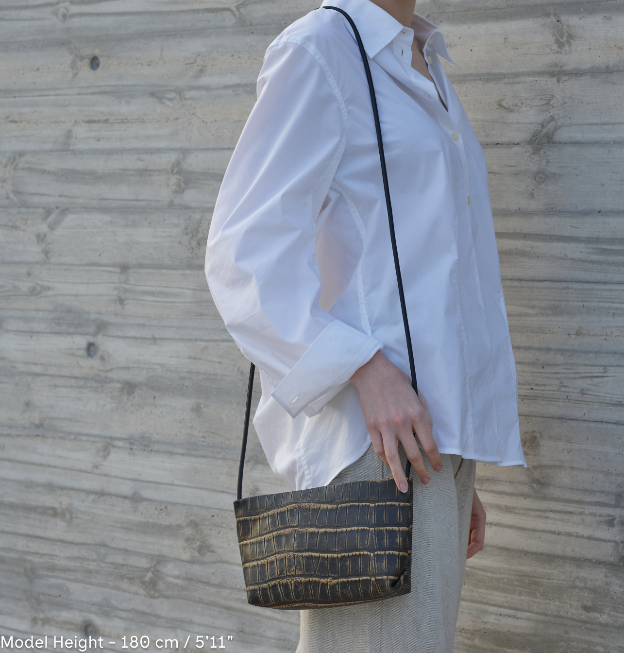 העור יוצר עומק עדין ונוכחות שקטה לצורה הקלאסית.