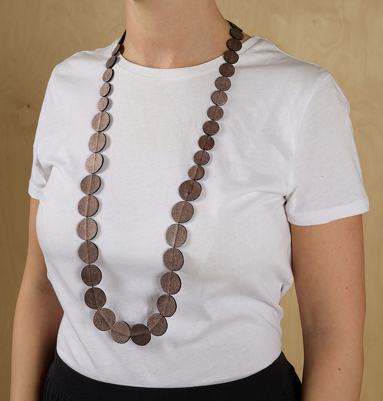 שרשרת מעוצבת המשלבת עיגולי עור שגדלים בהדרגה ליצירת מראה אלגנטי ומודרני. בעיצוב נקי ומתוחכם, שרשרת ארוכה ללא סגירה.