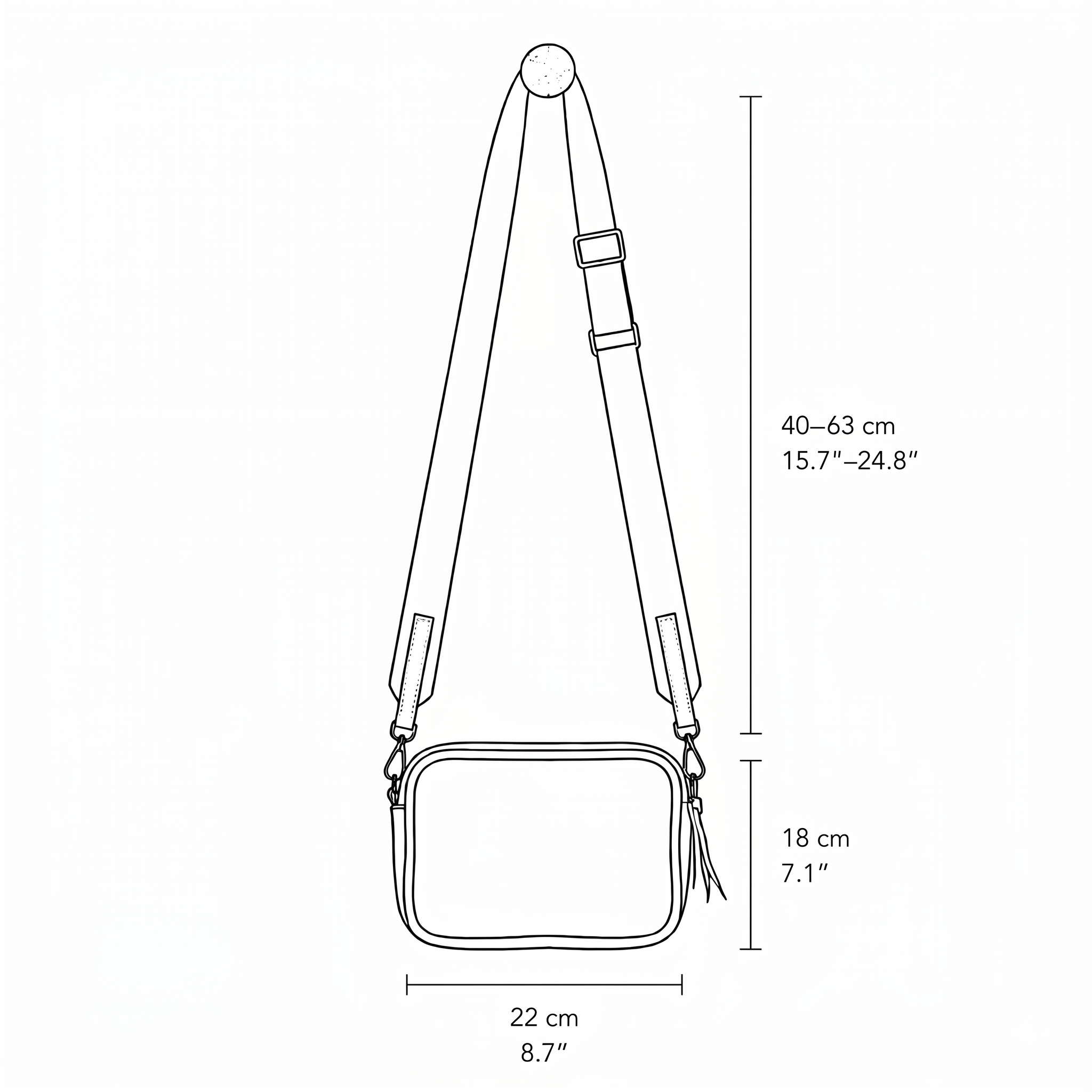 - הרצועה מתכווננת באורך: 85–126 ס"מ, אורך נשיאה 63–40 ס"מ