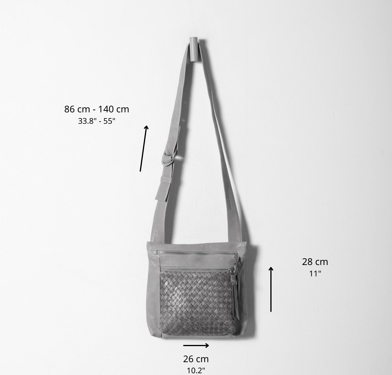 - רוחב: 26 ס"מ, גובה 28 ס"מ עומק 10 ס"מ, אורך רצועה מקסימלי: 140 ס"מ, מינימלי 86 ס"מ