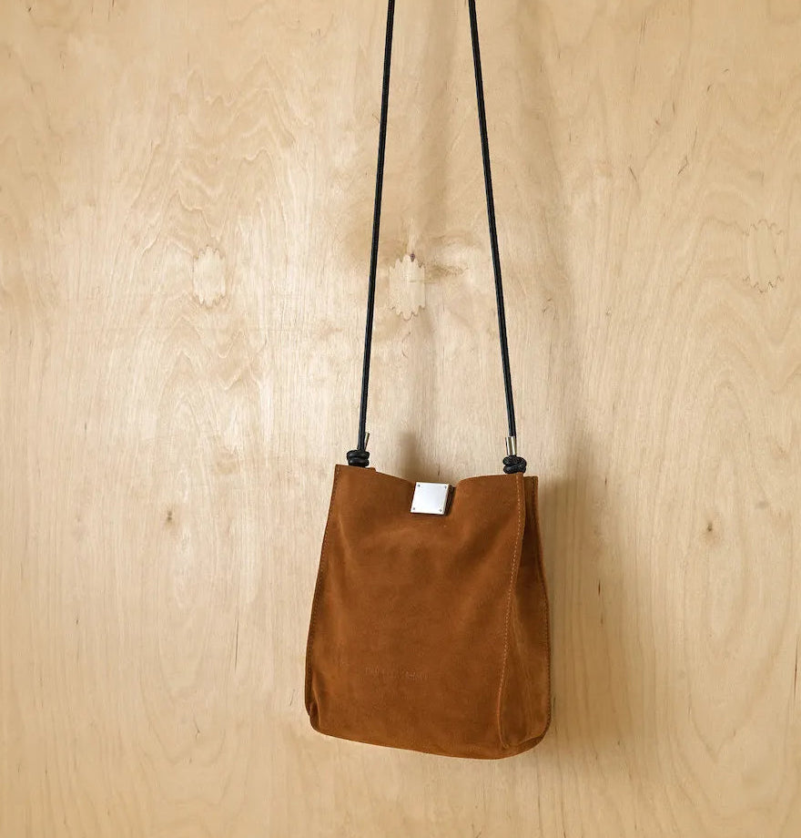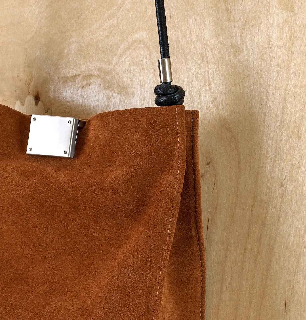 הזמש במרקם המיוחד ואביזרי המתכת יוצרים חיבור בין חומר קלאסי לטוויסט עכשווי, עם מינימליזם בצבע ונוכחות שקטה.