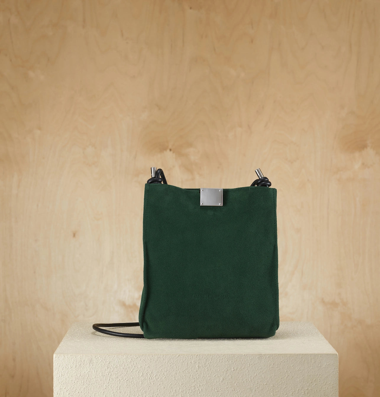 הזמש במרקם המיוחד ואביזרי המתכת יוצרים חיבור בין חומר קלאסי לטוויסט עכשווי, עם מינימליזם בצבע ונוכחות שקטה.
