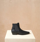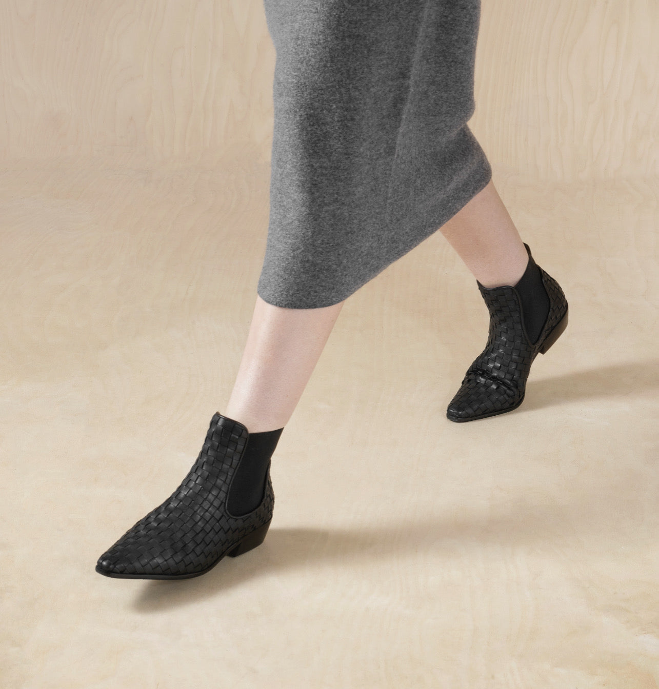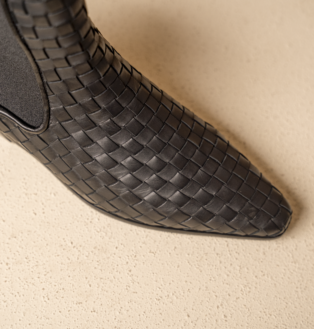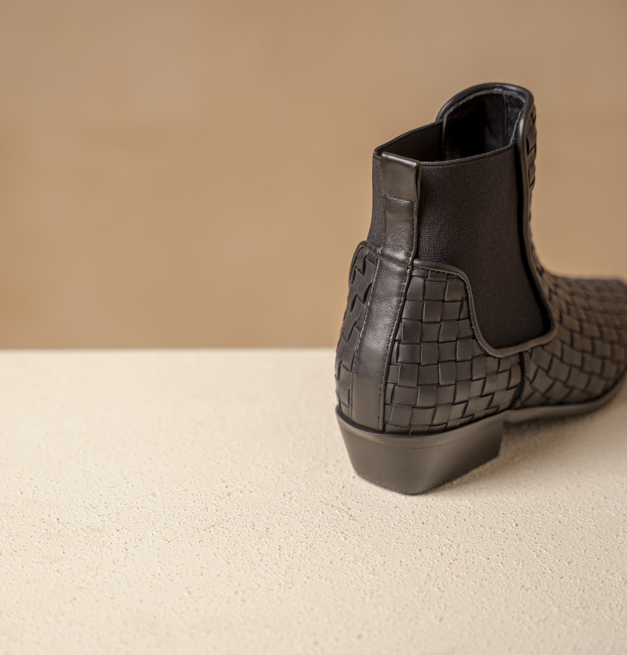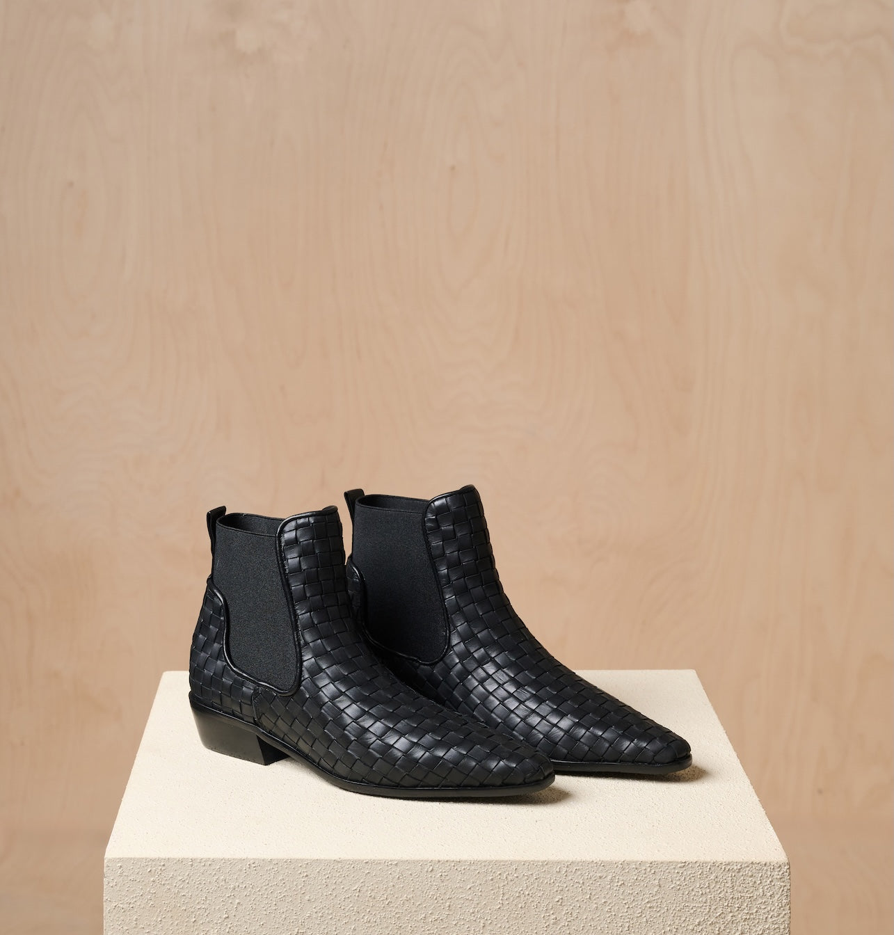 Corsica Ankle Boot הן מגפי צ'לסי בגזרת קרסול, המשלבים עור קלוע עם קווים מדויקים וחרטום מחודד. הגומי האלסטי בצדדים והלולאה האחורית מבטיחים נעילה וחליצה קלות ונוחות.