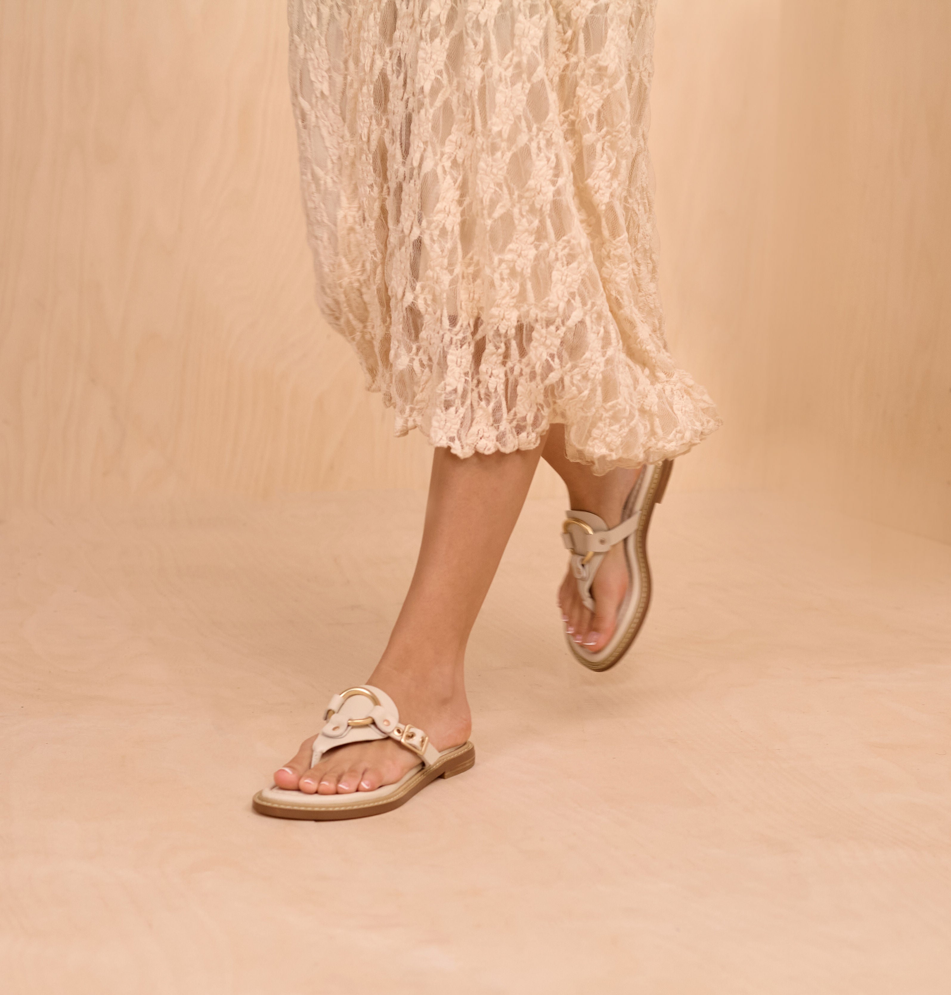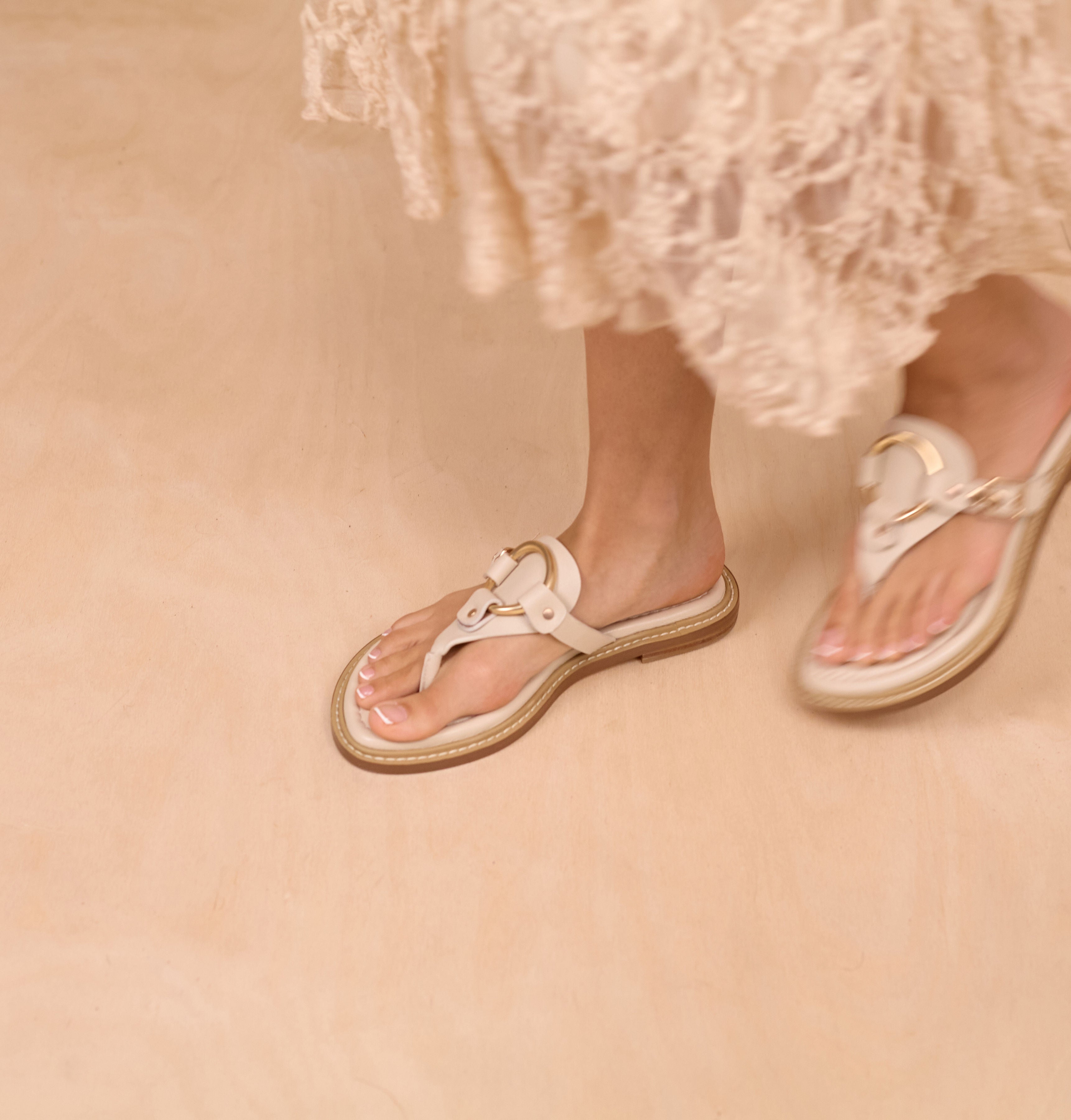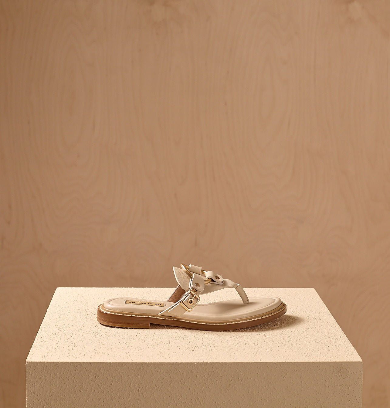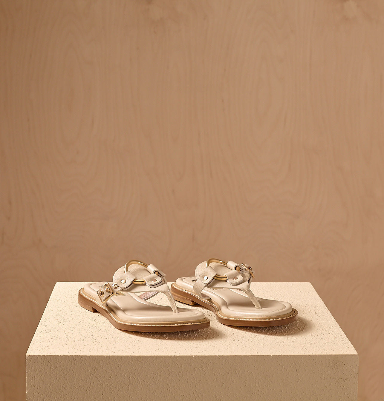 Cecile Ring Thongs  הסנדלים עשויים עור רך ואיכותי בשילוב עיטורי מתכת מוזהבים ומשדרים סטייל מודרני וקליל.הצבעוניות הפסטלית ואפשרות ההתאמה עם האביזם ברצועה הופכים את הדגם הזה לאידיאלי במיוחד לחופשות הקיץ החמות אבל בהחלט לא רק. שלבי אותו עם חצאית קלילה או מכנסי פשתן נשפכים ללוק בלתי מתאמץ.