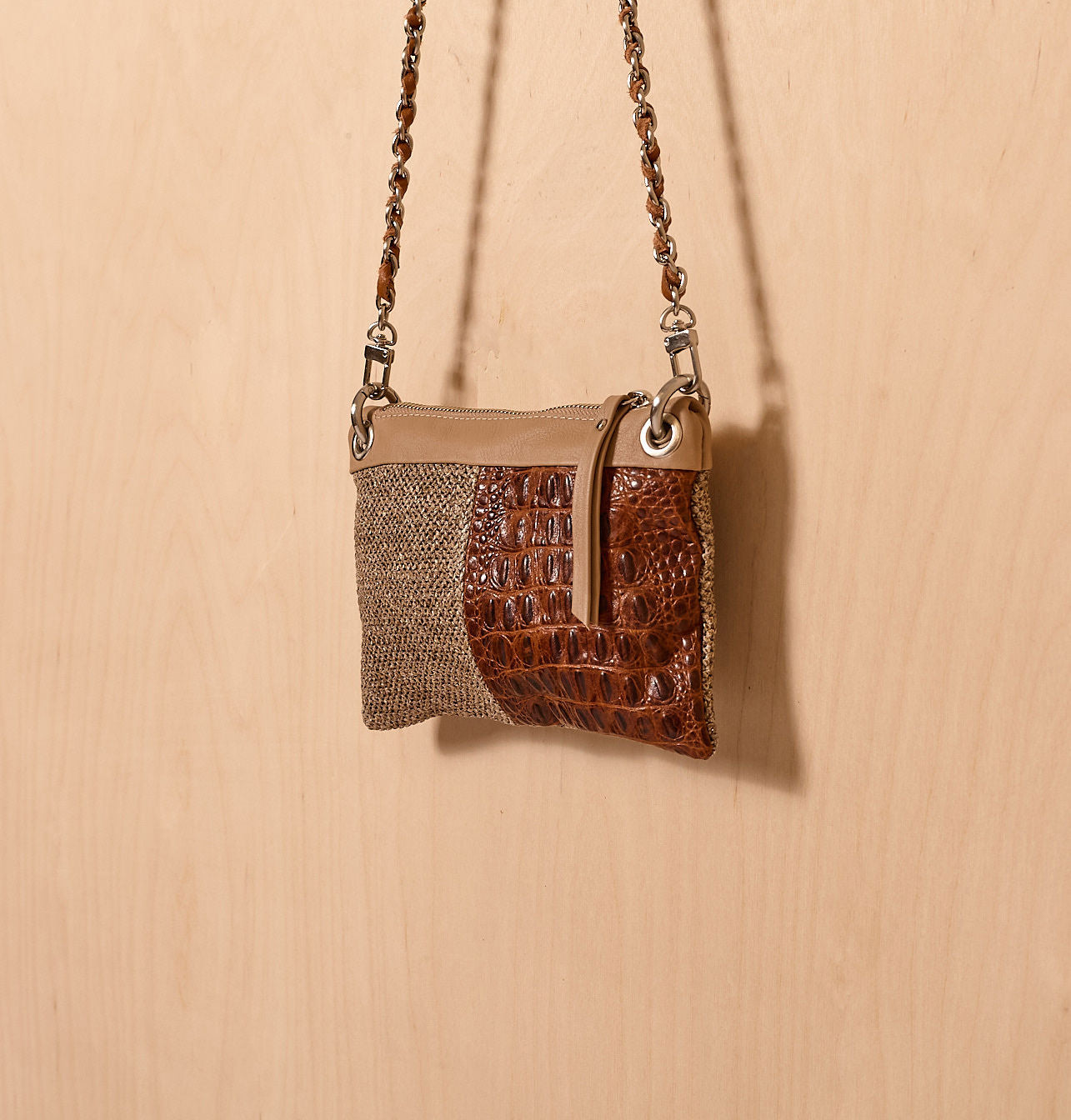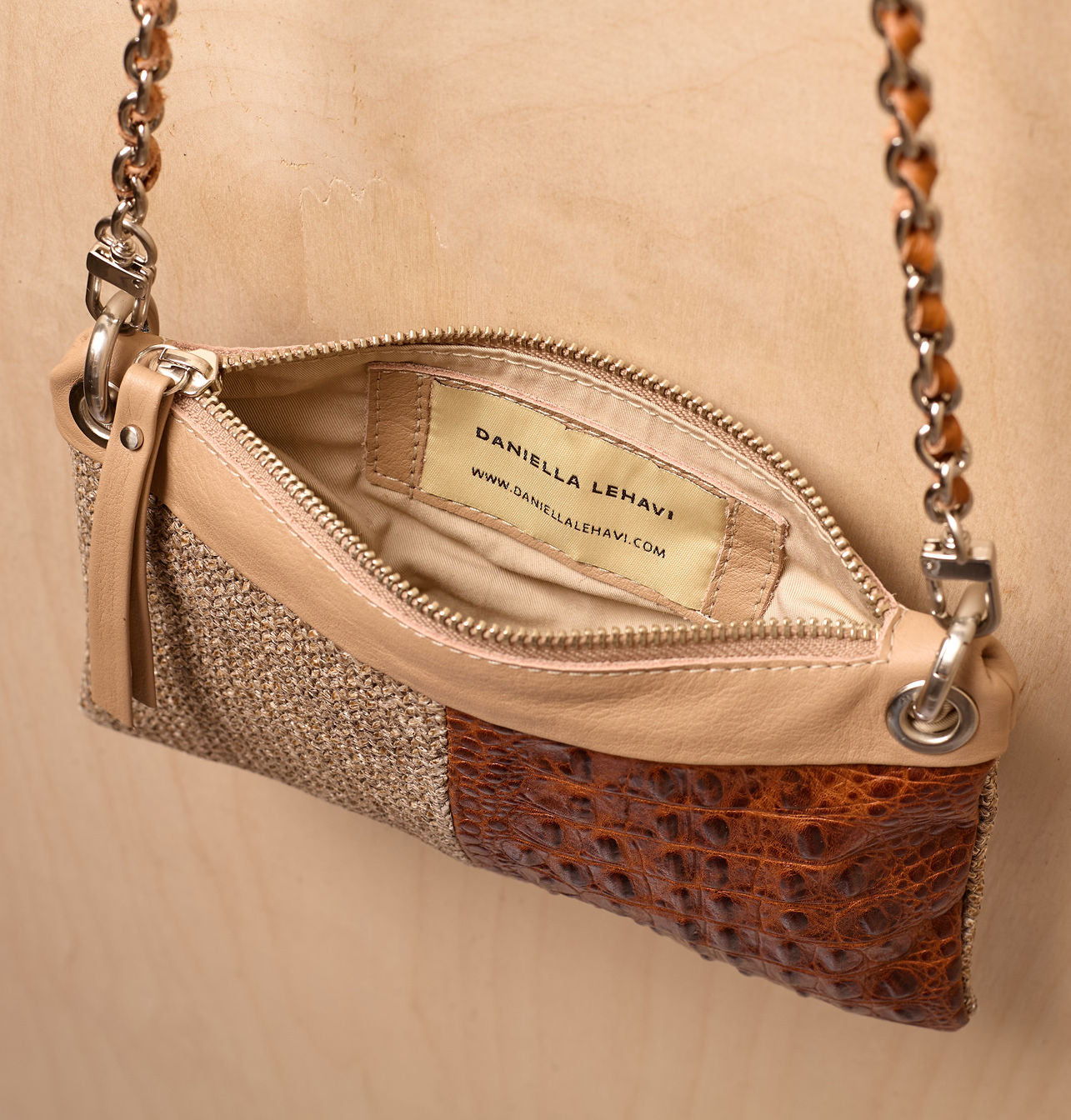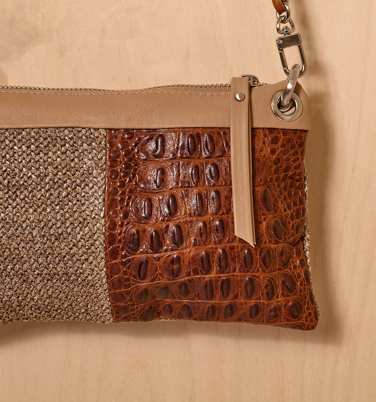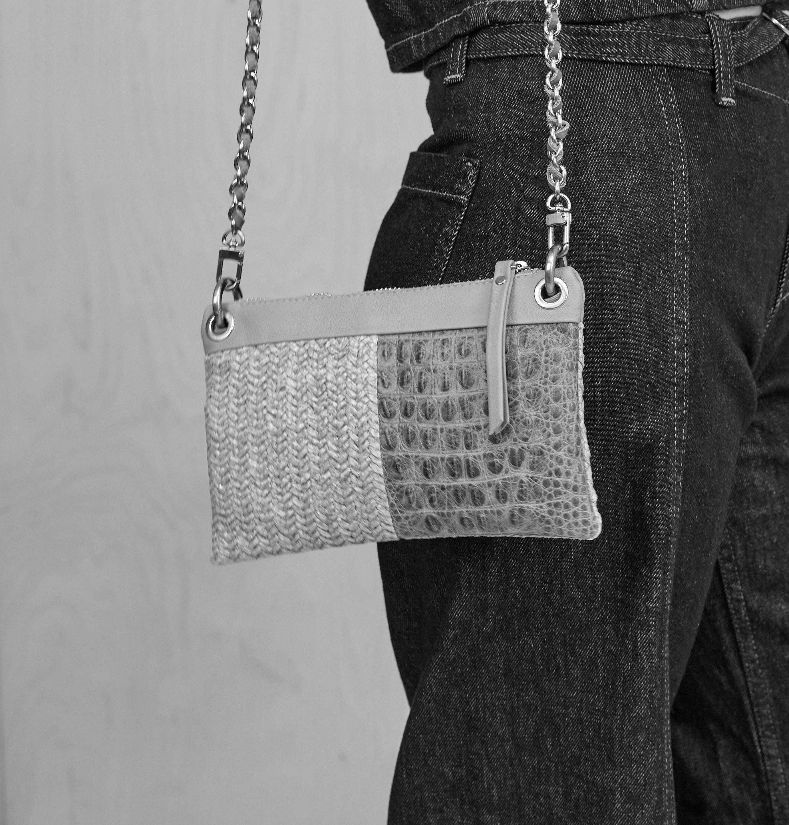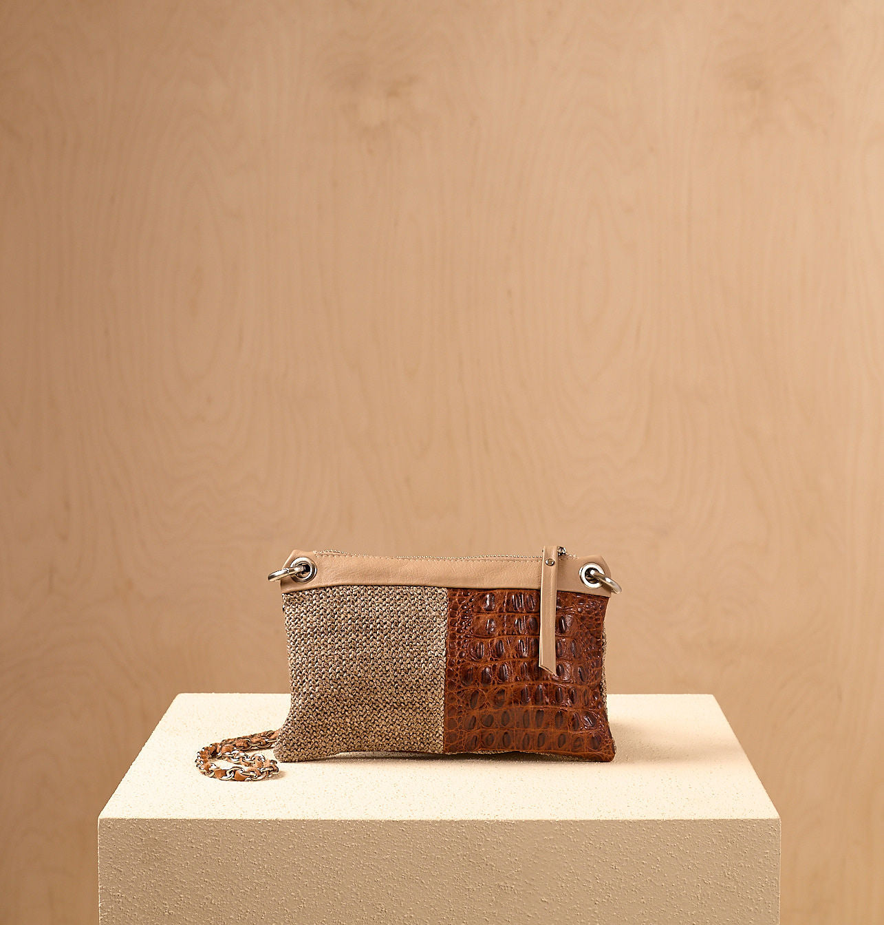 תיק קלאץ' מיני בעיצוב ייחודי, המשלב שלושה Malika Clutch סוגים של טקסטורות בעור וקש. מיועד לנשיאת חפצים קטנים, וכולל רצועה בעבודת יד משולבת עור ושרשרת מתכת, הניתנת להסרה לנוחות מרבית. לתיק תא מרכזי עם סגירת רוכסן וכיס פנימי קטן פתוח.