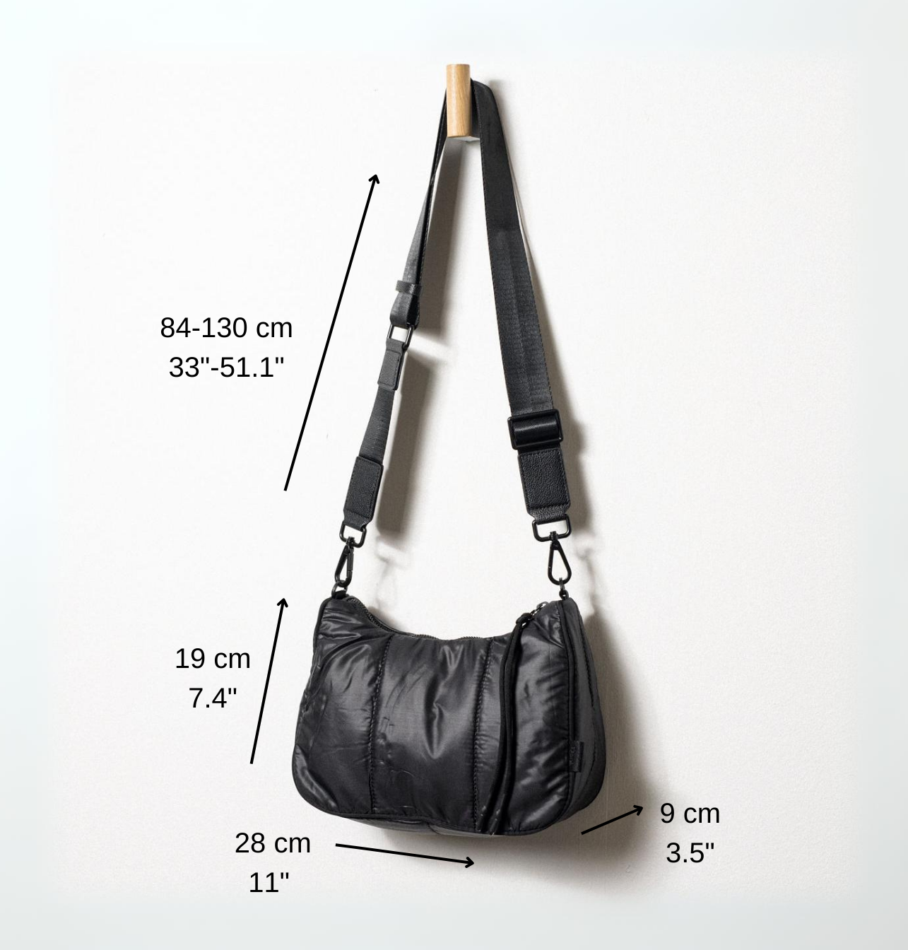- רוחב: 28 ס"מ, גובה: 19 ס"מ, עומק: 9 ס"מ, אורך רצועה עבה: 84-130 ס"מ.
