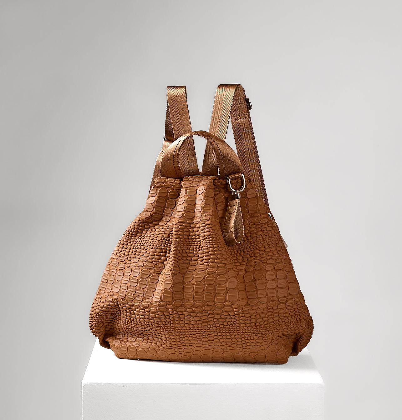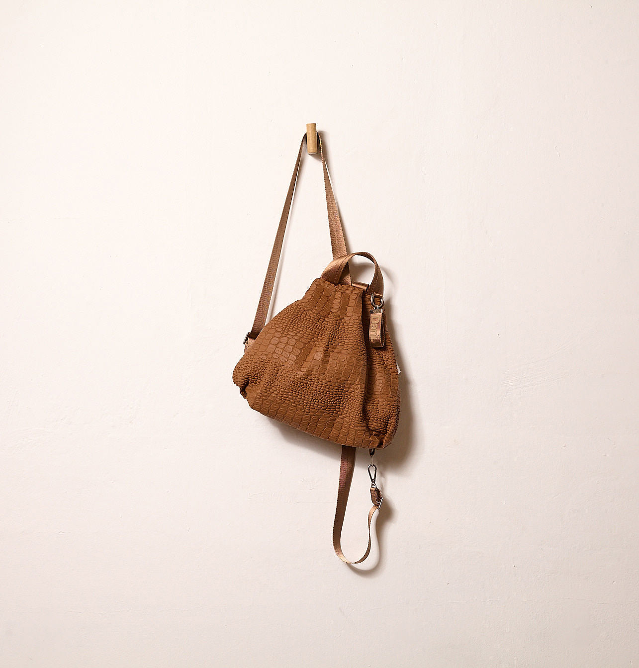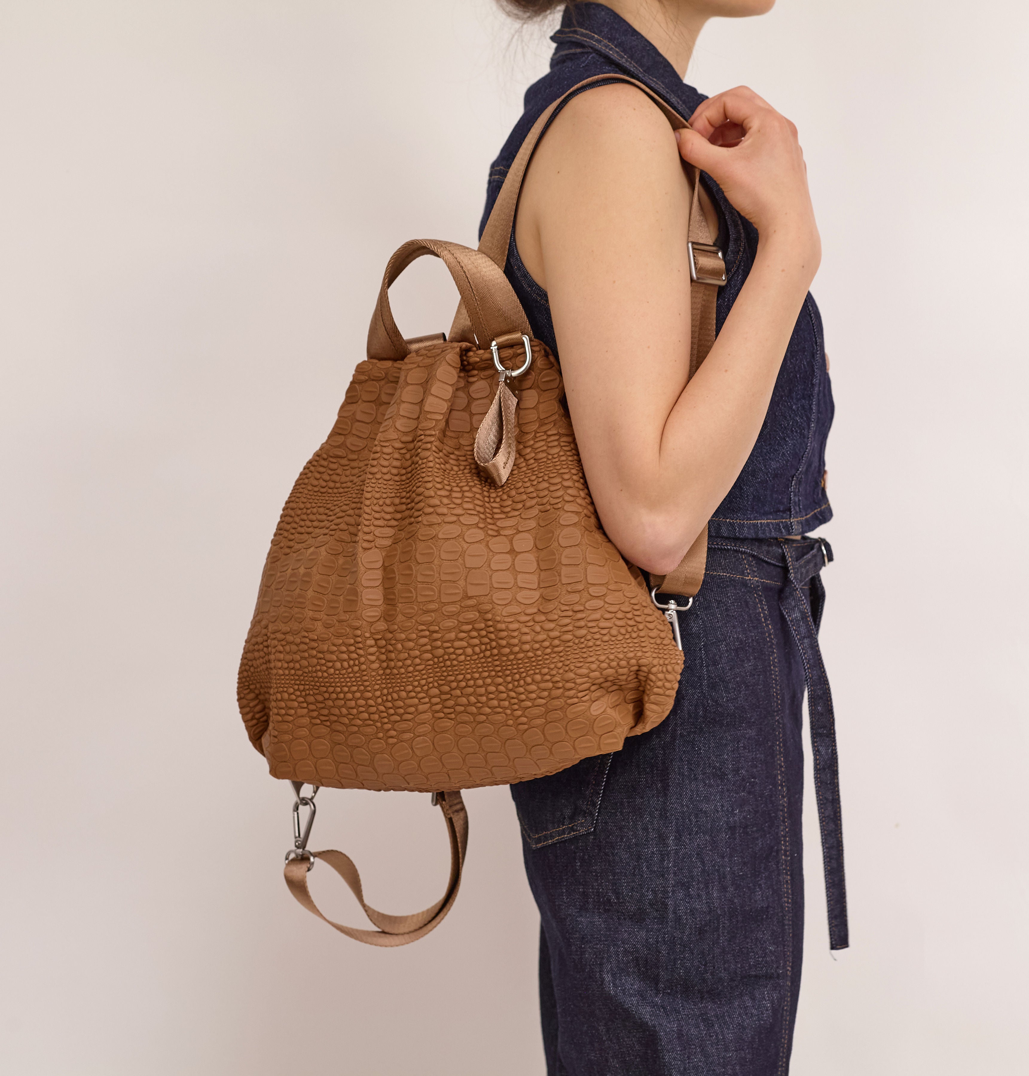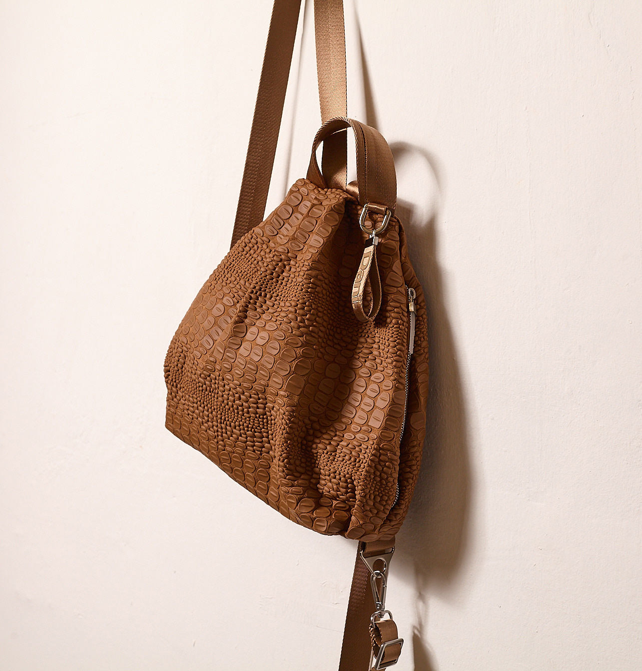 התיק גדול אך קל משקל, עשוי בד טבעוני בטקסטורת קרוק גומי, שהמבנה הייחודי שלה פותחה אצלנו בסטודיו. חיצונית קיימים שני כיסי צד, כיס גדול וקטן לאחסון נוח של חפצים שונים. לתיק רצועת יד קצרה ושתי רצועות רחבות לנשיאה על הגב. פריט סטייטמנט שישמש אותך הרבה בין אם ליומיום או לטיול לחו"ל.