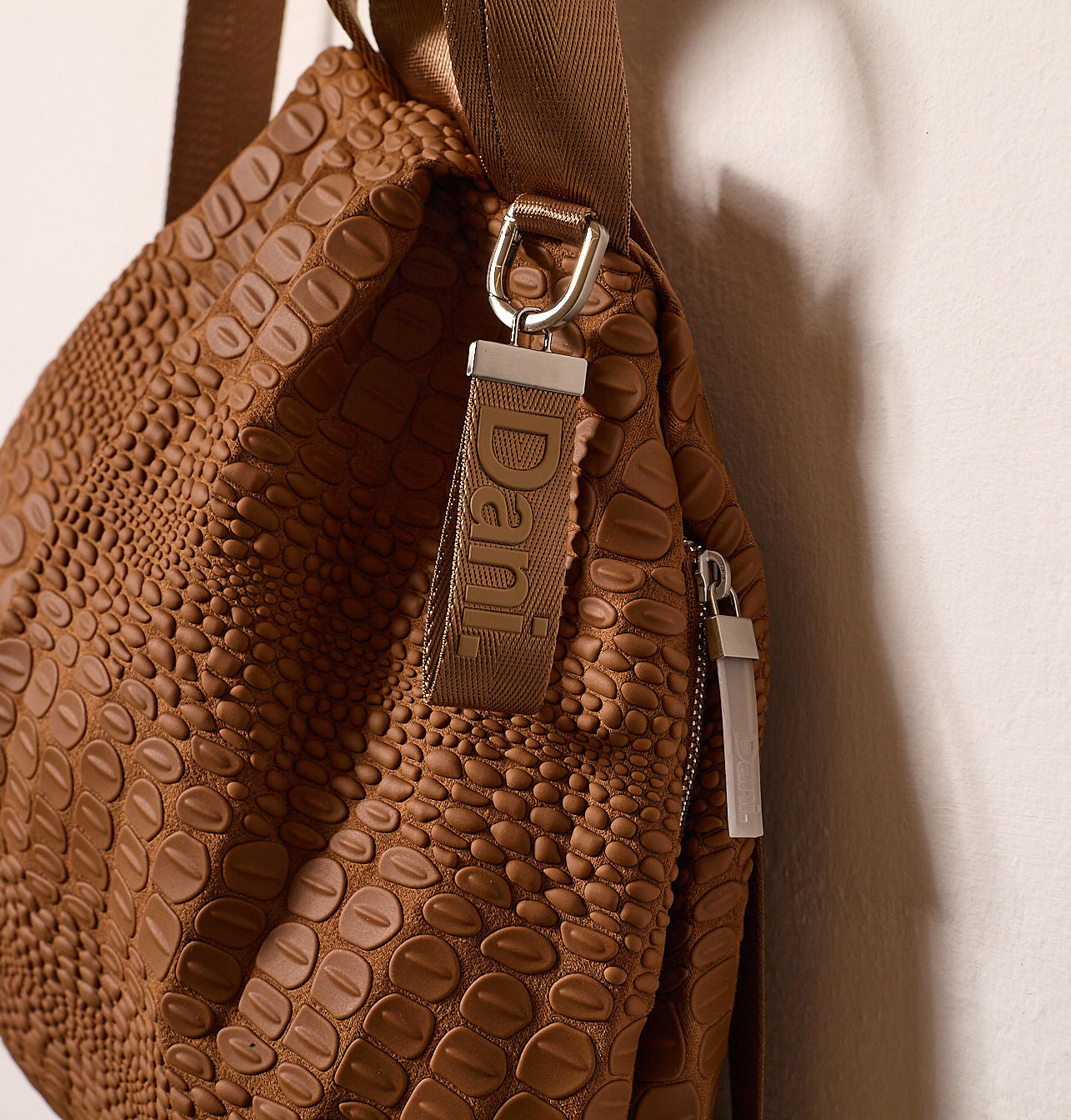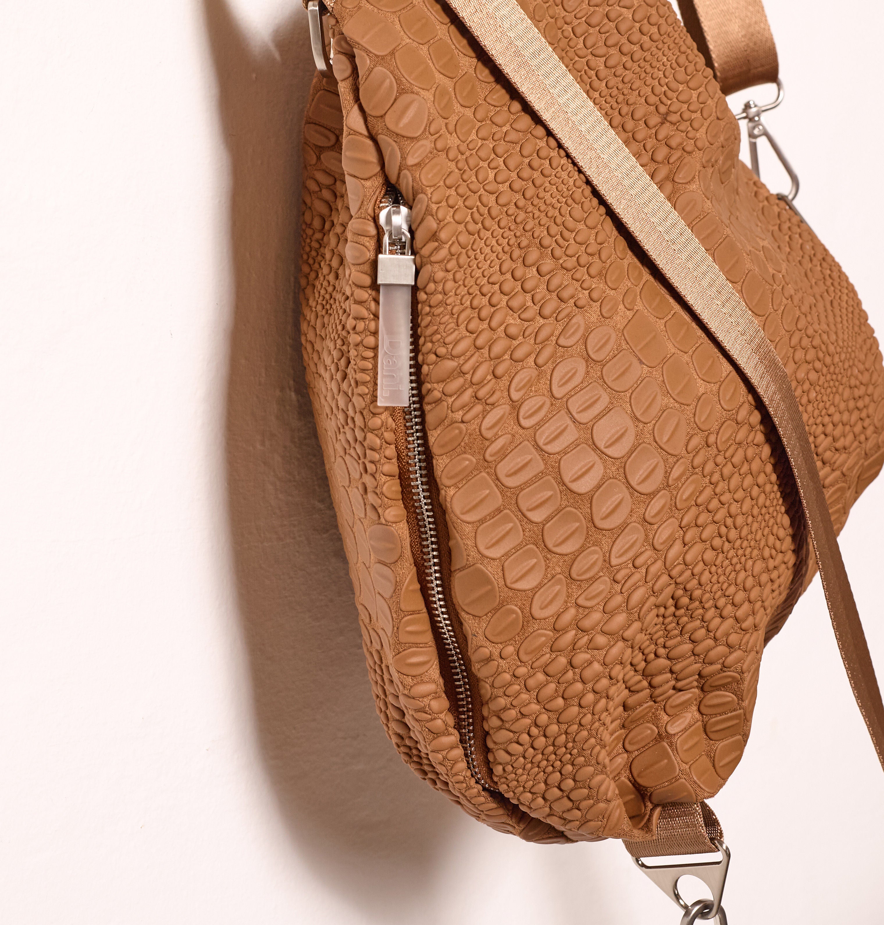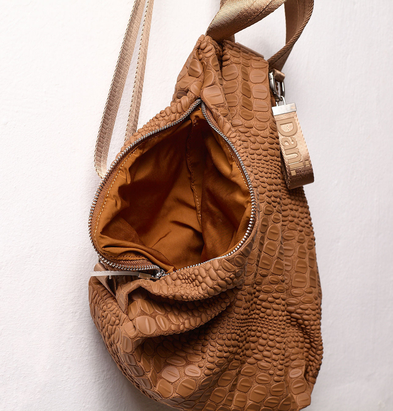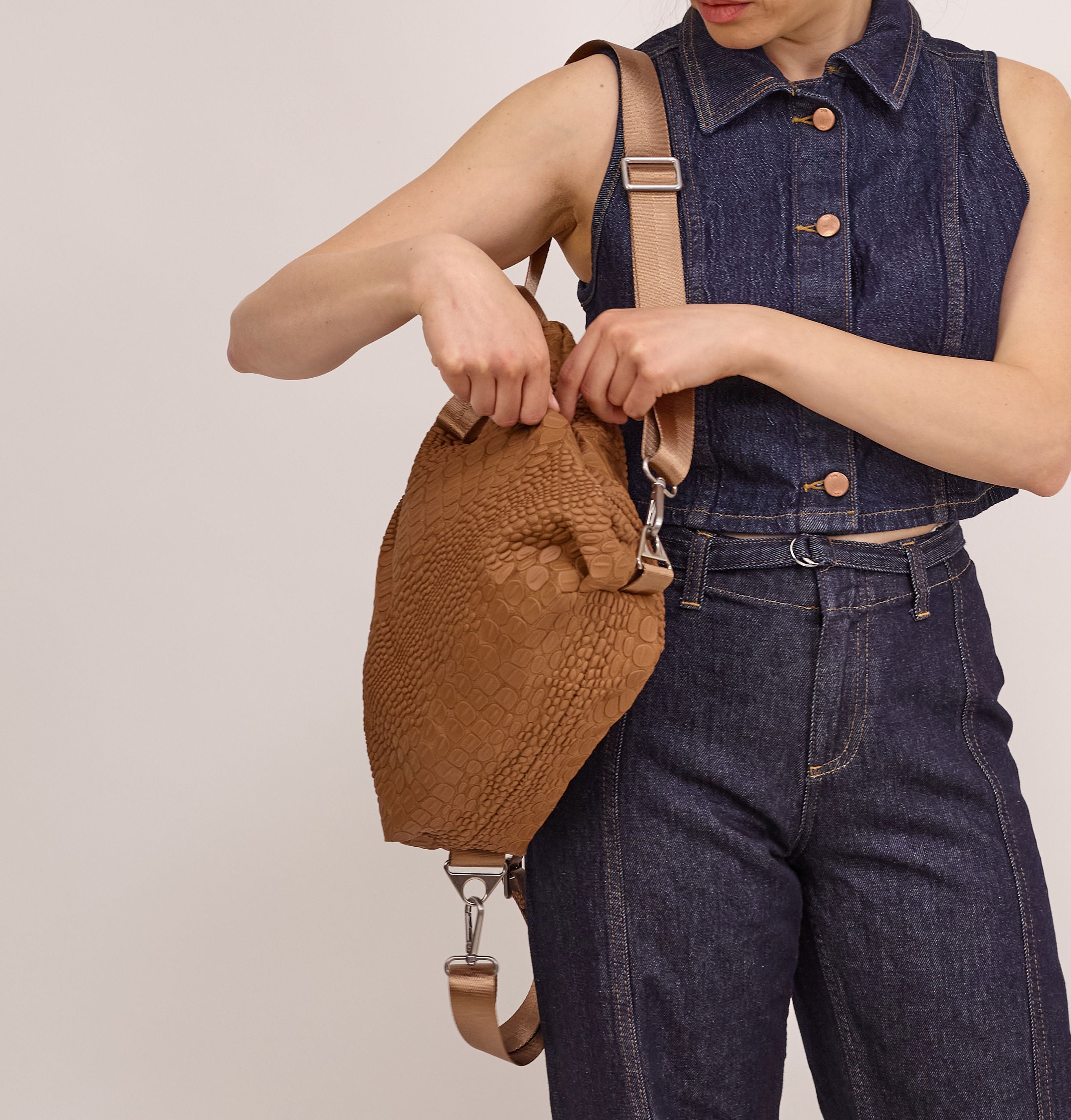 התיק גדול אך קל משקל, עשוי בד טבעוני בטקסטורת קרוק גומי, שהמבנה הייחודי שלה פותחה אצלנו בסטודיו. חיצונית קיימים שני כיסי צד, כיס גדול וקטן לאחסון נוח של חפצים שונים. לתיק רצועת יד קצרה ושתי רצועות רחבות לנשיאה על הגב. פריט סטייטמנט שישמש אותך הרבה בין אם ליומיום או לטיול לחו"ל.