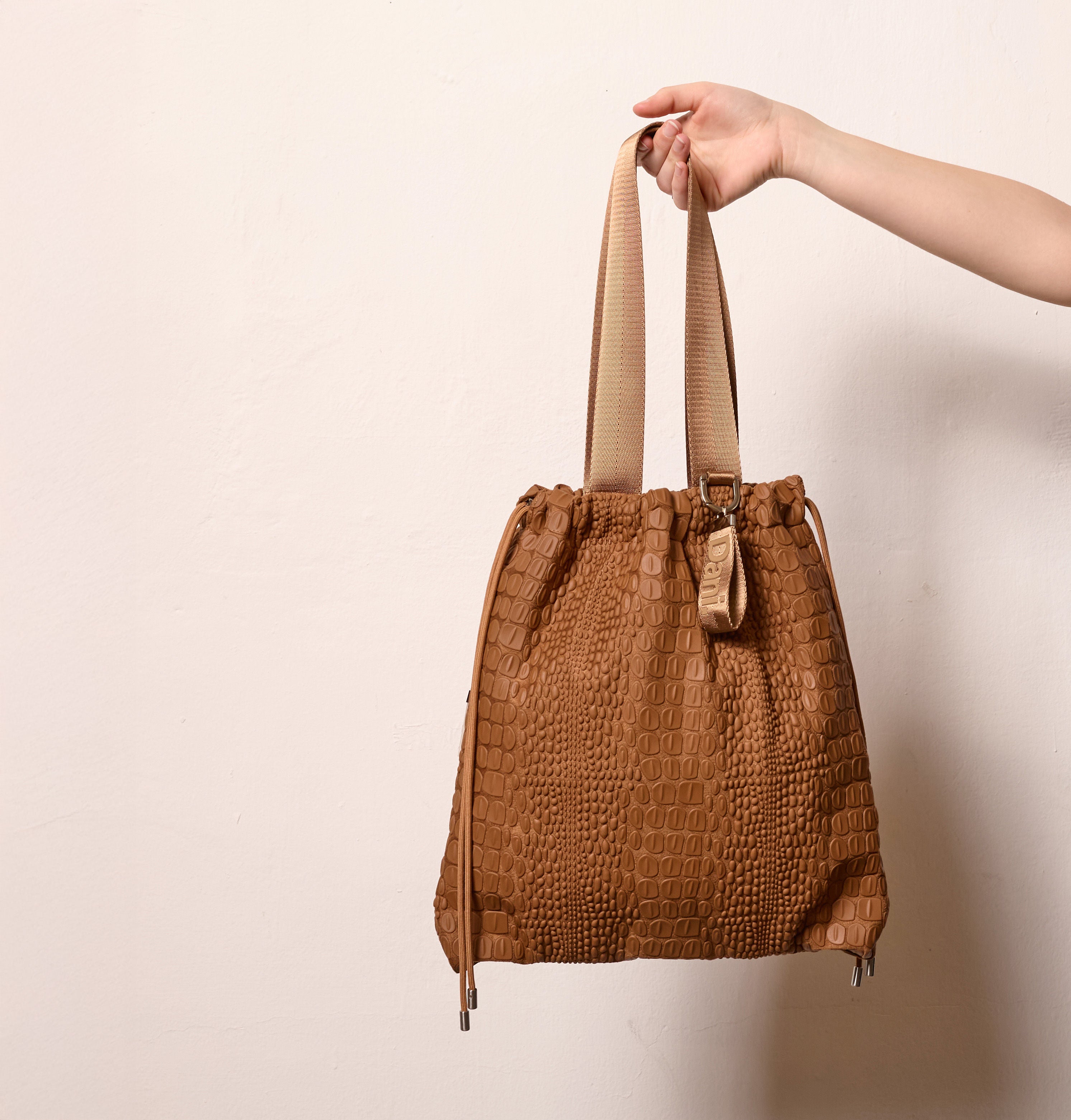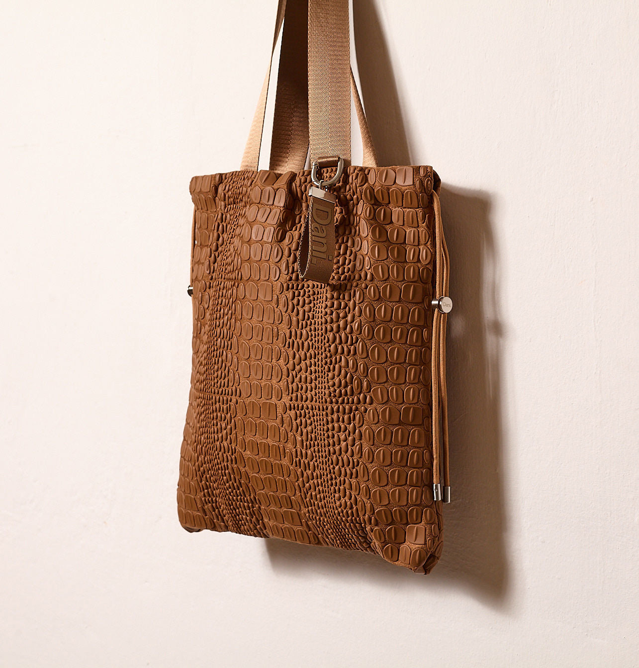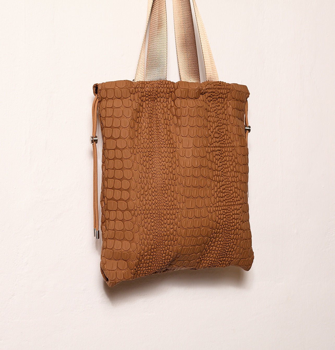 Tokyo Tote Bag הוא תיק שק גדול ומרווח, המעוצב עם שילוב בד טבעוני בטקסטורת קרוק גומי, טכניקה ייחודית שפותחה בסטודיו שלנו. מבנה פונקציונלי וחלוקה חכמה הכוללת תא מרכזי גדול ושני כיסי צד – אחד פתוח והשני עם רוכסן, מאפשרים אחסון מאורגן ונגיש לכל החפצים החשובים לאורך היום.