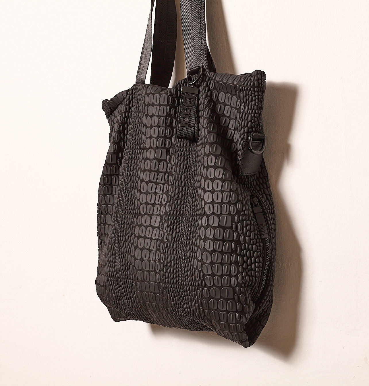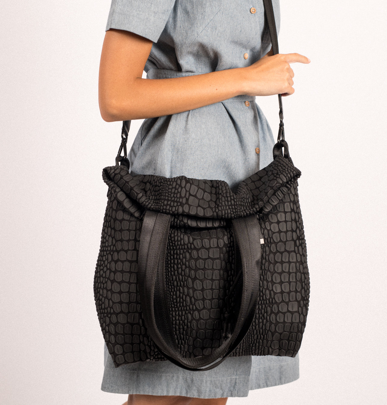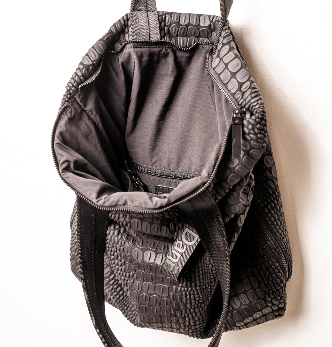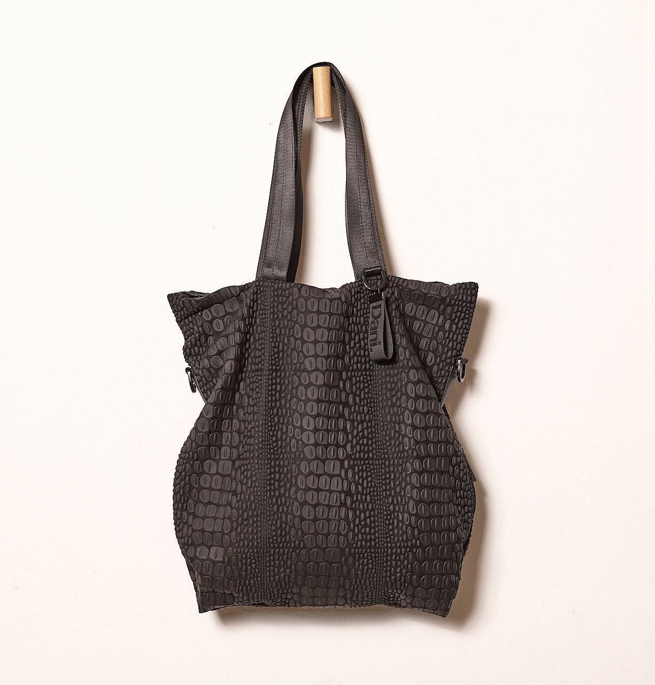 Tokyo Tote Bag תיק שק גדול עשוי בד טבעוני בטקסטורת קרוק גומי, שהמבנה הייחודי שלה פותחה אצלנו בסטודיו. פנימית חלוקתו היא לתא גדול אחד מרכזי ומרווח, עם שני כיסי צד, אחד פתוח והשני בסגירת רוכסן. לתיק שתי ידיות נשיאה רחבות ורצועה ארוכה המתאימה לשימוש כקרוס או על הכתף כתיק צד. פריט יומיומי שיקי ולא מתאמץ שיתאים לעבודה או אפילו ליוגה ופילאטיס.