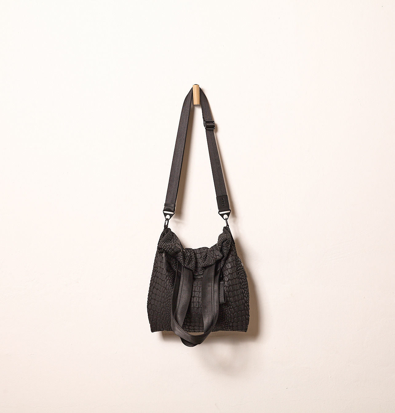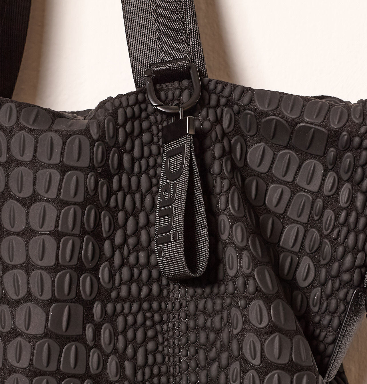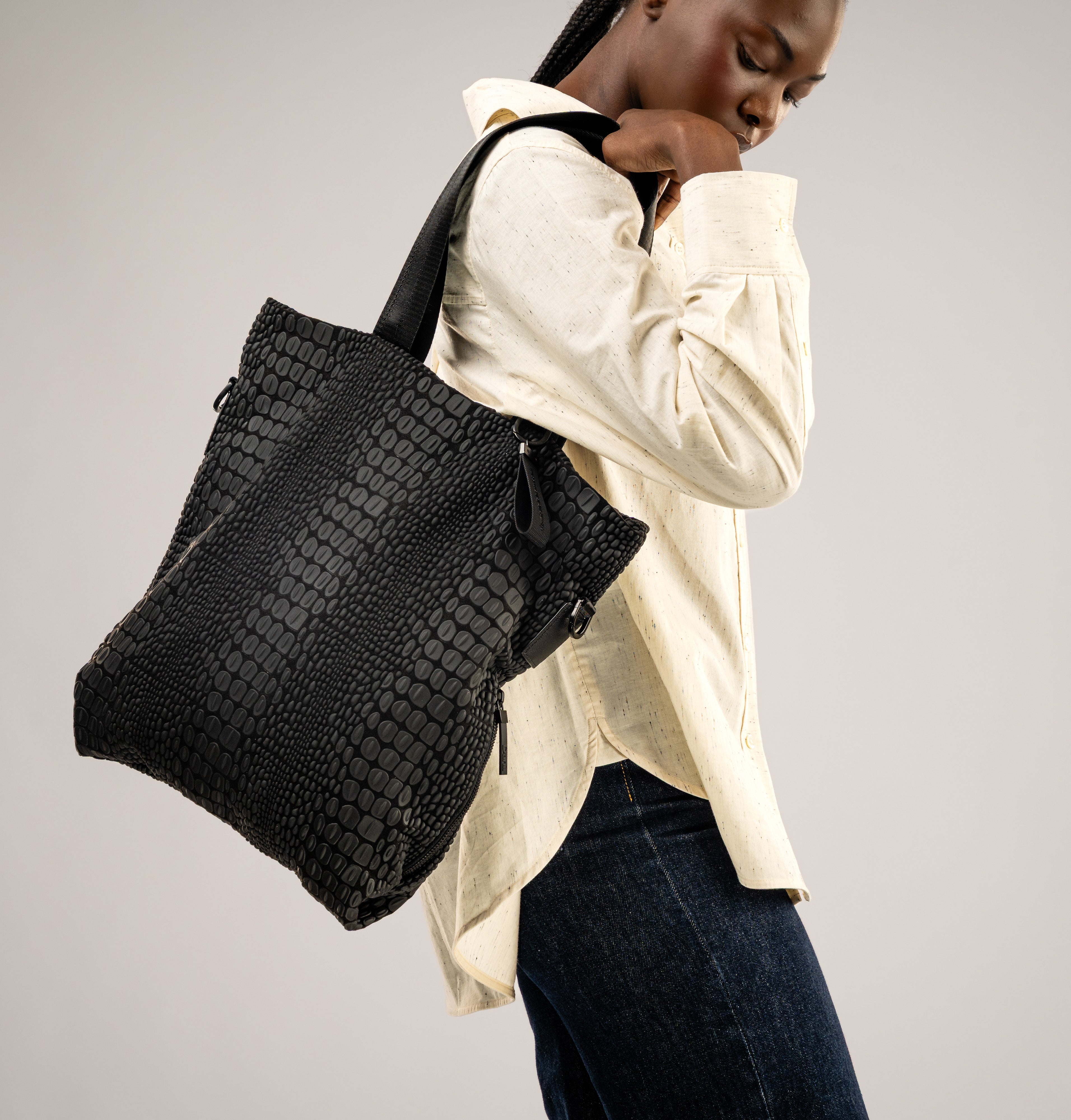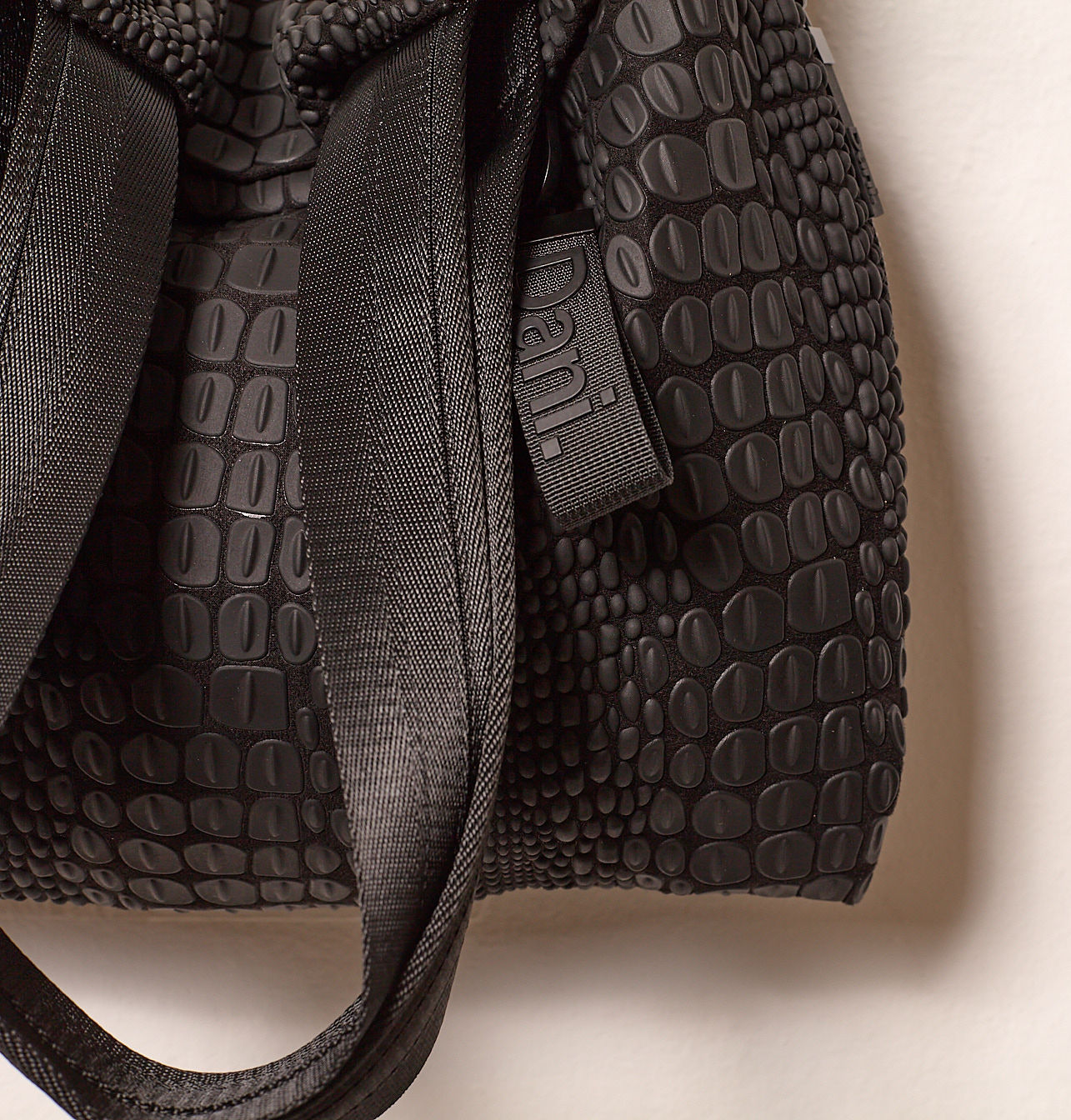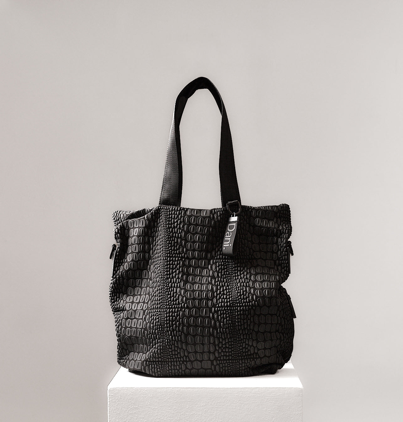 Tokyo Tote Bag תיק שק גדול עשוי בד טבעוני בטקסטורת קרוק גומי, שהמבנה הייחודי שלה פותחה אצלנו בסטודיו. פנימית חלוקתו היא לתא גדול אחד מרכזי ומרווח, עם שני כיסי צד, אחד פתוח והשני בסגירת רוכסן. לתיק שתי ידיות נשיאה רחבות ורצועה ארוכה המתאימה לשימוש כקרוס או על הכתף כתיק צד. פריט יומיומי שיקי ולא מתאמץ שיתאים לעבודה או אפילו ליוגה ופילאטיס.