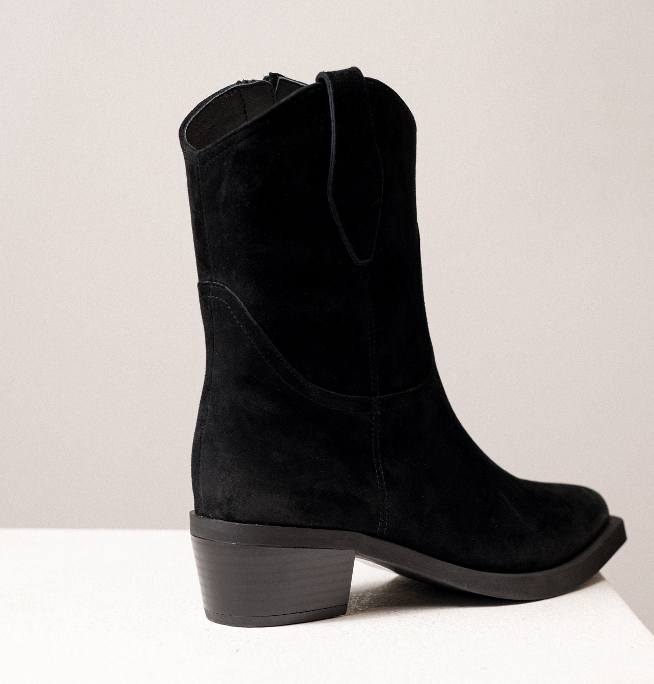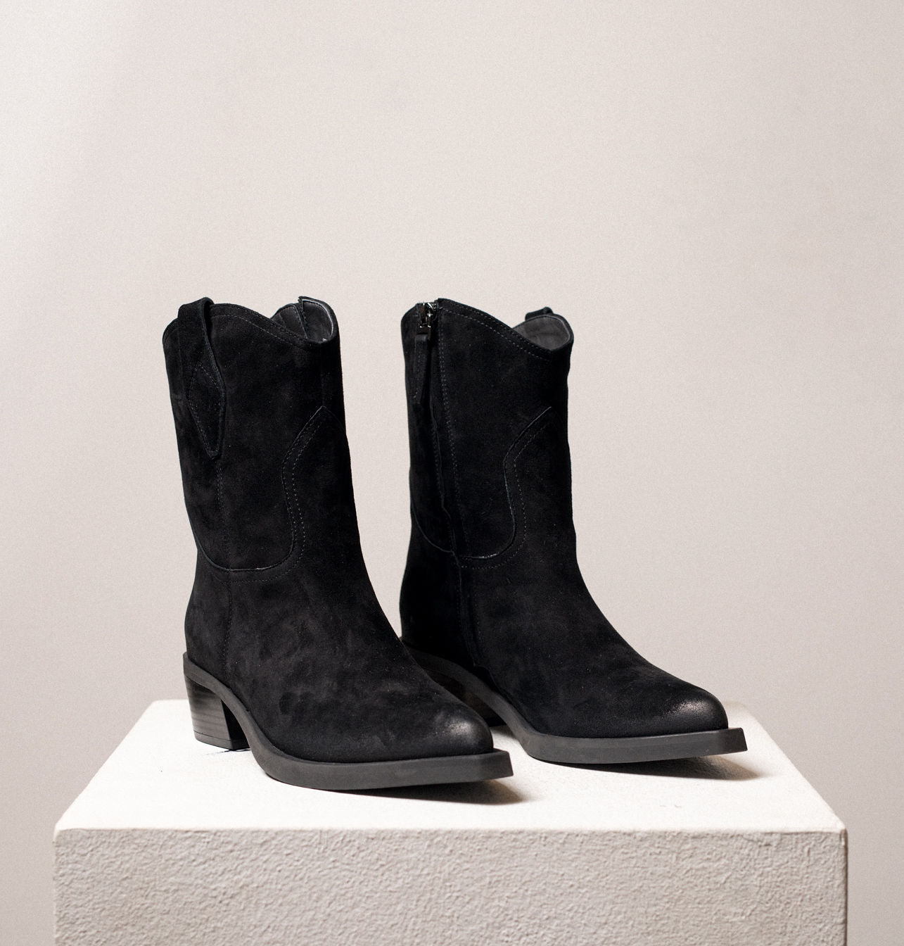 מגפוני זמש מדגם Montana מעוצבים בסגנון מגפי בוקרים עם הטוויסט האלגנטי של דניאלה להבי. למגפיים חרטום מחודד, תיפורים עדינים, רוכסן צדי ועקבים נמוכים משופעים.