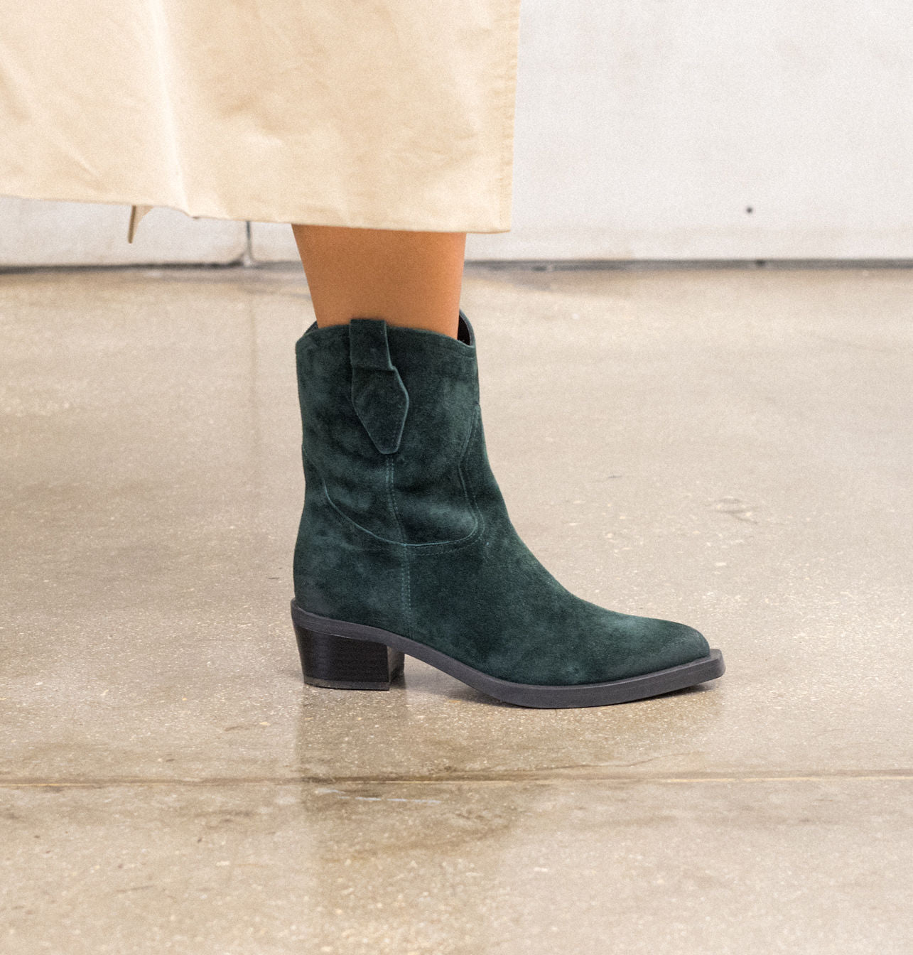 מגפוני זמש מדגם Montana מעוצבים בסגנון מגפי בוקרים עם הטוויסט האלגנטי של דניאלה להבי. למגפיים חרטום מחודד, תיפורים עדינים, רוכסן צדי ועקבים נמוכים משופעים.