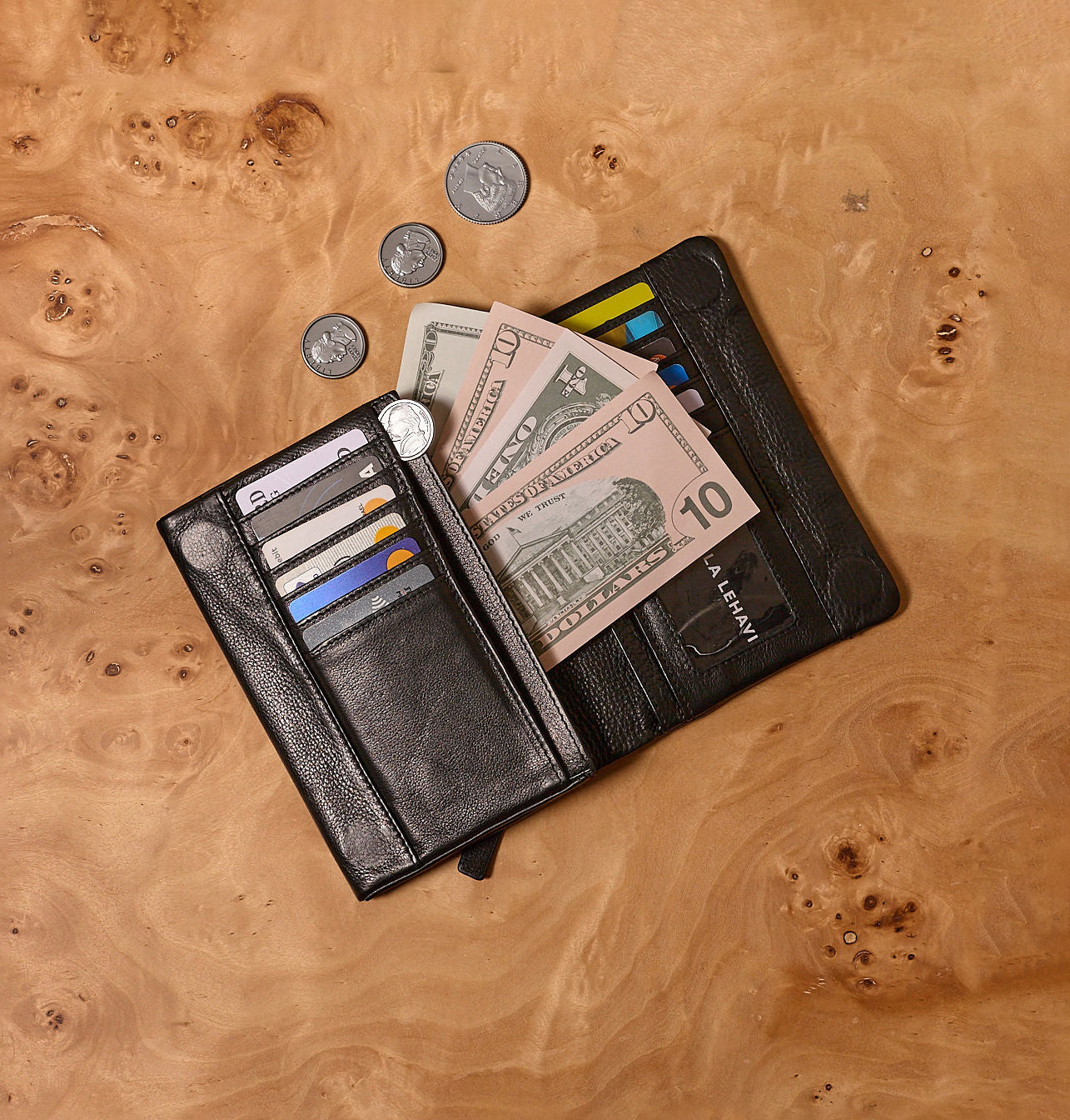 Inside, you’ll find smartly arranged pockets and sections for bills, cards, coins, and other small essentials – so you can stay organized with ease.