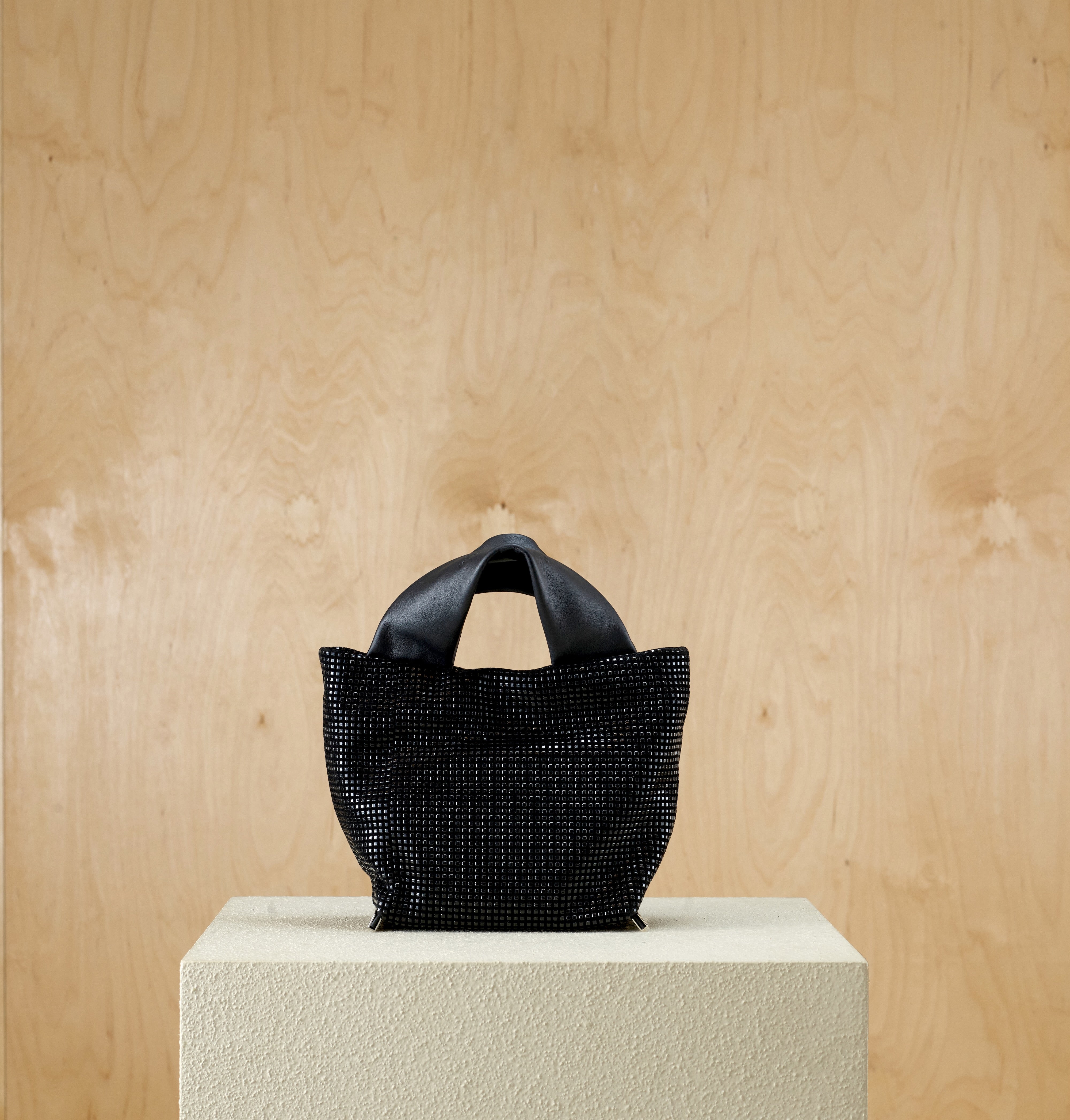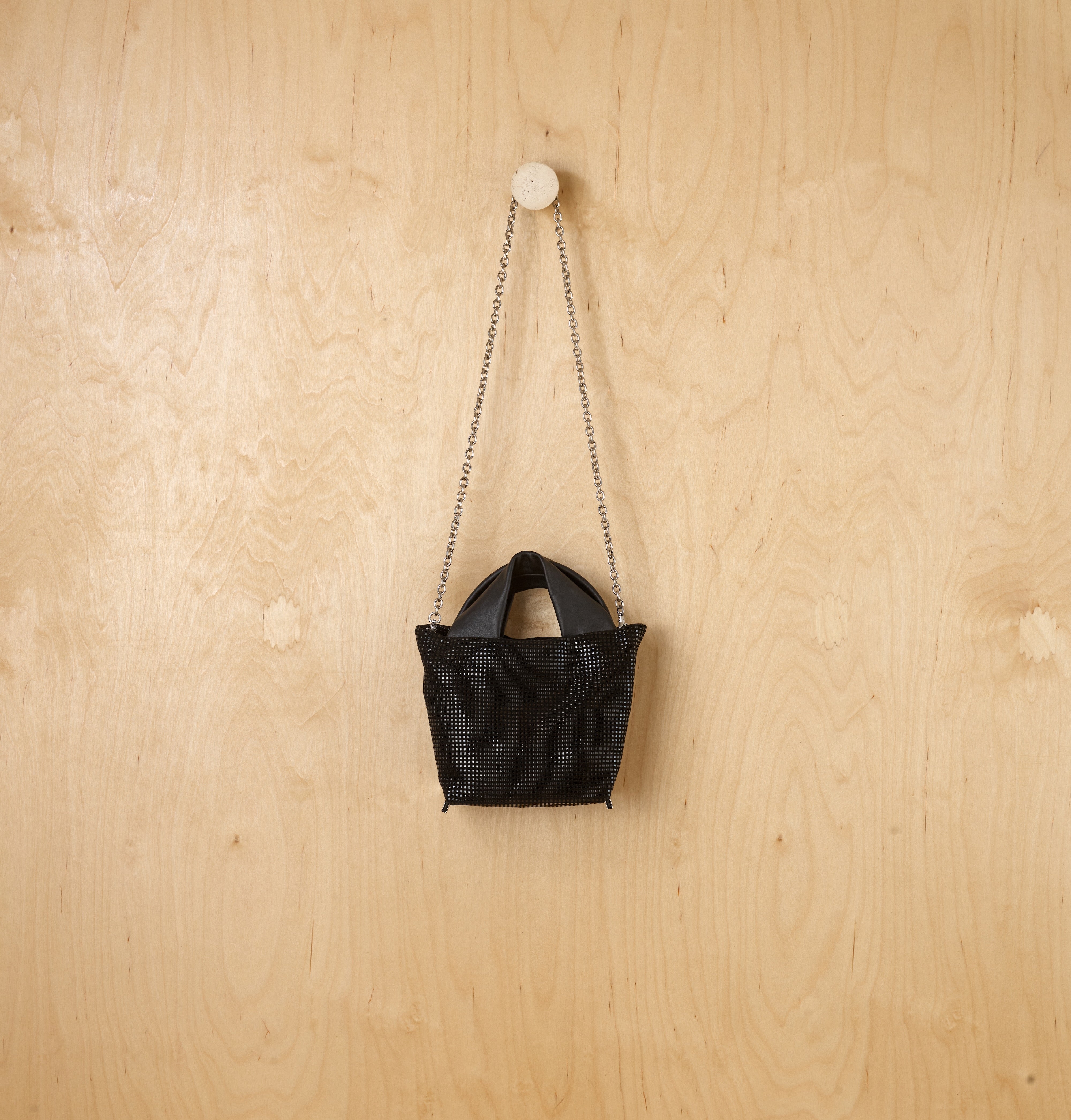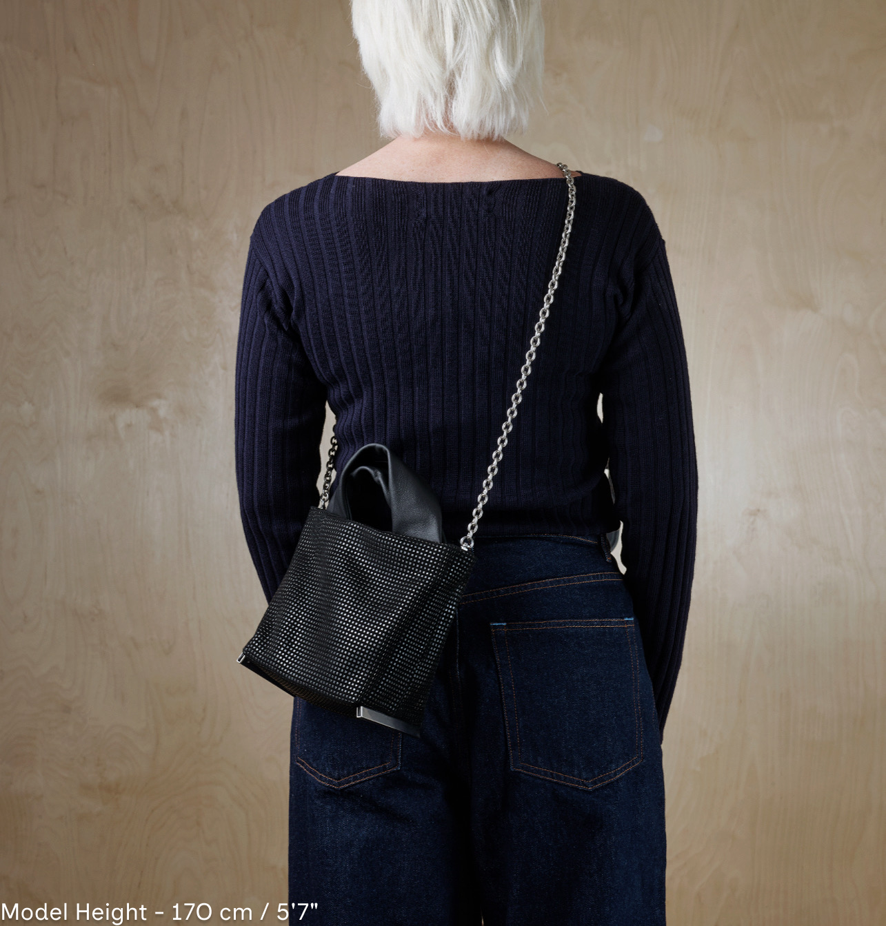 A bag built around a soft shape that maintains a clean, precise silhouette. The handles offer a natural, relaxed grip, while our signature metal feet add a subtle industrial touch that highlights the meeting point between softness and strength. It carries an elegance and presence that feels understated yet clear. A quiet classic. The slim chain allows for crossbody wear, while the handles offer a closer carry option both emphasizing its ability to transition effortlessly into a refined evening look.