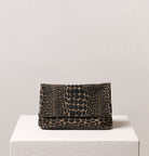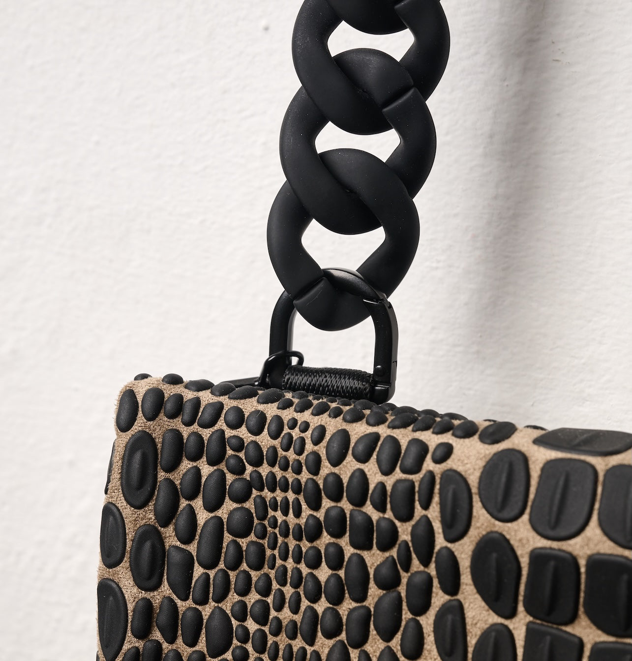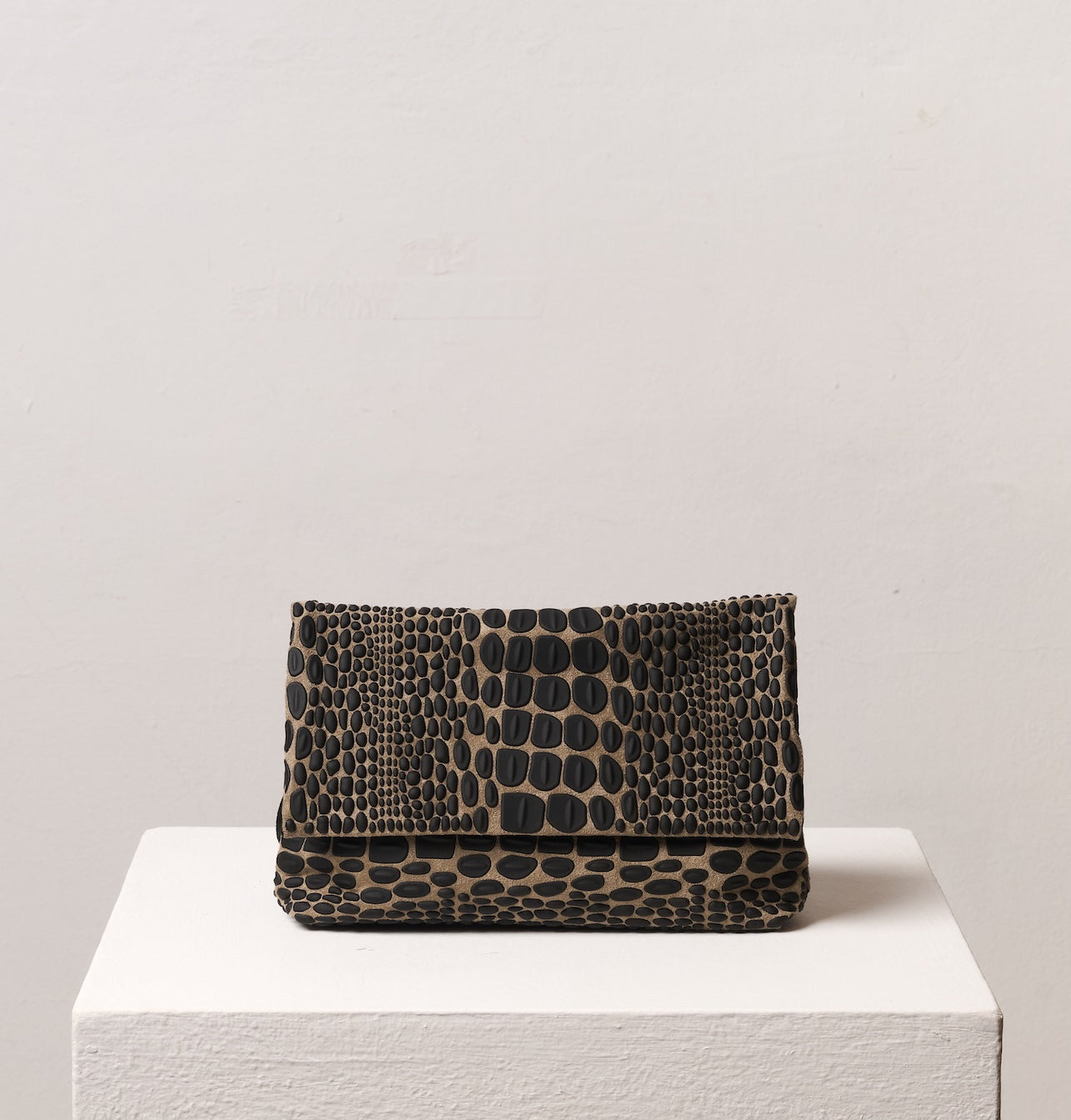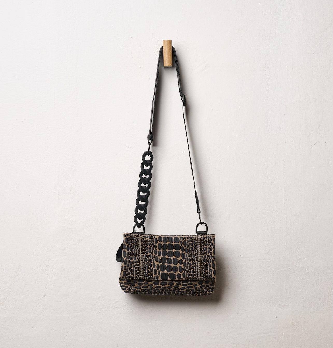 A bag with a clean silhouette and a croc texture developed in our studio, creating a precise balance between softness and defined character. The folded magnetic closure together with the chain detail adds a modern, refined look.