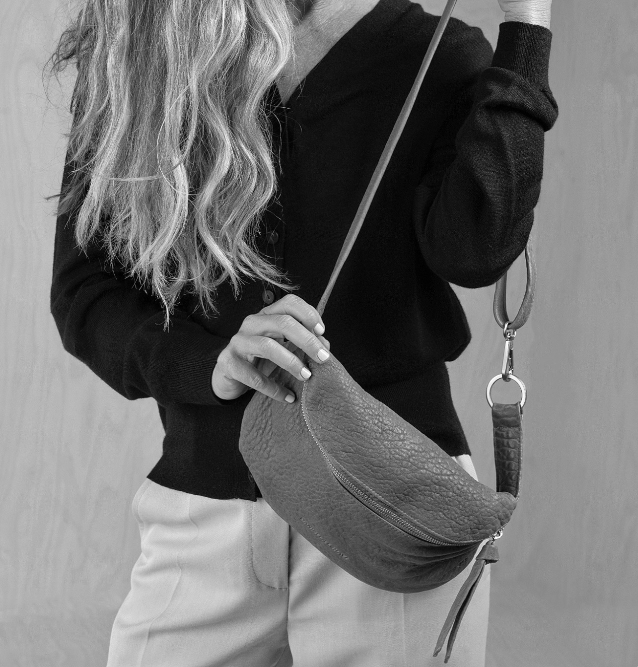 A classic, familiar belt bag with a soft structure that sits close to the body and feels natural in motion. In this collection, it appears in a specially selected leather that adds depth, texture, and a quiet character to the overall look. Its size allows you to carry daily essentials with ease, while the lightweight wear makes it an intuitive, comfortable everyday piece.