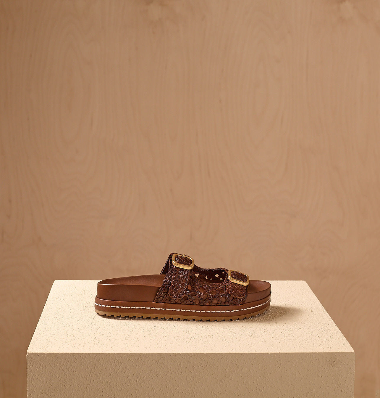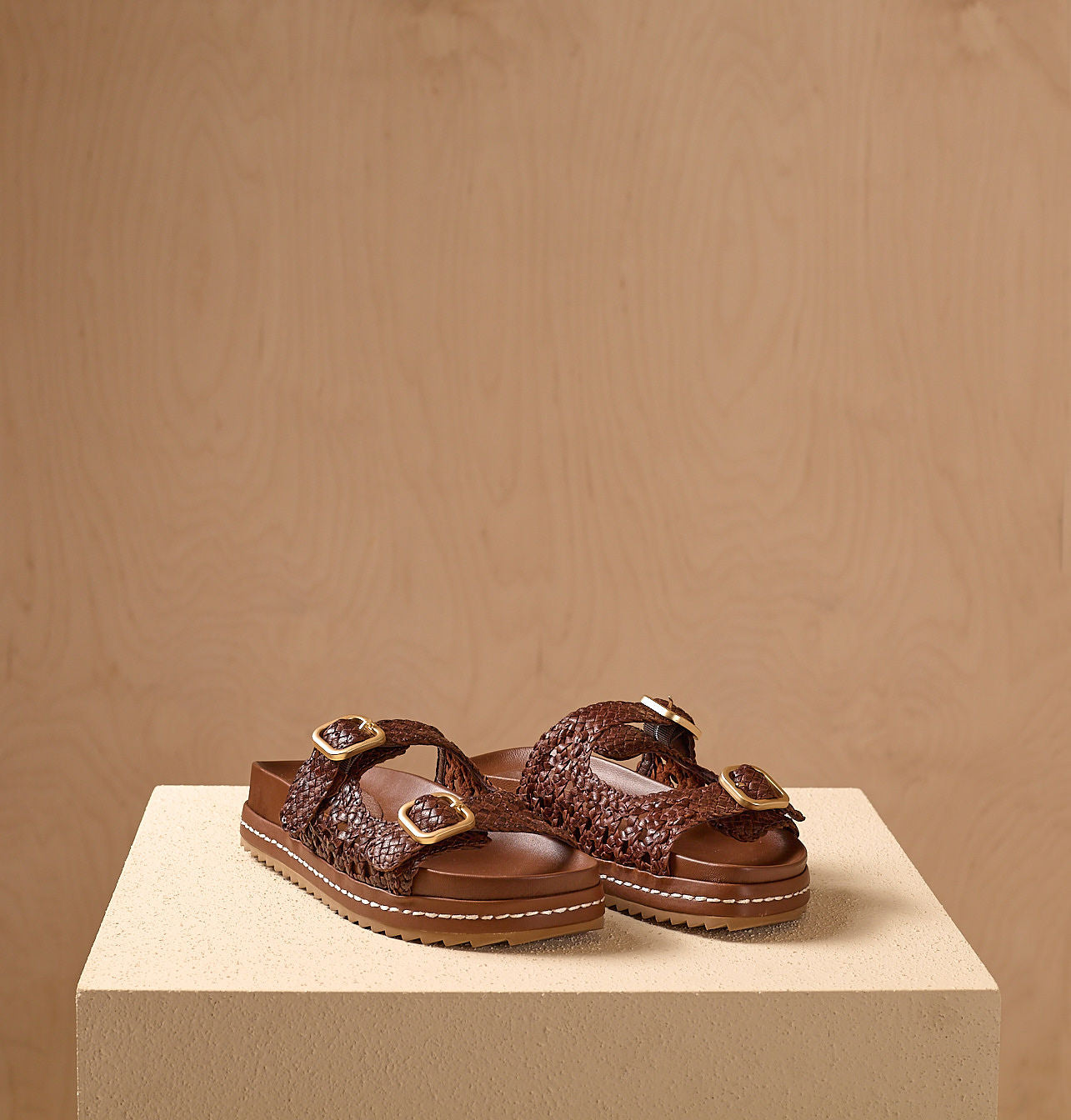 Mallis Braided Slides feature a unique braided design with high-quality leather straps woven together. The wide straps with buckle closure provide a customizable fit and optimal support for the foot. Combining contemporary design, traditional craftsmanship, and summery colors, these slides elevate any look while offering a feeling of lightness with every step.