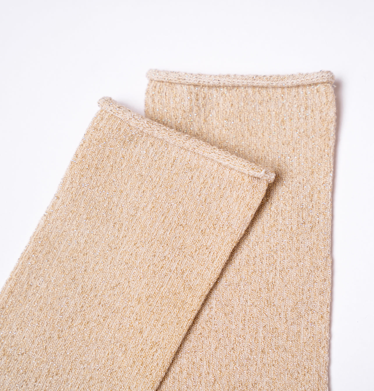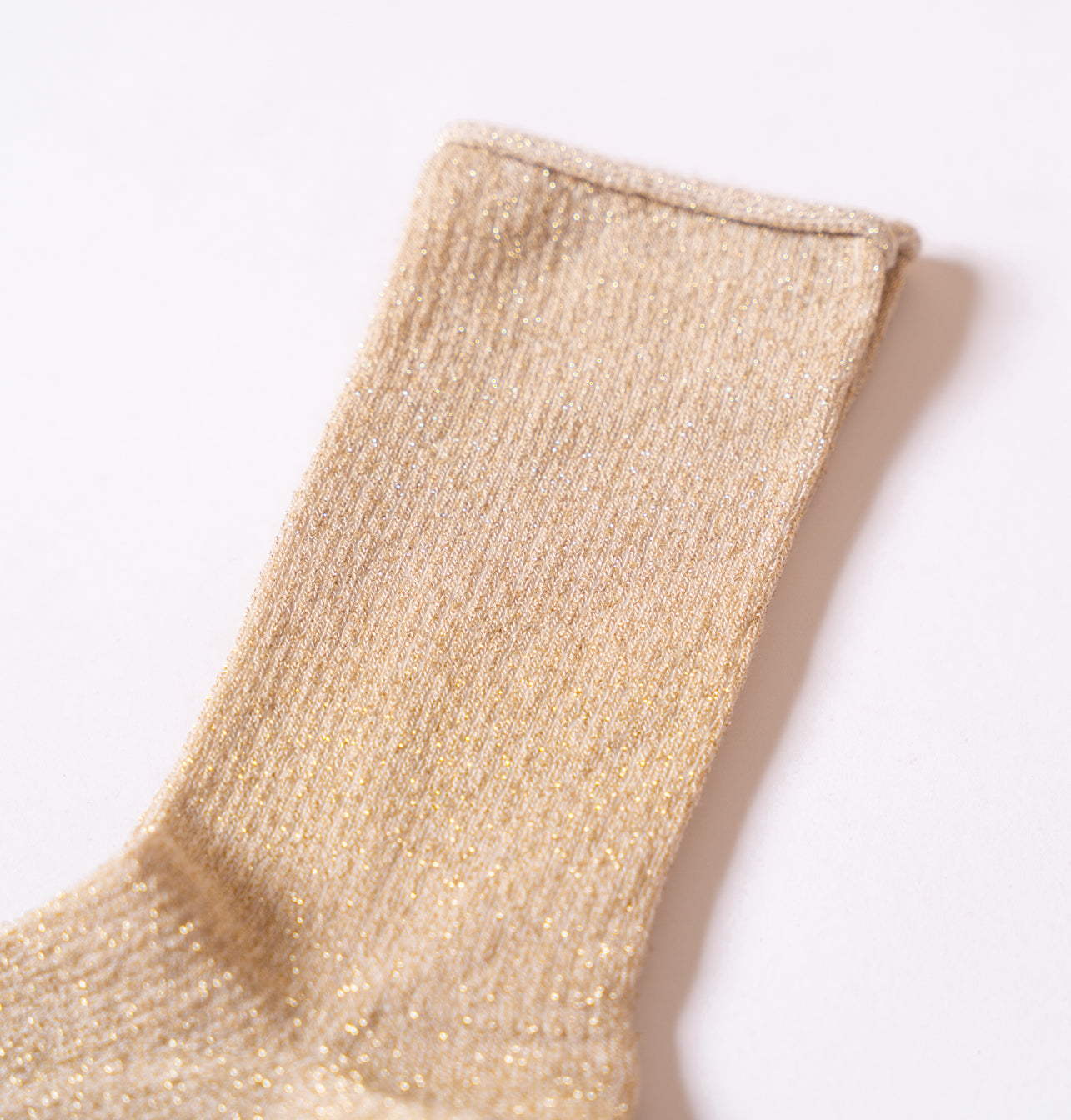 The shimmering lurex socks are made primarily from lyocell bamboo fiber, a completely natural and ecological fiber. Lyocell is a soft and lightweight material that has absorbent properties, while being extremely durable. In a way, it is the perfect material. In terms of style, there is a fold instead of the classic border for a more elegant touch. The stretchy side allows the socks to fit the shape of all feet, large and small.