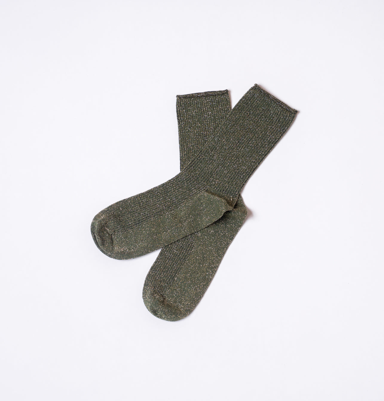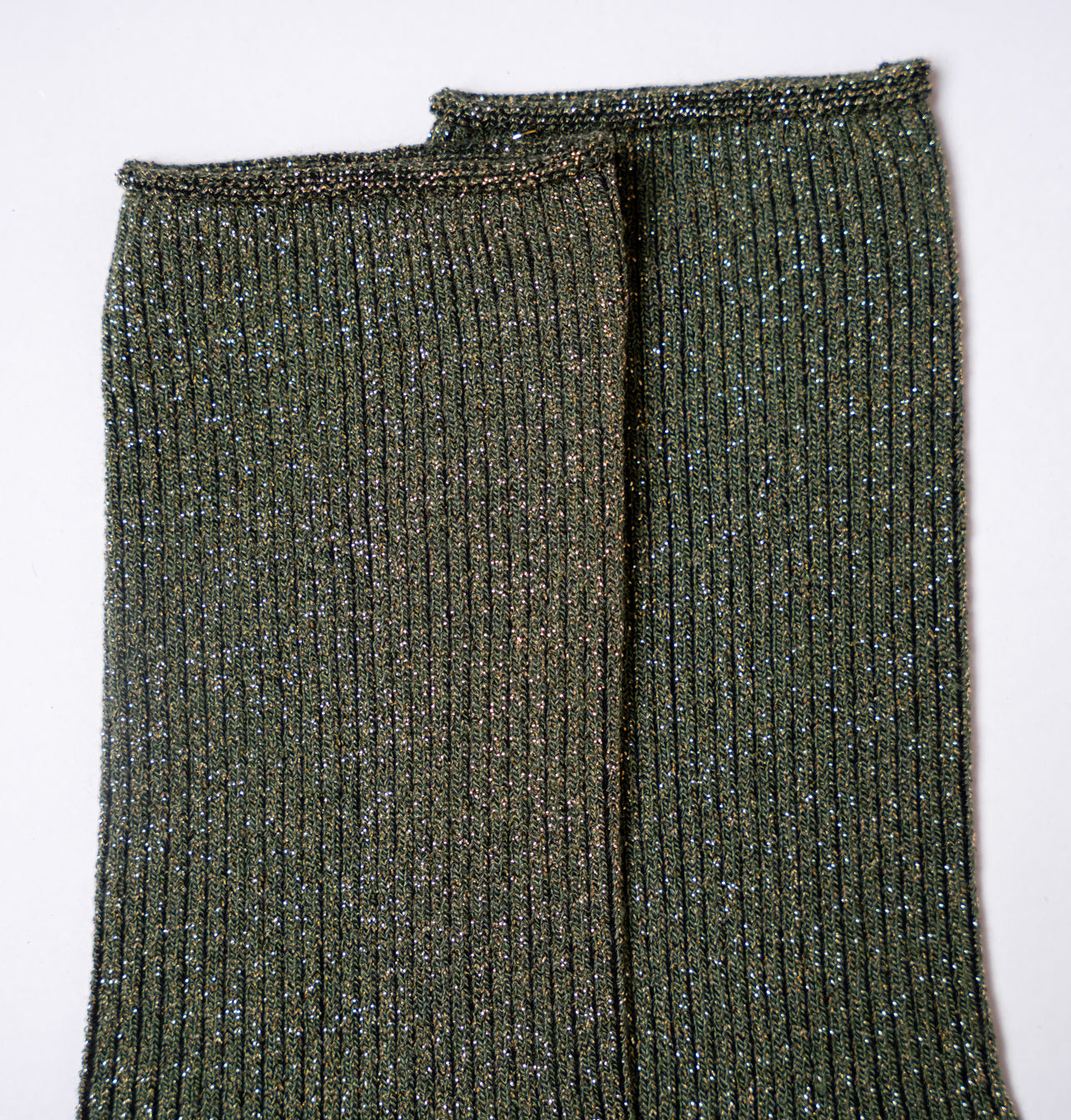 The shimmering lurex socks are made primarily from lyocell bamboo fiber, a completely natural and ecological fiber. Lyocell is a soft and lightweight material that has absorbent properties, while being extremely durable. In a way, it is the perfect material. In terms of style, there is a fold instead of the classic border for a more elegant touch. The stretchy side allows the socks to fit the shape of all feet, large and small.