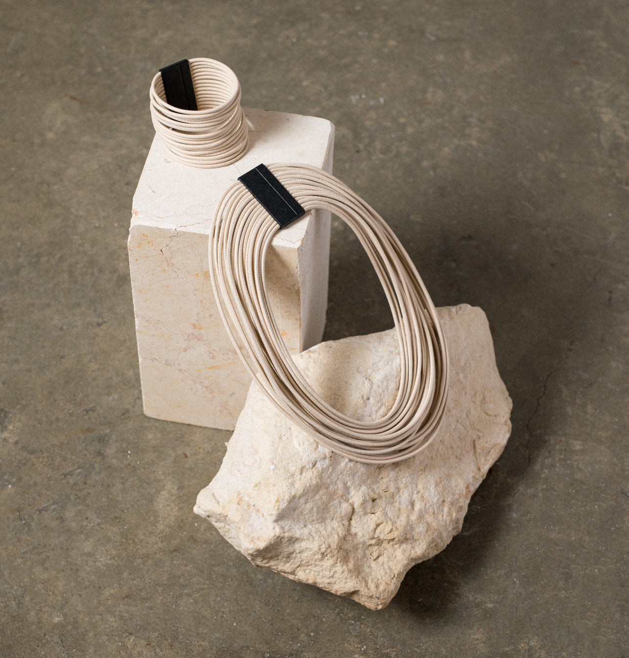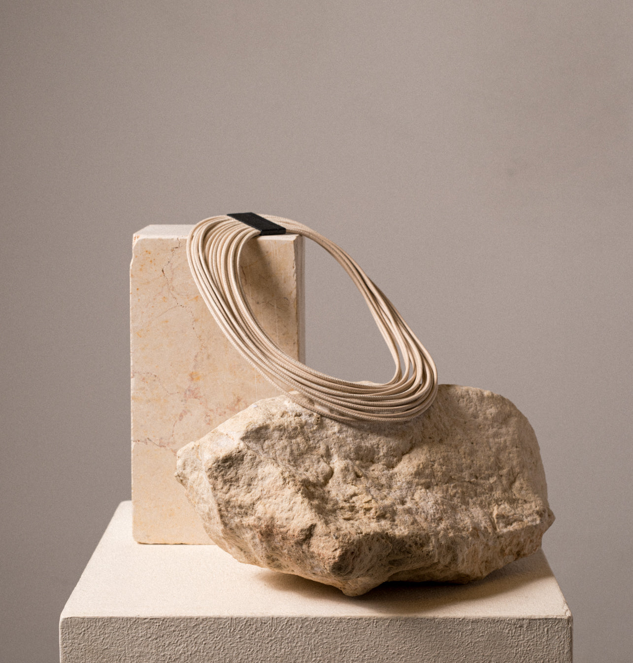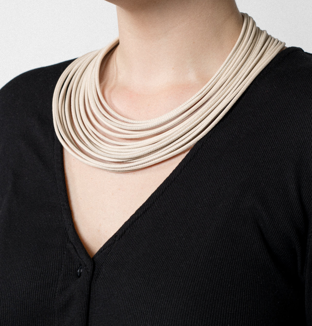 Rosalba Galati 's Pelle necklace is a magnificent work of art made of quality leather. It is the perfect addition to any look. With a stylish look and unusual shape, this necklace is sure to be a topic of conversation.