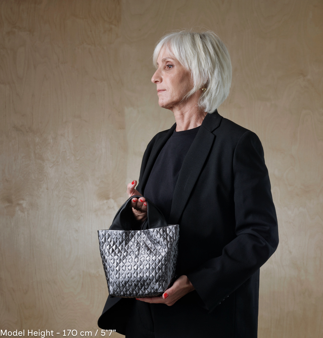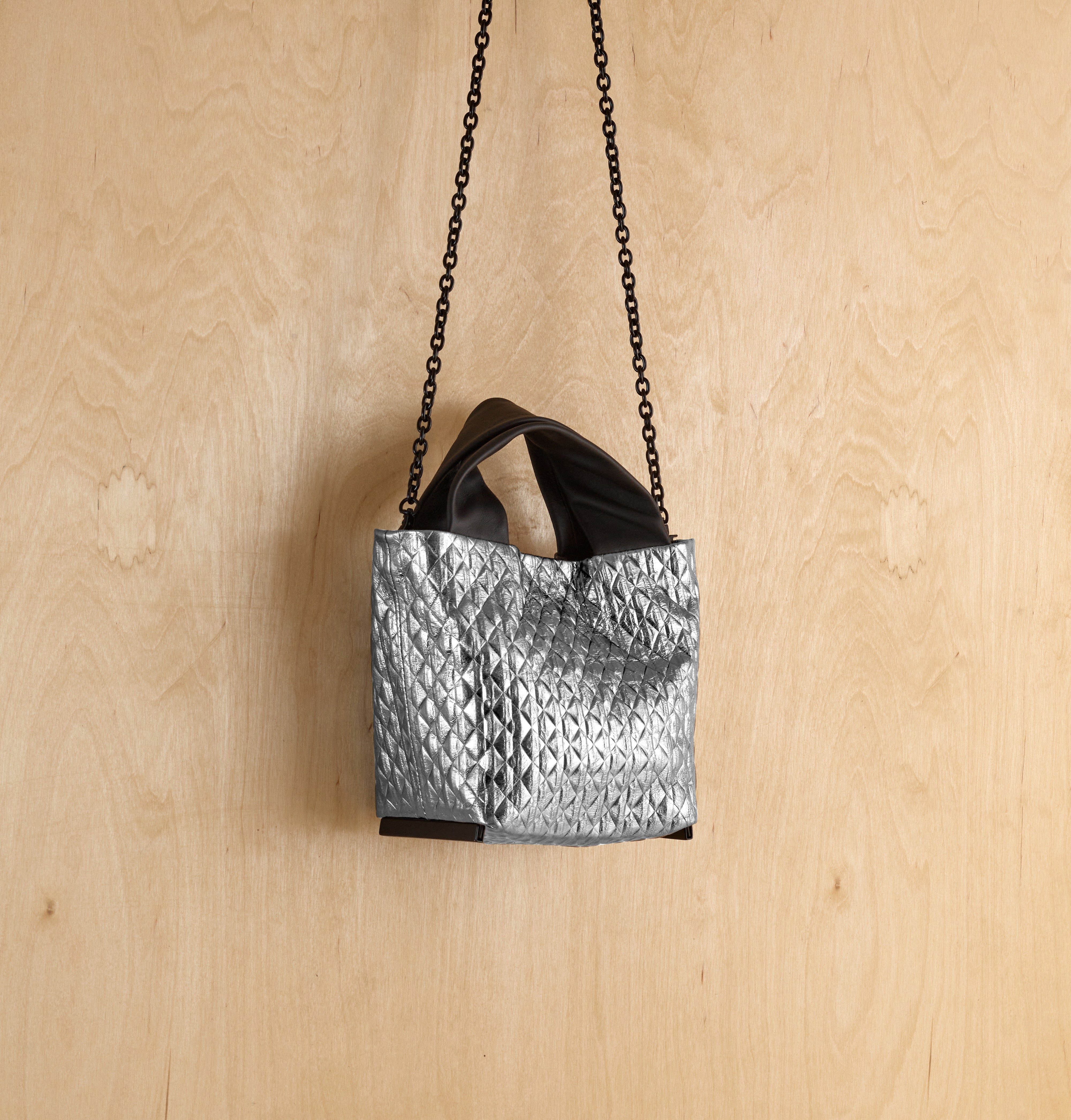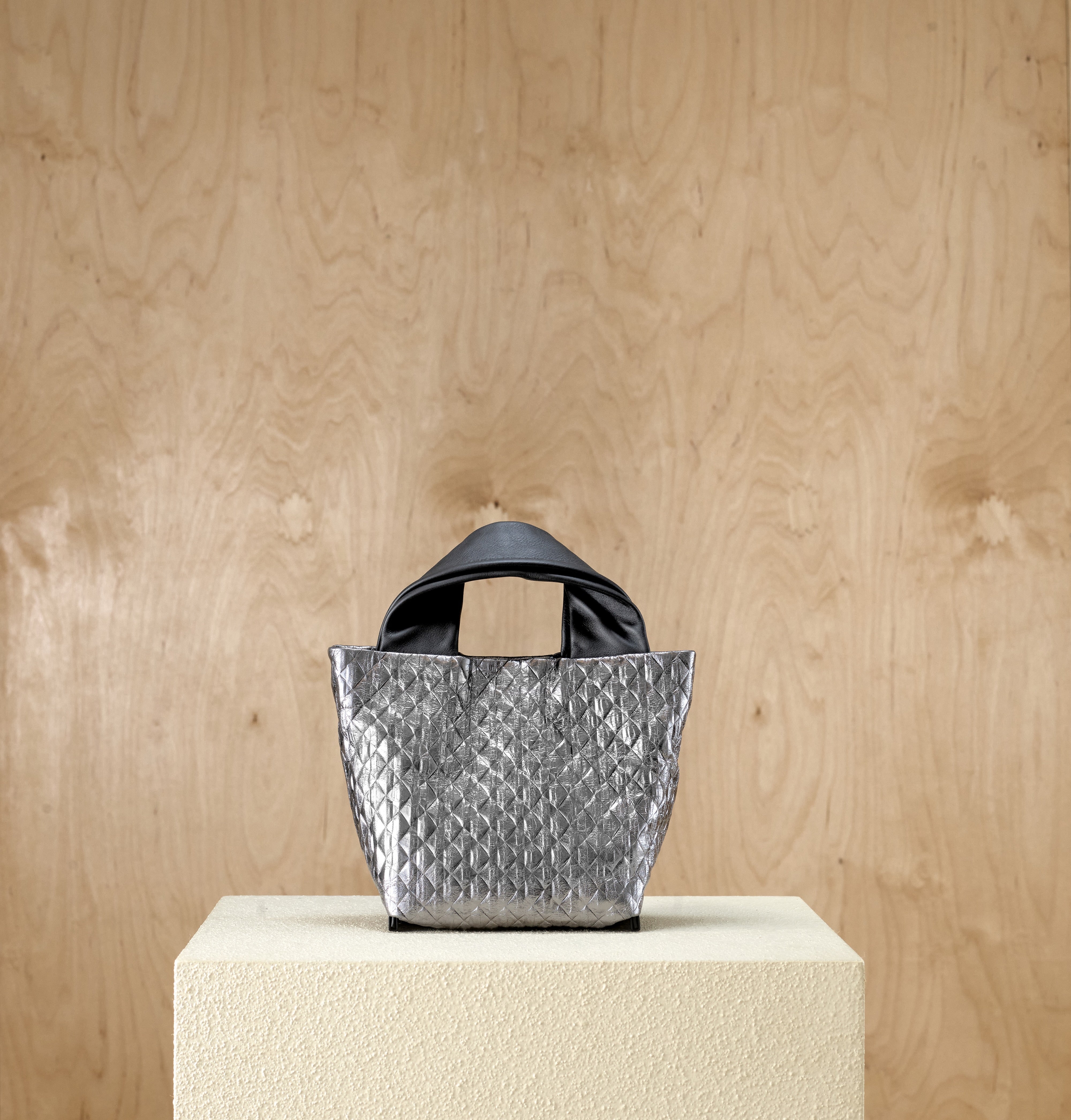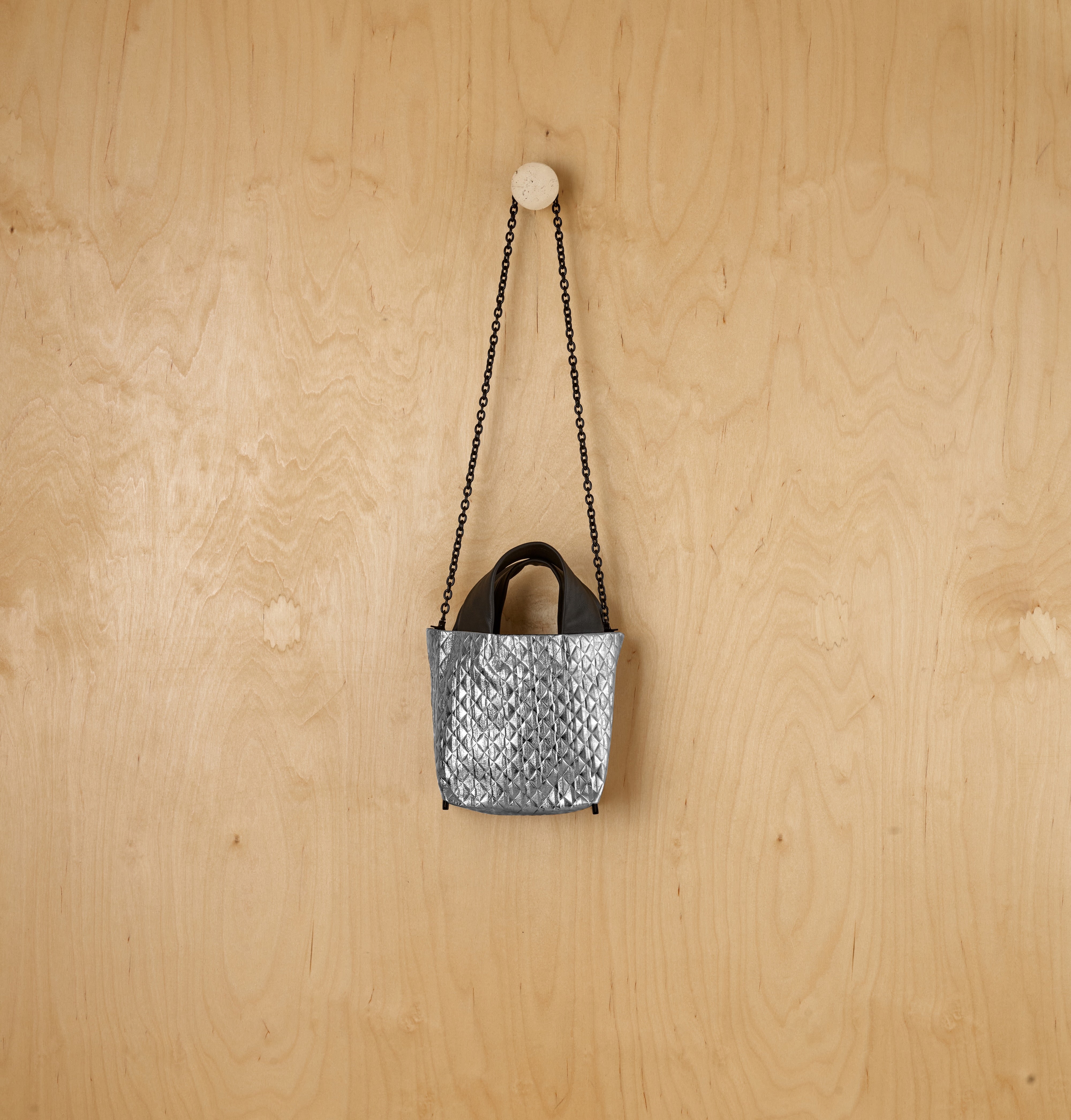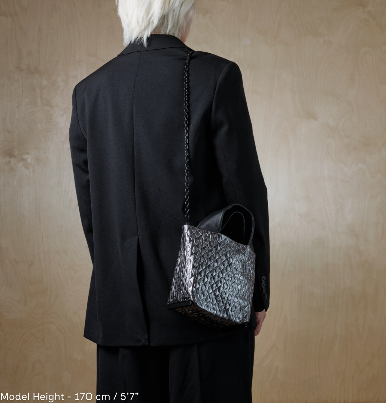A bag built around a soft shape that maintains a clean, precise silhouette. The handles offer a natural, relaxed grip, while our signature metal feet add a subtle industrial touch that highlights the meeting point between softness and strength. It carries an elegance and presence that feels understated yet clear. A quiet classic. The slim chain allows for crossbody wear, while the handles offer a closer carry option both emphasizing its ability to transition effortlessly into a refined evening look.