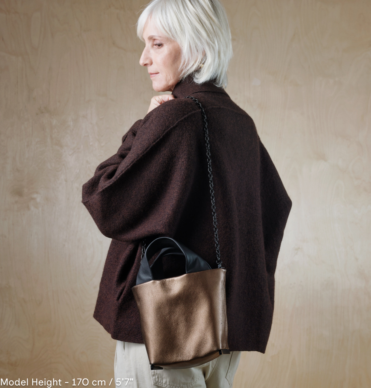 A bag built around a soft shape that maintains a clean, precise silhouette. The handles offer a natural, relaxed grip, while our signature metal feet add a subtle industrial touch that highlights the meeting point between softness and strength. It carries an elegance and presence that feels understated yet clear. A quiet classic. The slim chain allows for crossbody wear, while the handles offer a closer carry option both emphasizing its ability to transition effortlessly into a refined evening look.