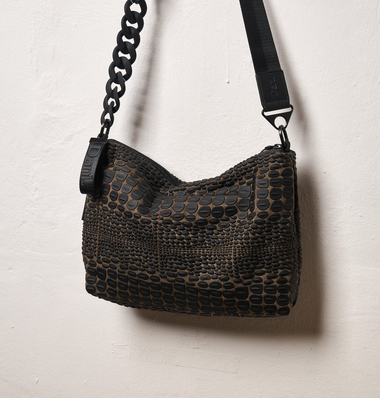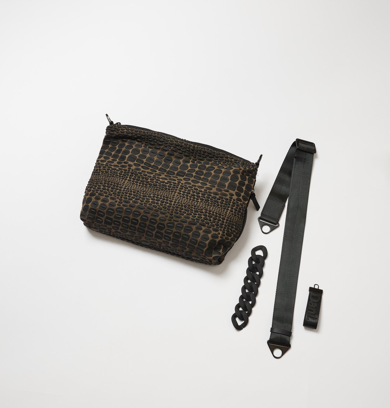 A rectangular bag with a croco texture developed in our studio. Its convenient size makes it ideal for everyday use, offering a well-organized layout. The internal compartments provide maximum comfort and easy access, while both the strap and the chain can be detached to easily adapt the look to your style or occasion.