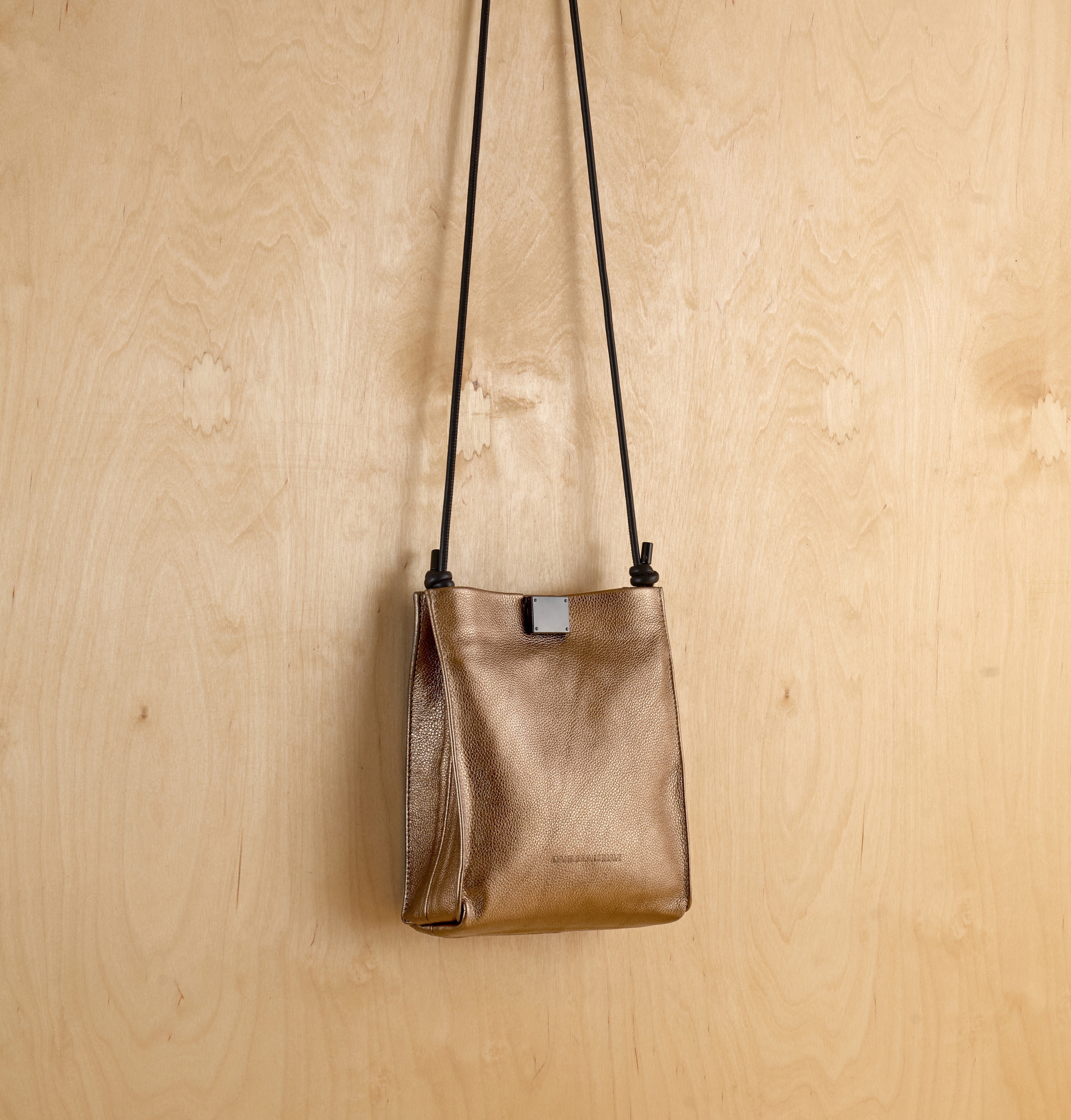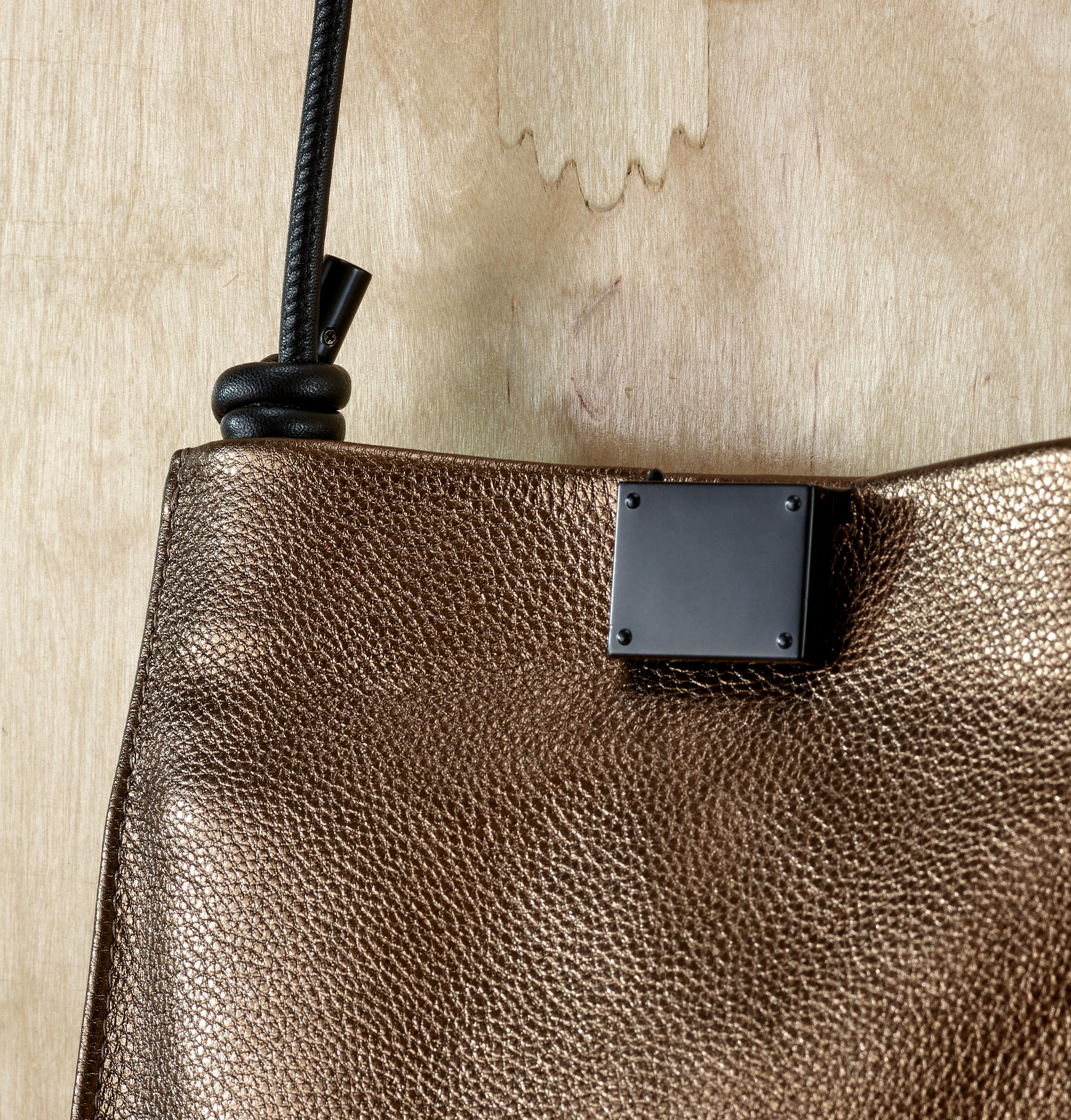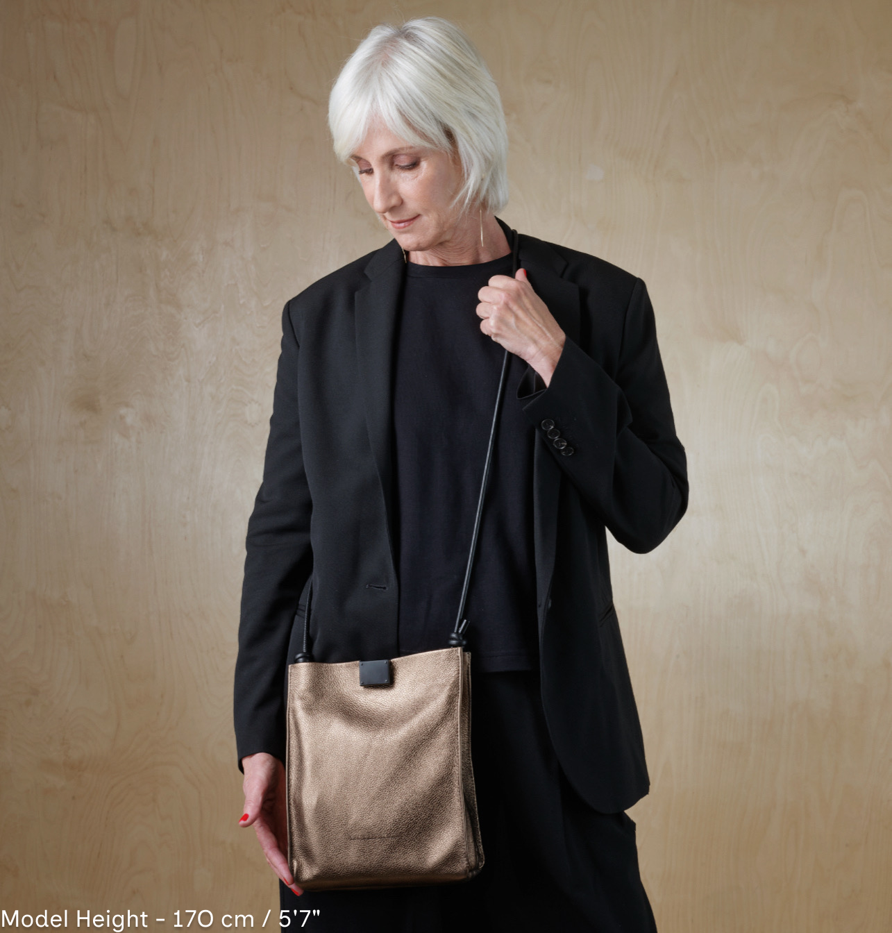 A clean, modern crossbody bag with a balanced silhouette that sits naturally against the body. Its uniquely textured leathers and black metal hardware give it a distinct, contemporary character. The contrast between the materials creates a precise meeting point between softness and an industrial edge, adding depth without overwhelming the design. The strap offers comfortable carry, and the structure suits anyone looking for a piece that expresses order and precision while remaining calm and minimal. The black hardware adds a subtle, refined line that sharpens the overall look.
