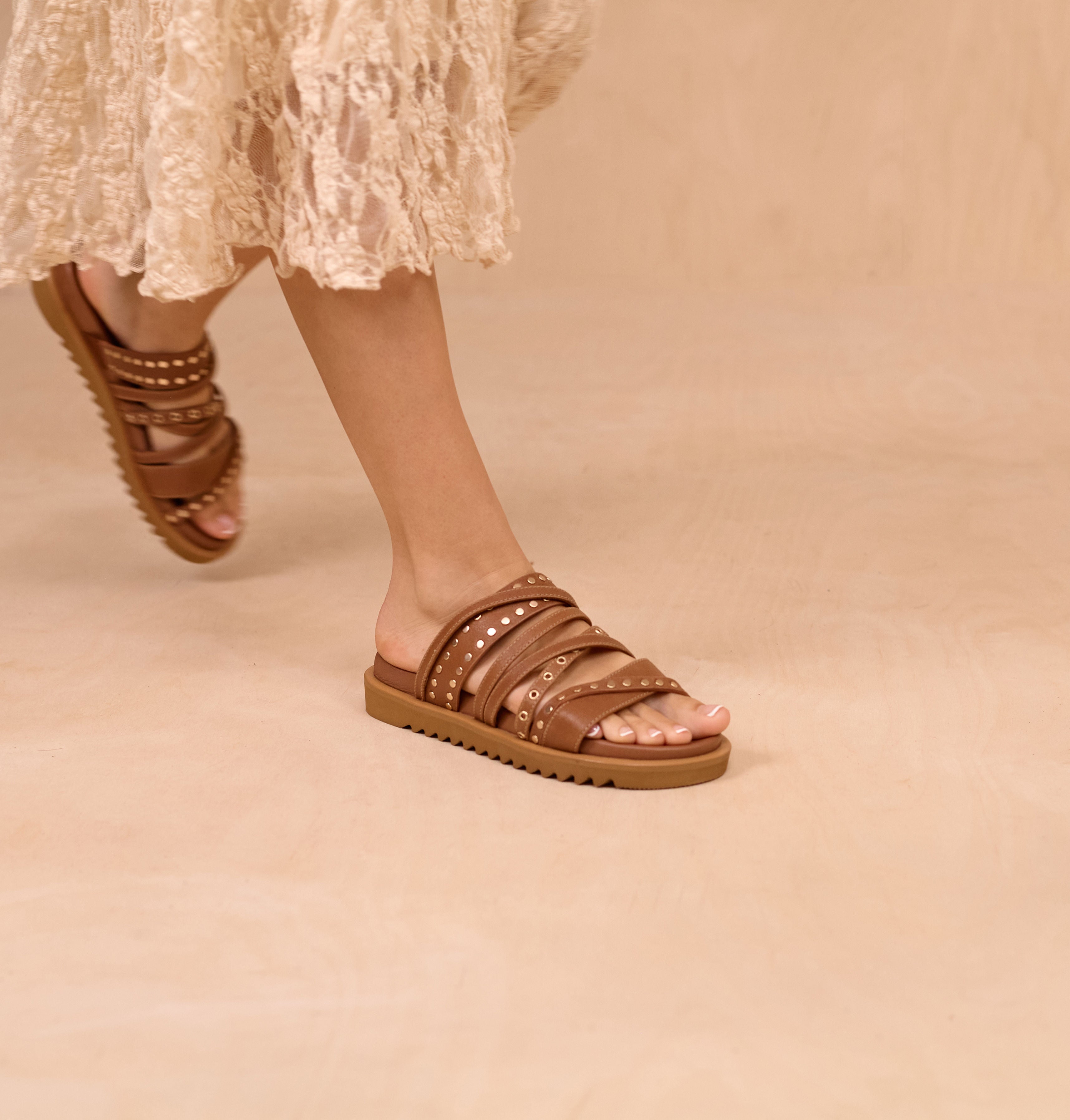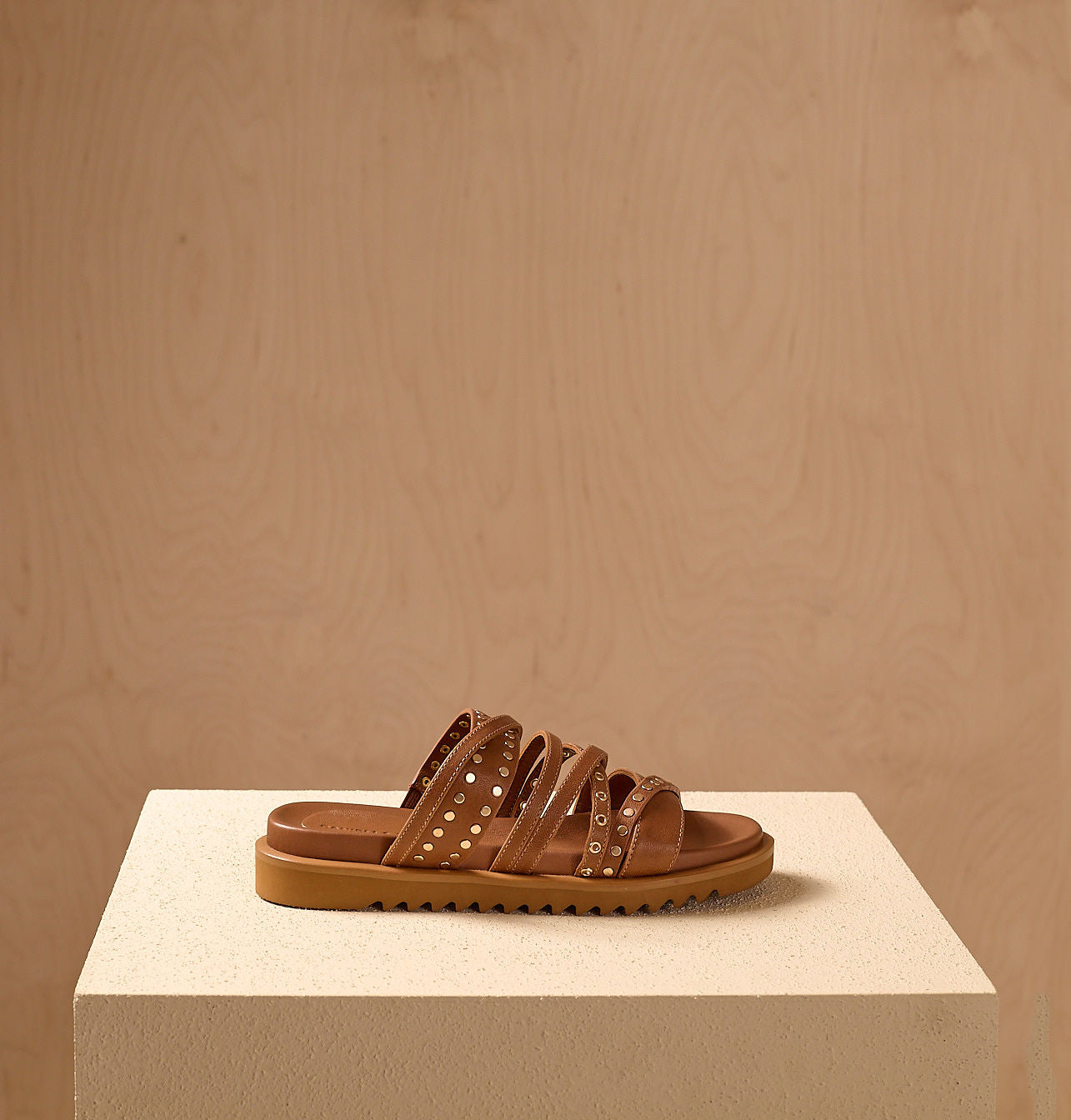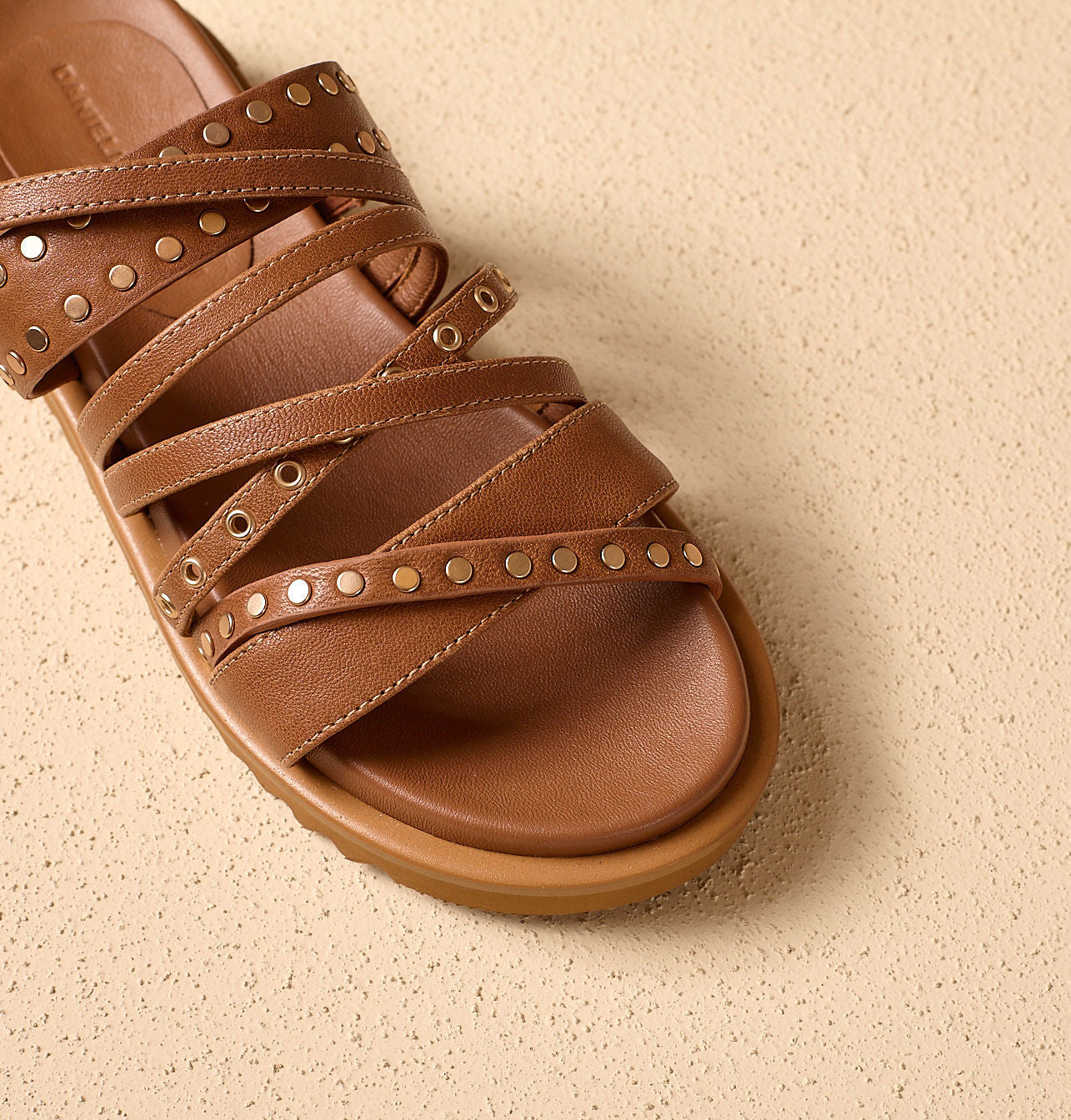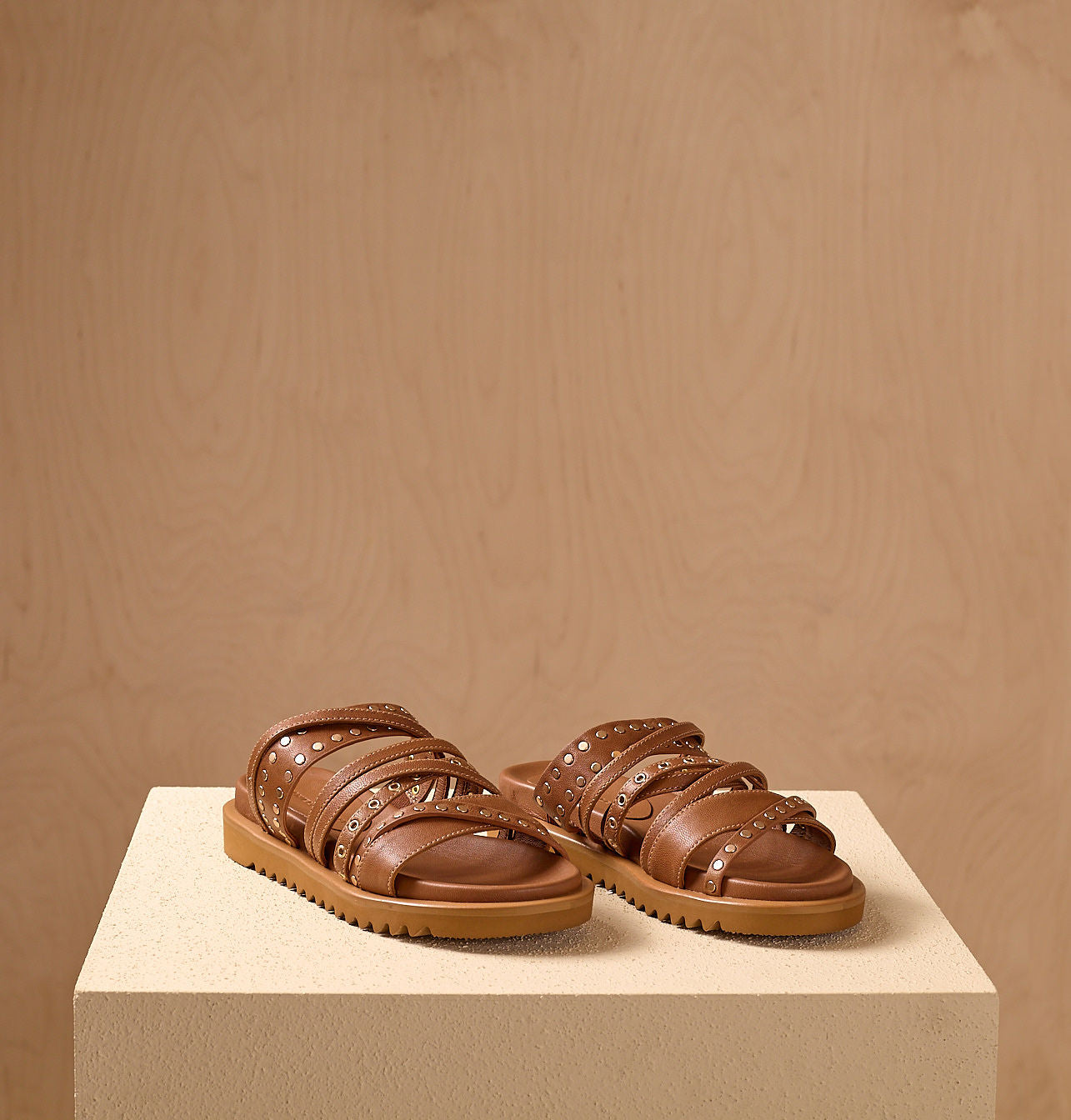 Mallis Studded Slides are sandals for women who appreciate modern design and comfort. These sandals feature thin straps that hug the foot, providing precise support and comfort throughout the day. The lightweight and airy construction, combined with metallic studs, creates an elegant look that complements any outfit.