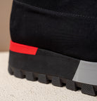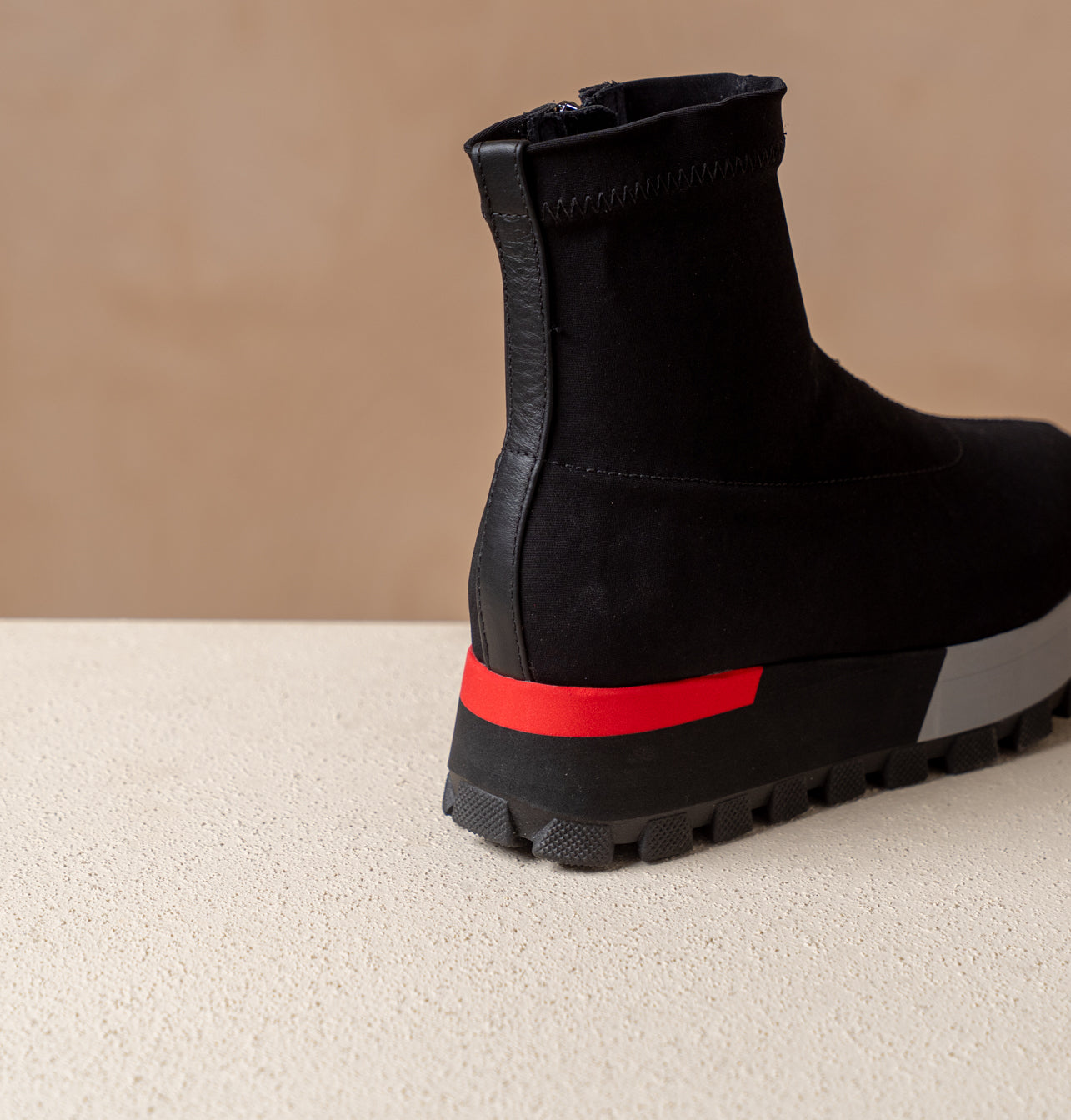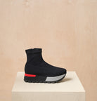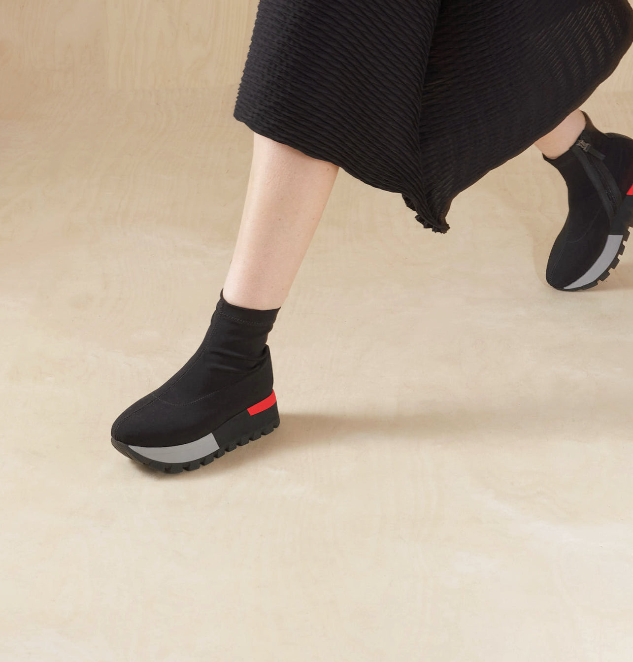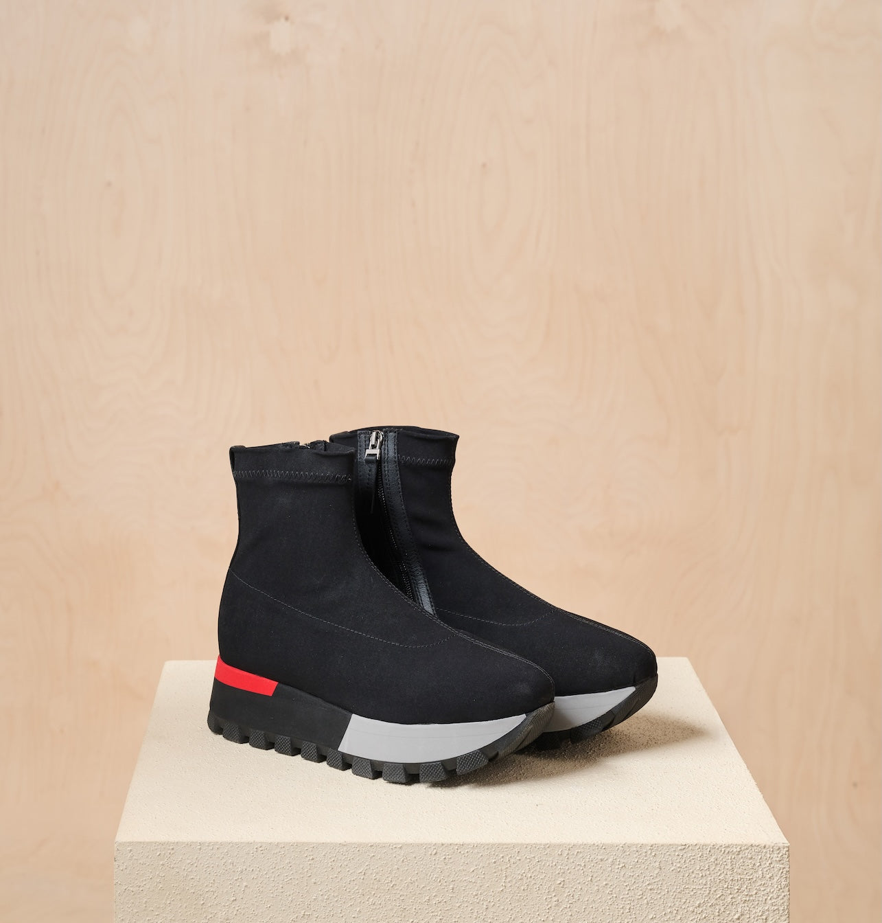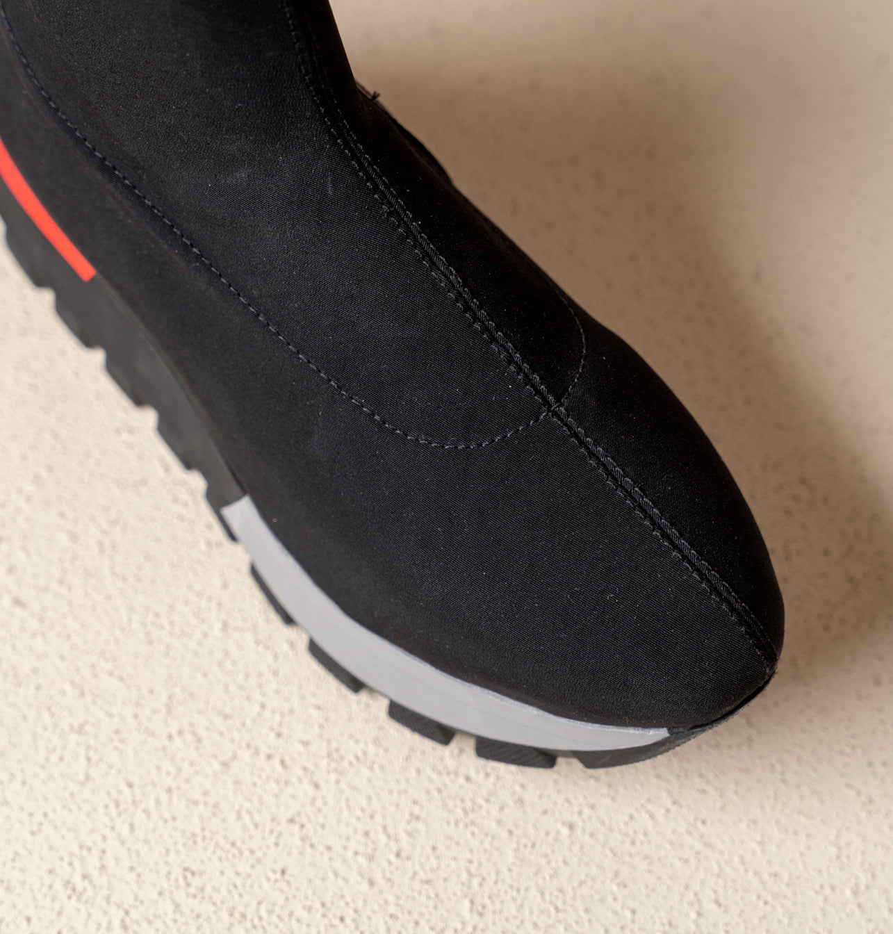 Marlene Lycra Boots are lightweight sneaker-style ankle boots crafted from high-quality stretch Lycra that gently hugs the foot like a soft sock. The clean lines and minimal black surface are accentuated by a subtle colored stripe along the sole, adding a refined, lively touch.