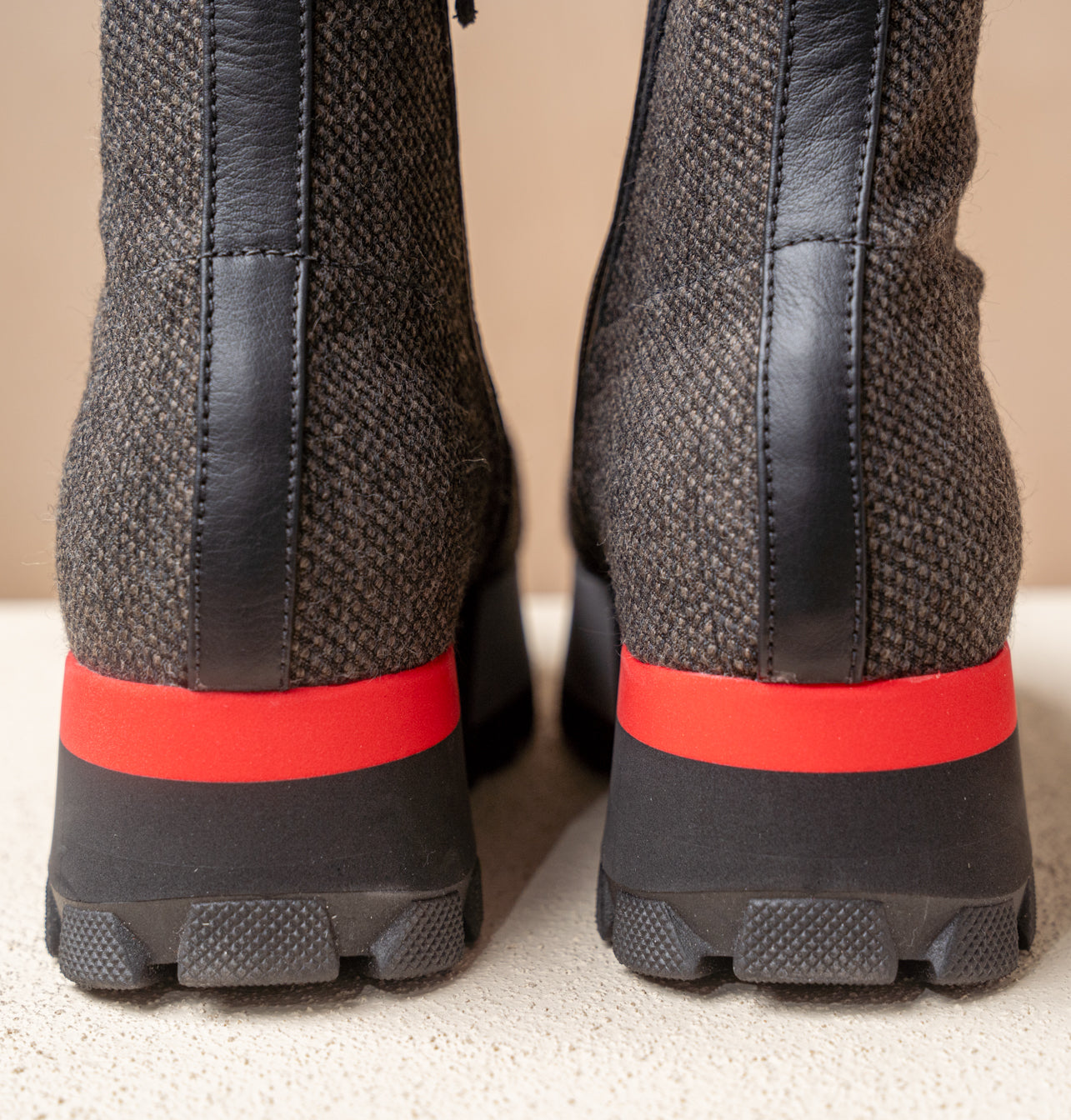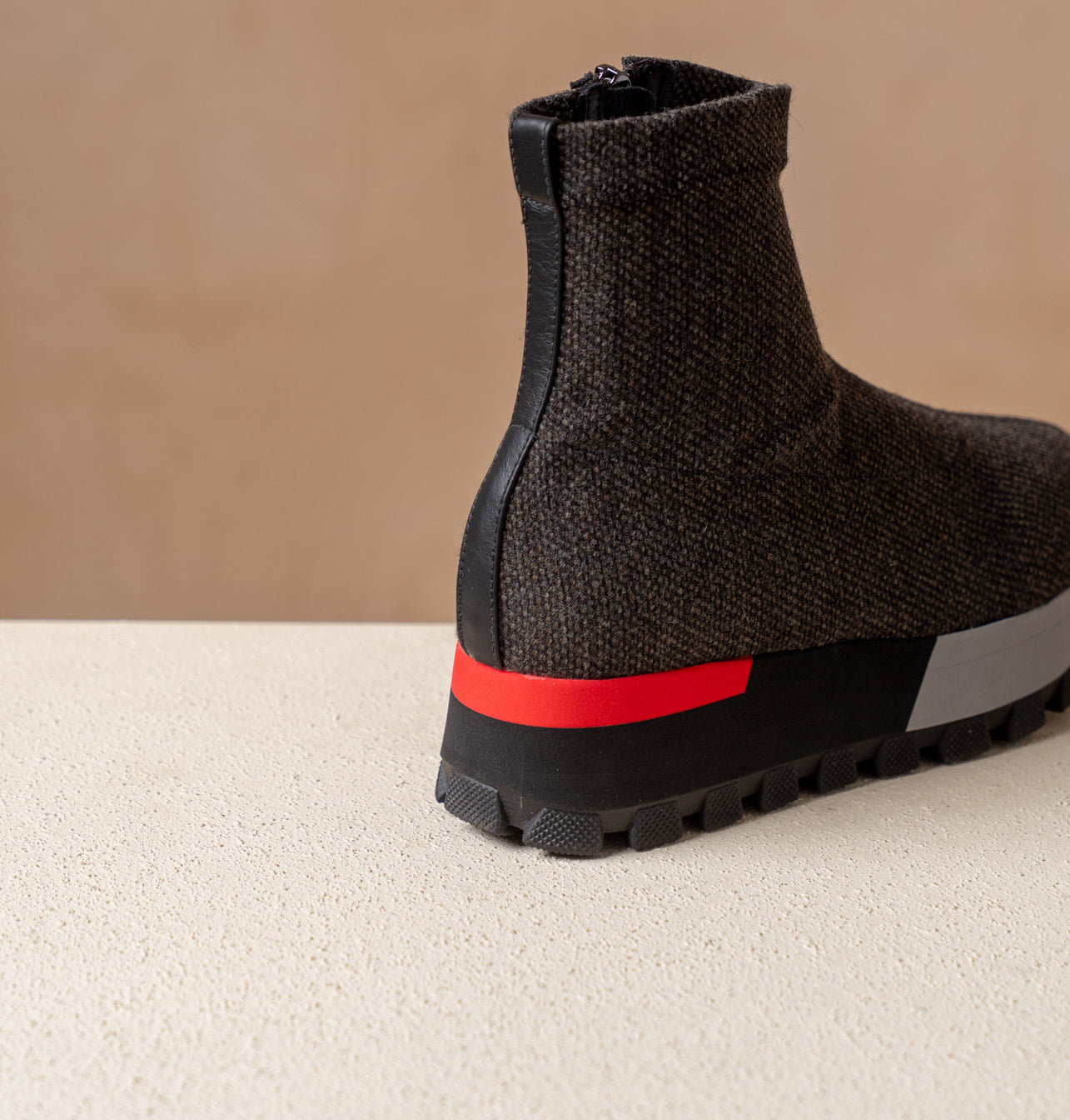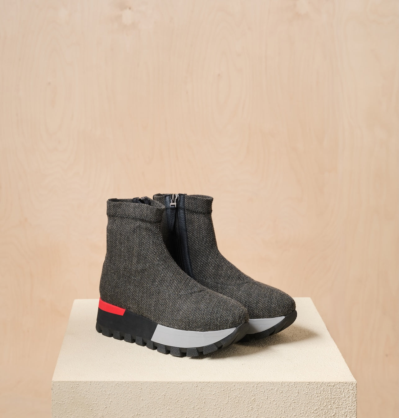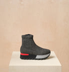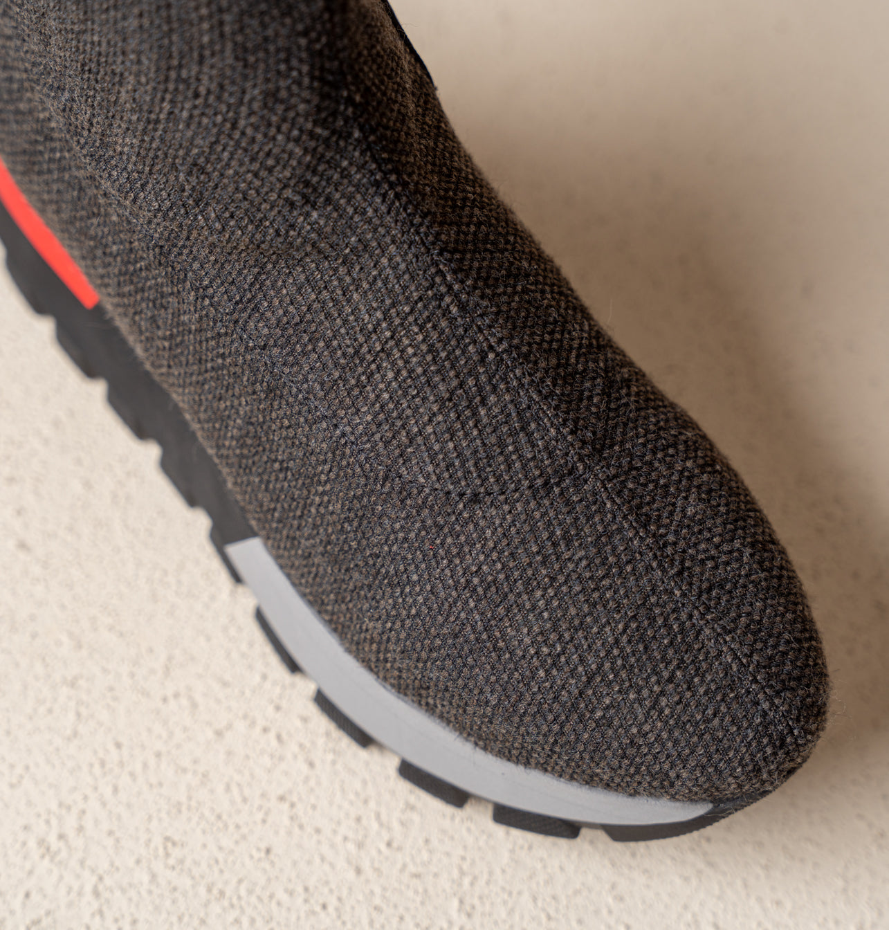 Marlene Lycra Boots are lightweight sneaker-style ankle boots crafted from high-quality stretch Lycra that gently hugs the foot like a soft sock. The clean lines and minimal black surface are accentuated by a subtle colored stripe along the sole, adding a refined, lively touch.