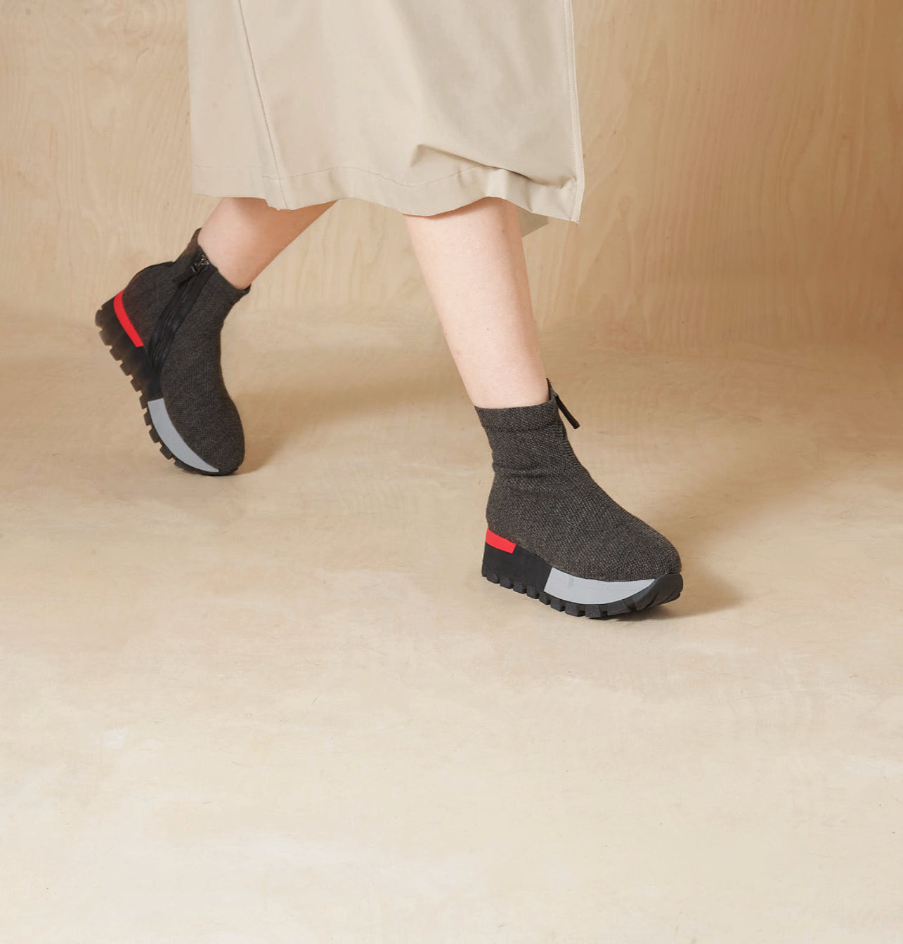A side zipper allows for easy wear, while the elastic upper adapts comfortably to the shape of the foot. The airy platform sole provides long-lasting comfort, even during extended walking.