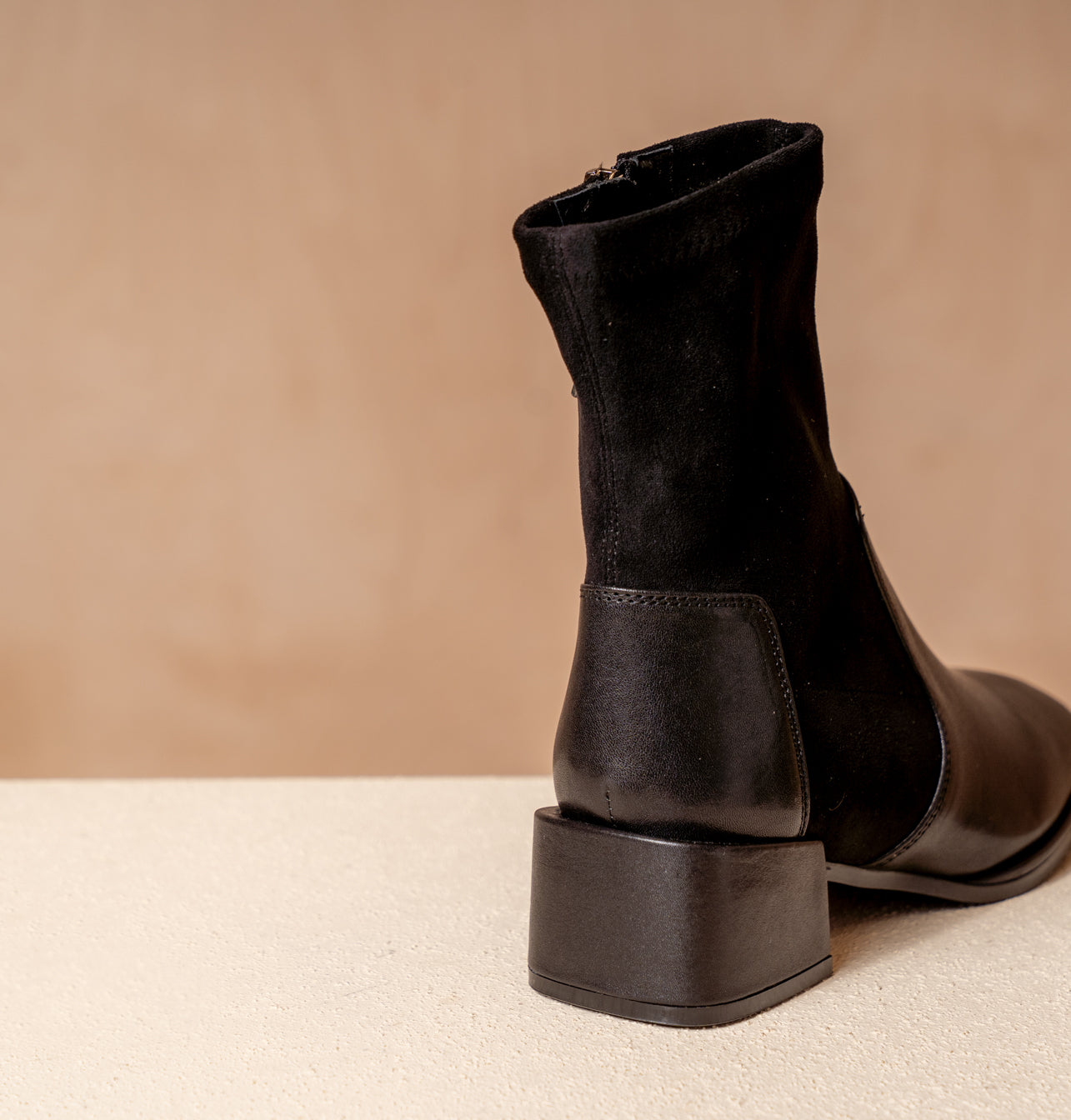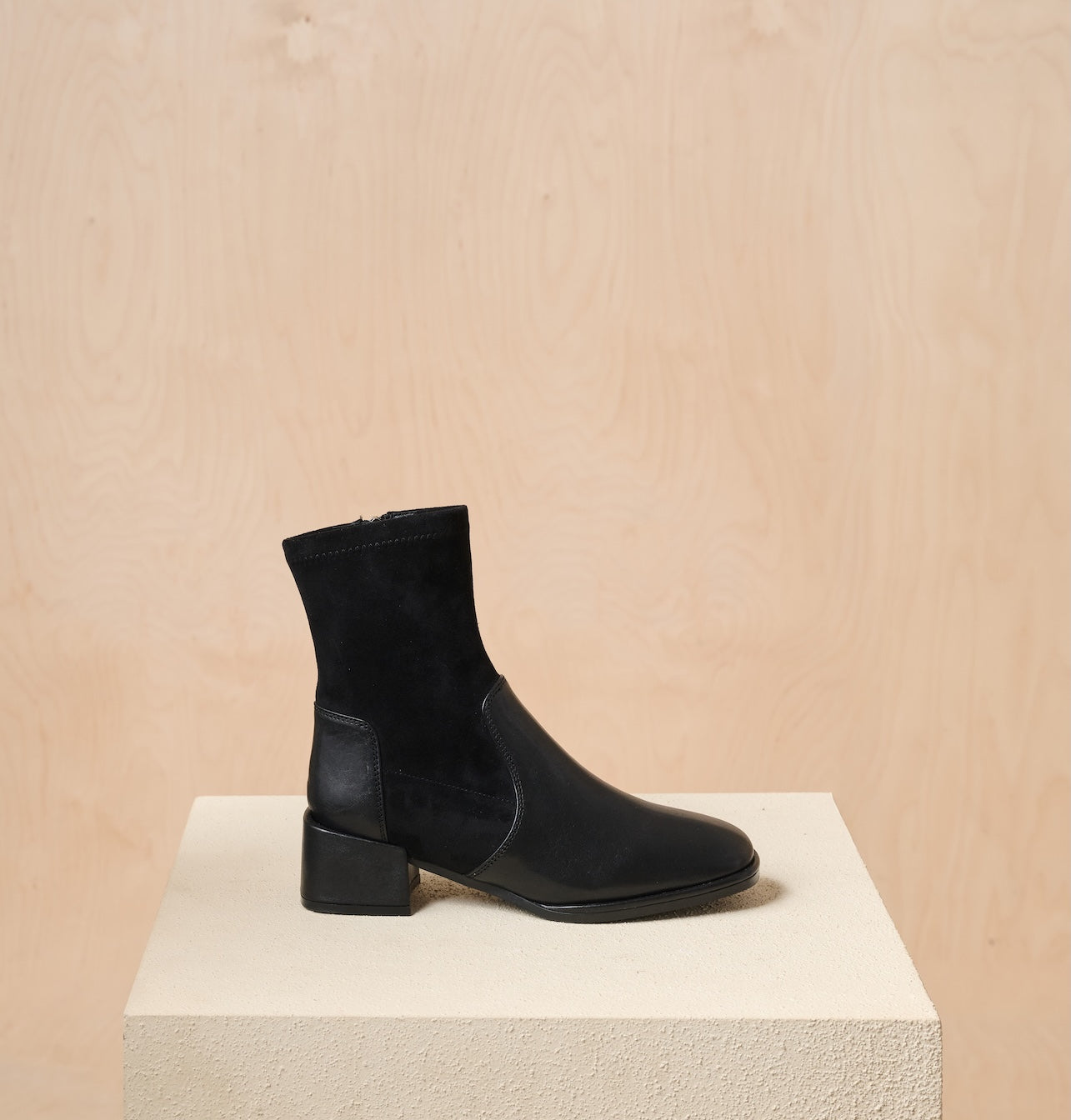 A wide, stable block heel with geometric lines gives the boot its unique character.