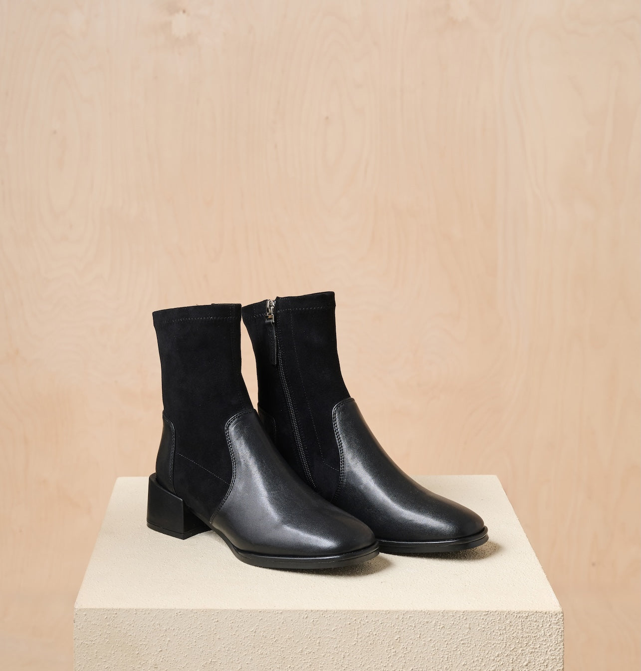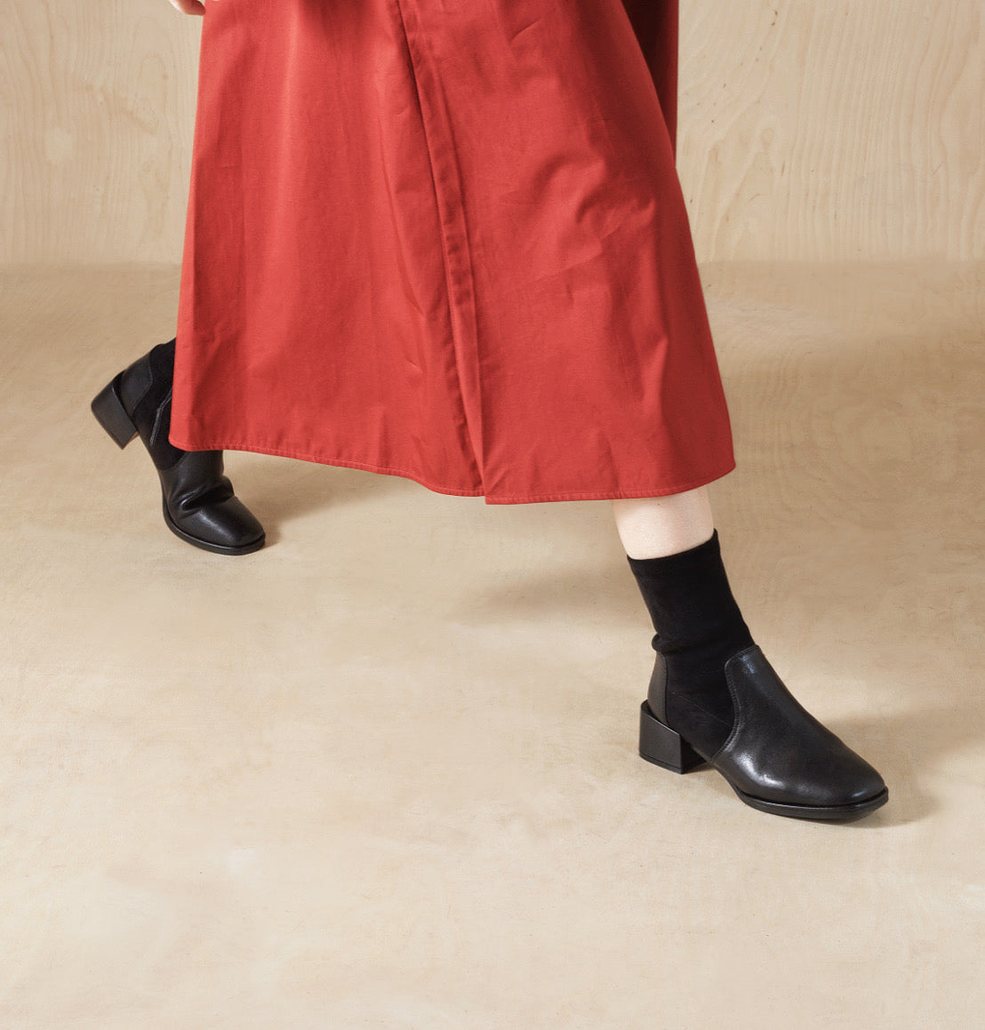 Quebec Stretch Boots are crafted from smooth Nappa leather combined with soft Lycra that gently wraps and adapts to the shape of the foot. The precise cuts and material combination create a classic silhouette with a distinct presence.