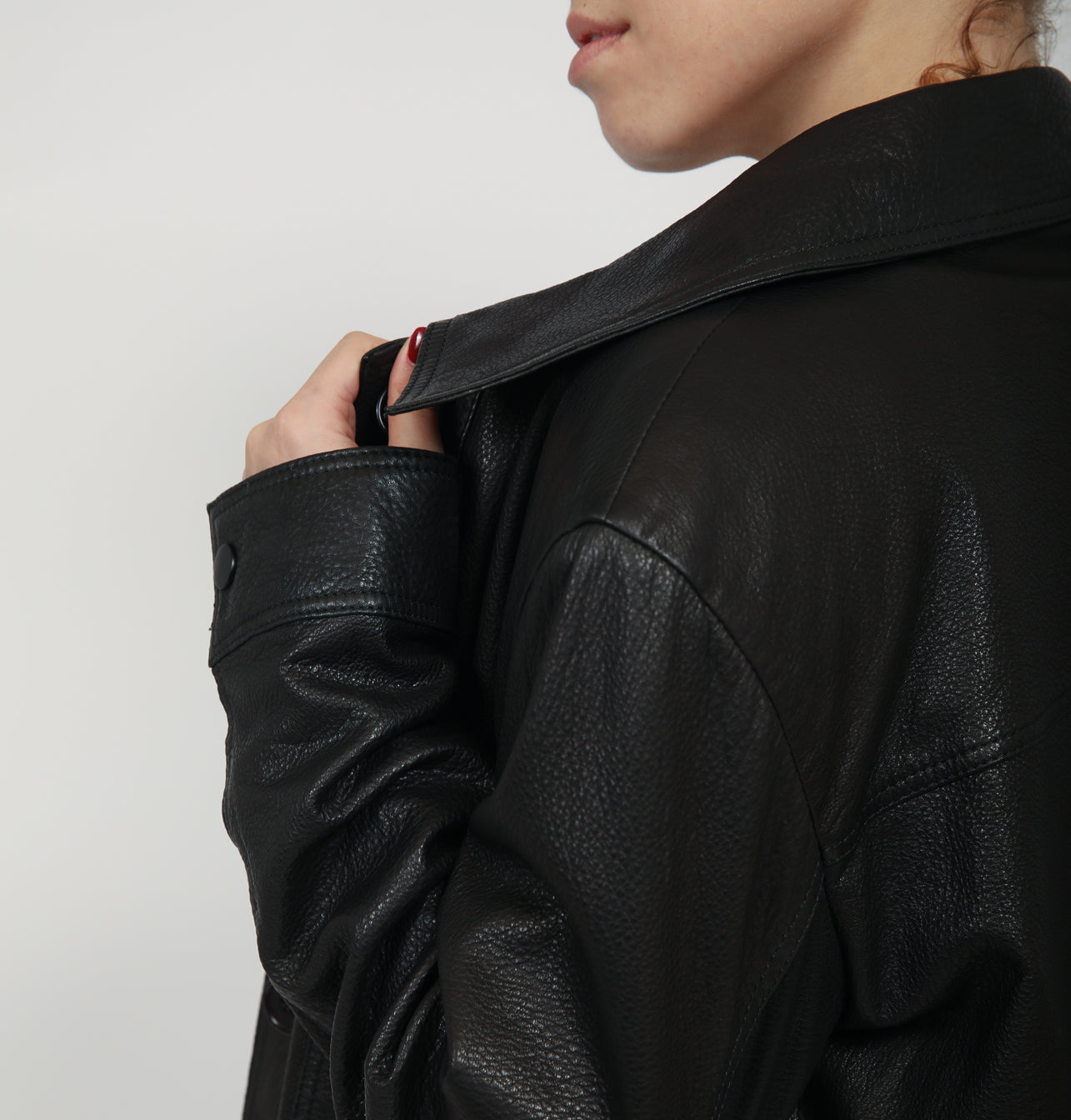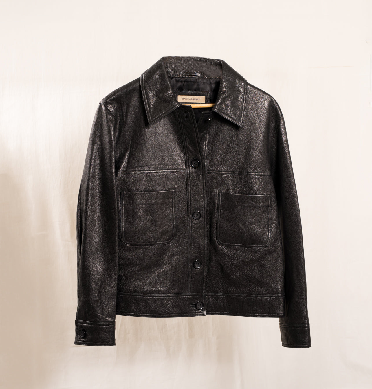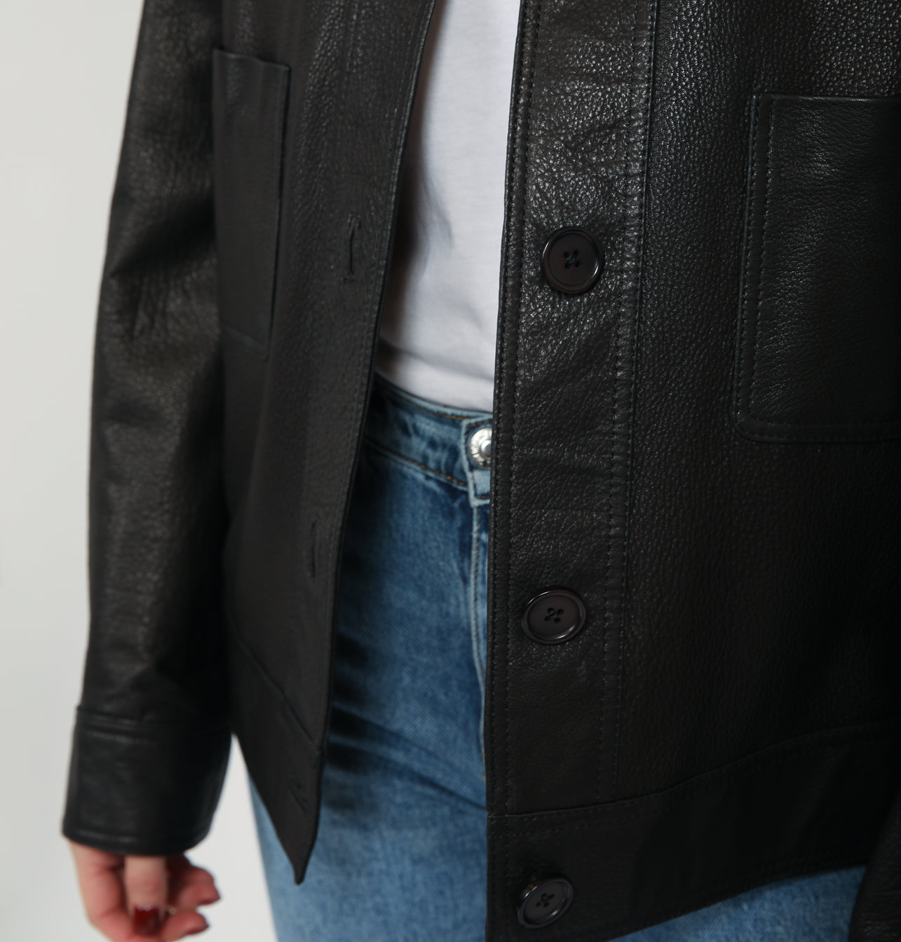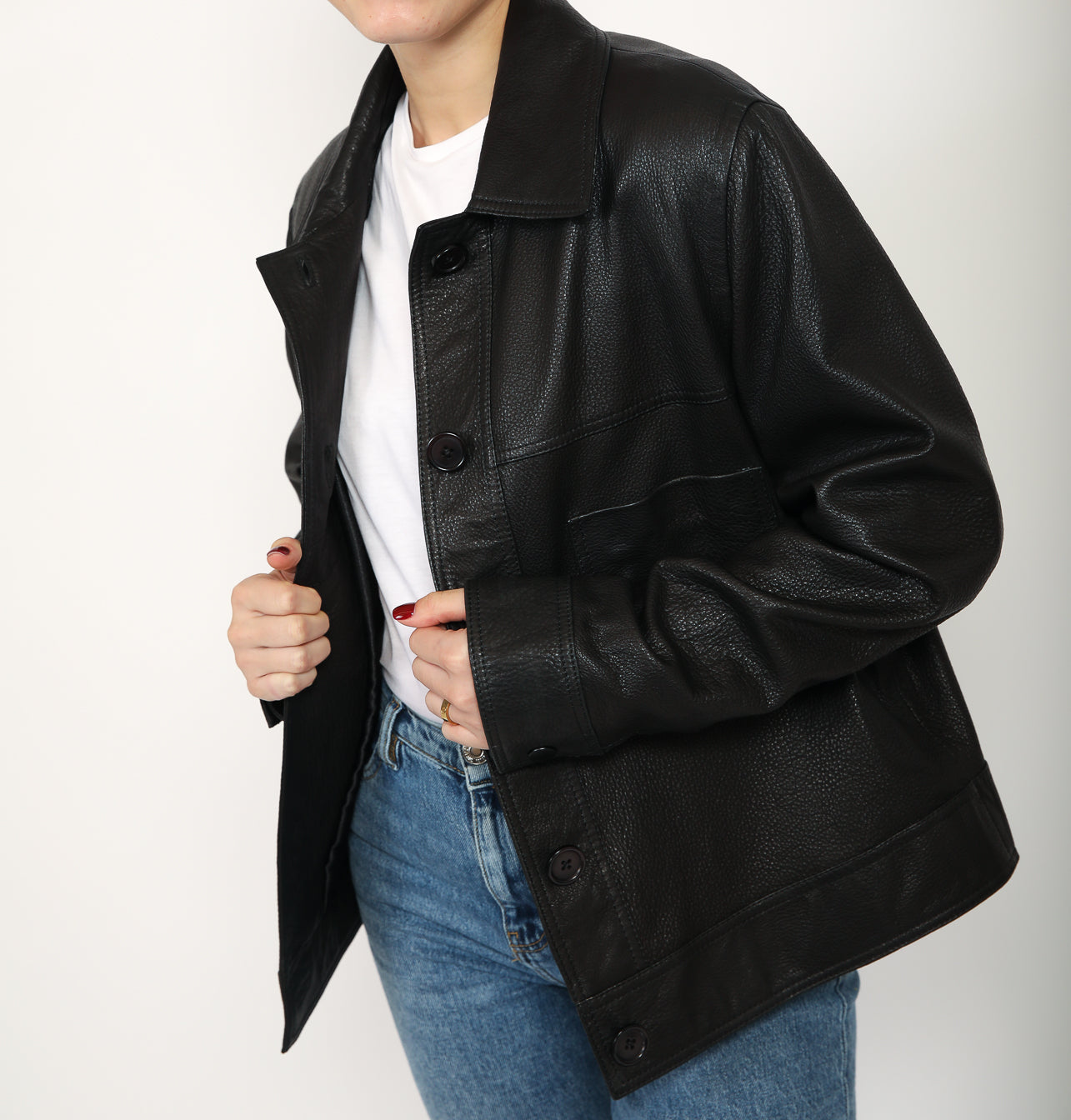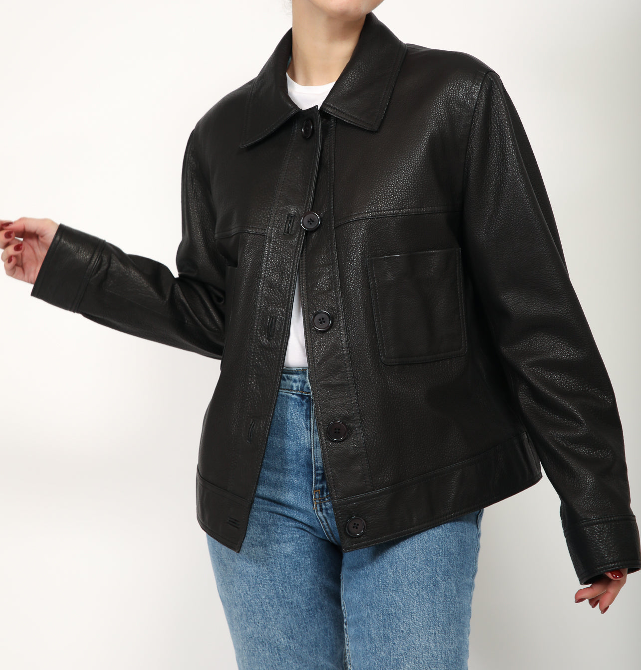 A soft leather jacket in a contemporary design that includes a classic collar, button closure and two front pockets. The jacket has a straight and flattering cut, which will suit you with any look.
