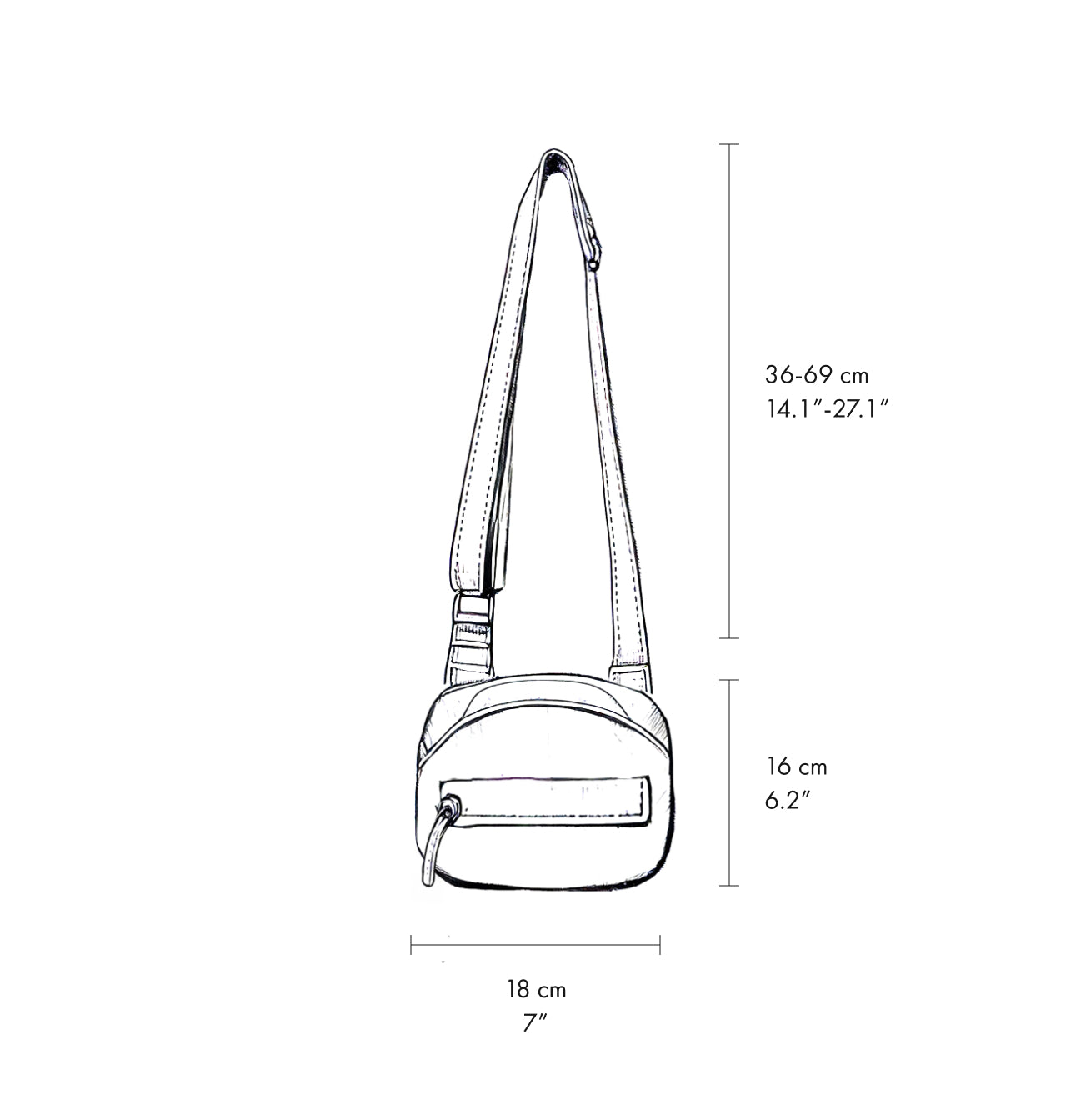 - Height: 16 cm (6.3") Width: 18 cm (7.8") Depth: 6.5 cm (2.5") Adjustable strap length: 80-145 cm (31.4"-57")