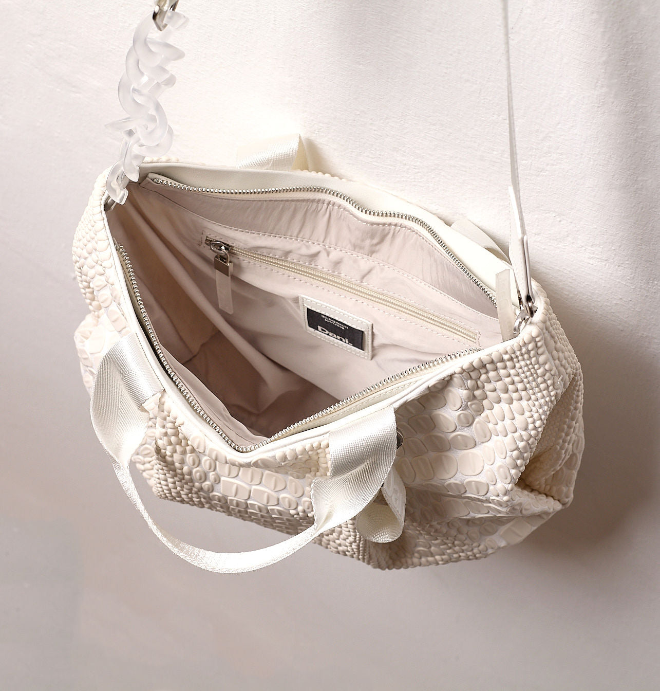 Tokyo Satchel is a classic design, crafted with a unique croc rubber technique developed in our studio, combining elegance with high functionality. The bag offers a spacious main compartment along with internal pockets for organized storage, making it perfect for any occasion — from daily wear to special events.