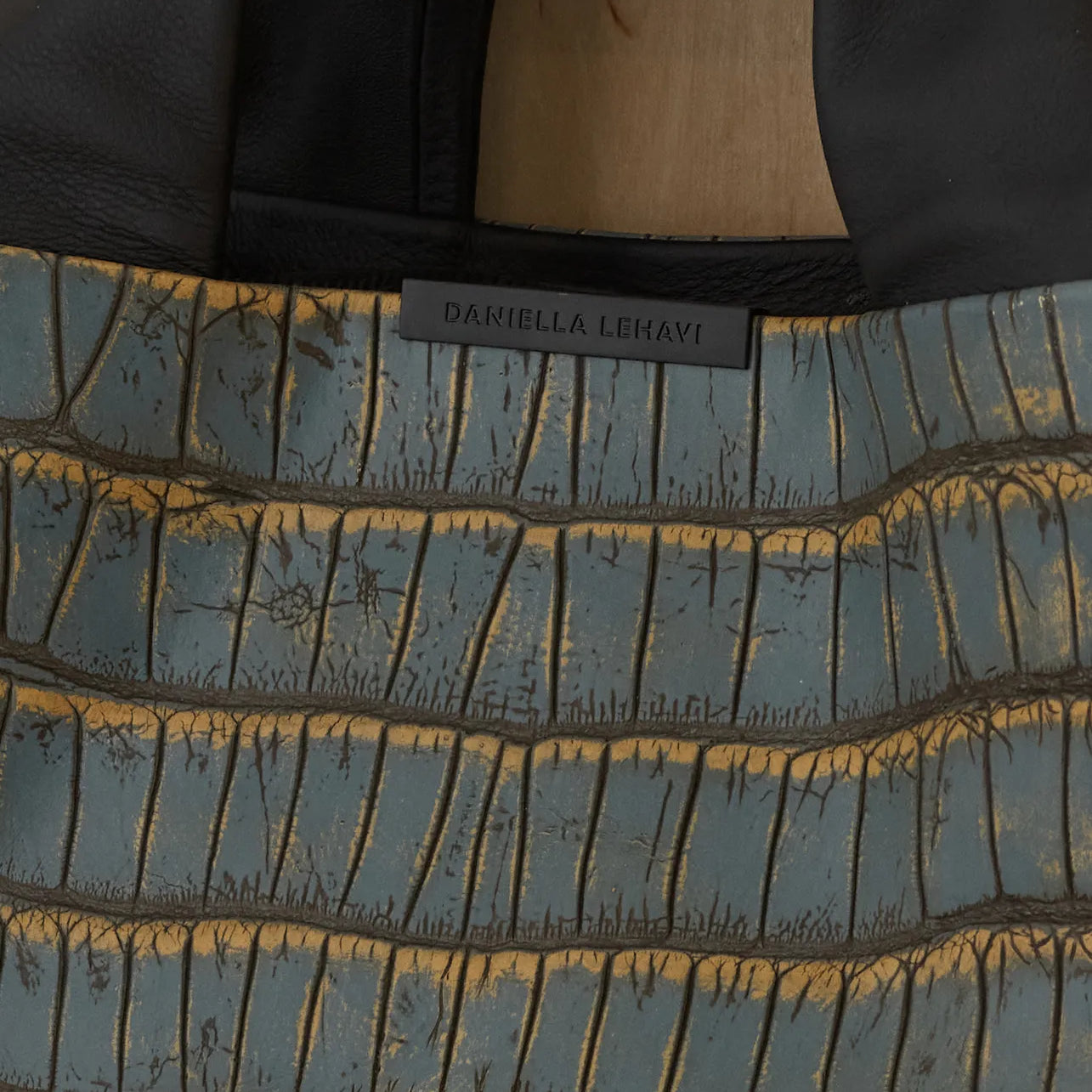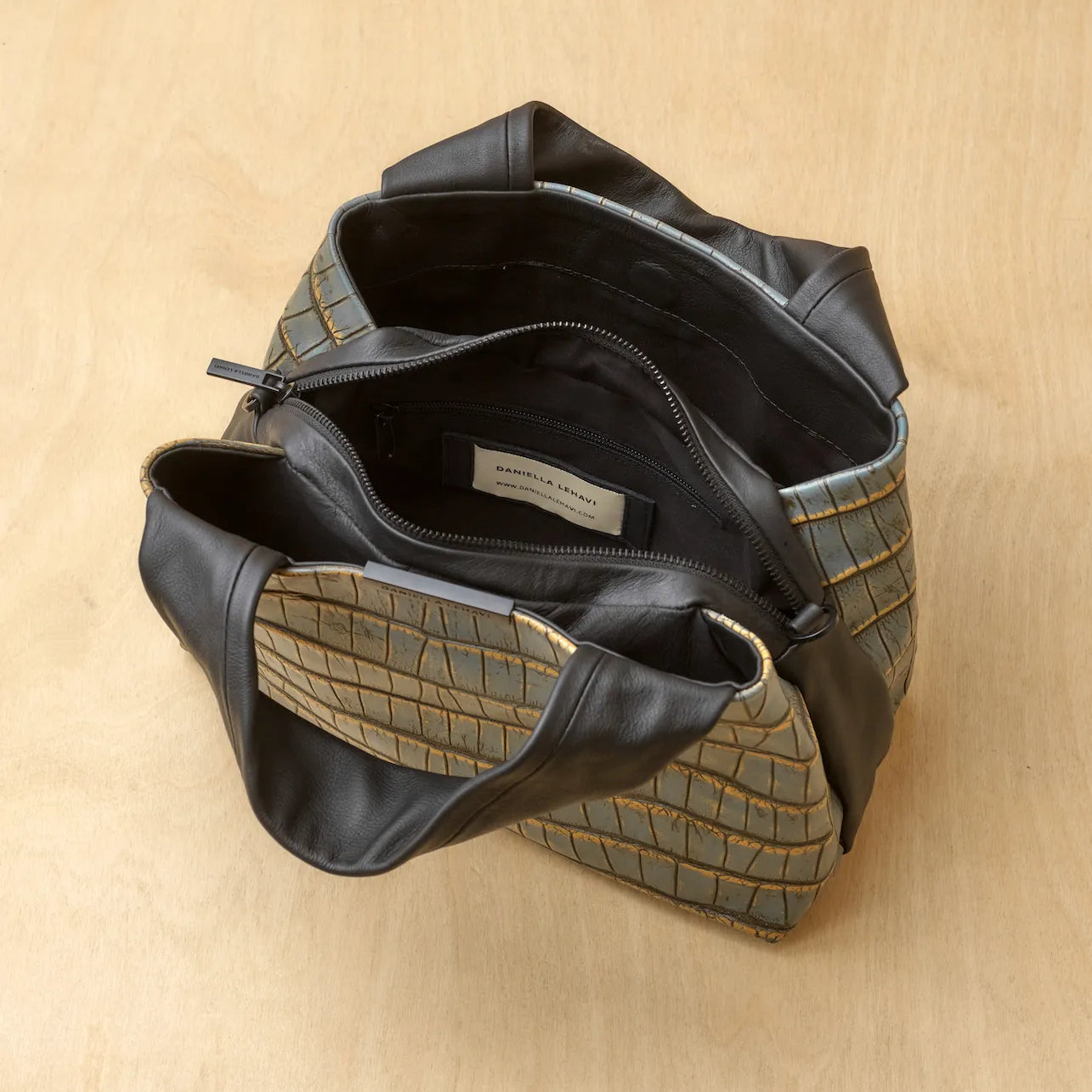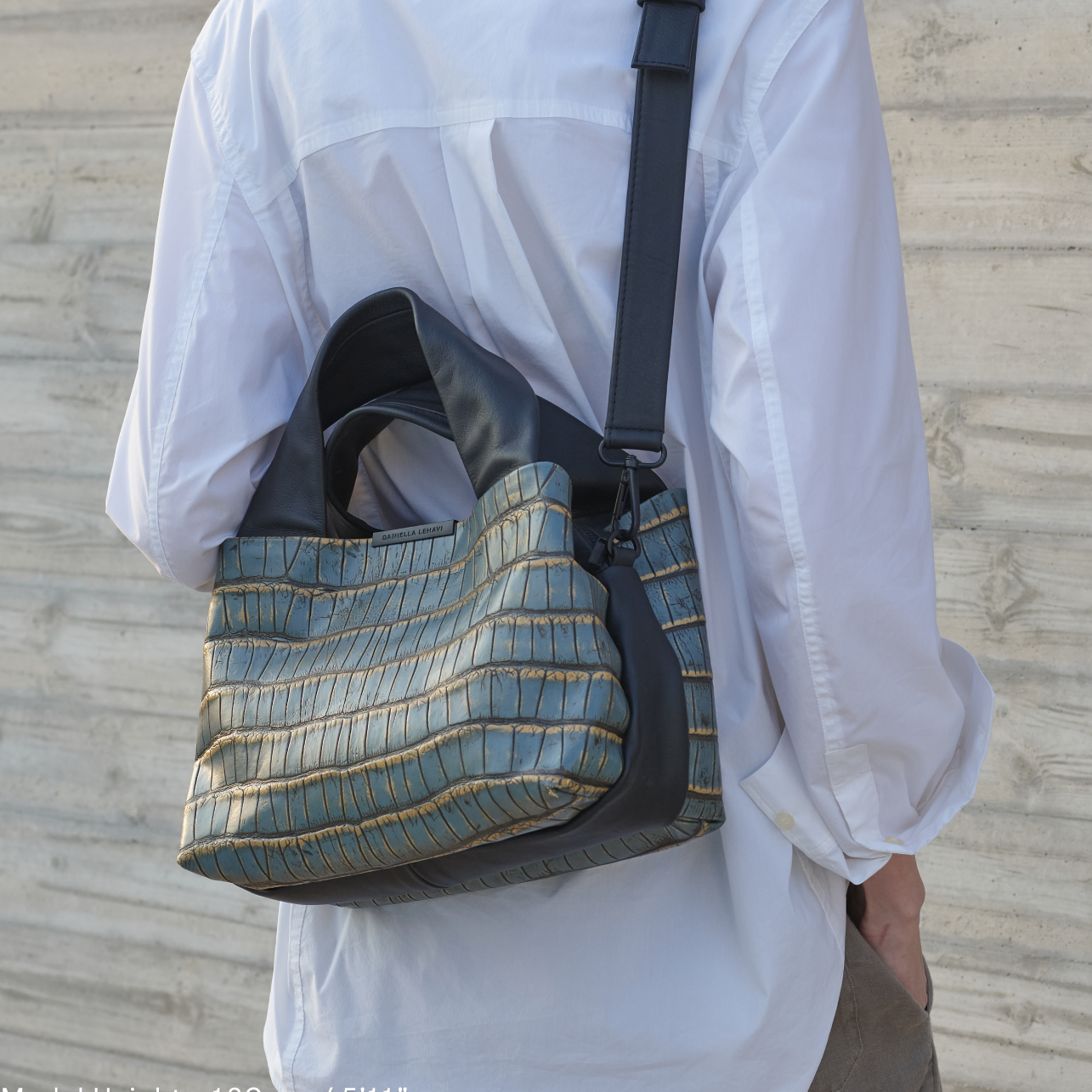 Daniella Lehavi specialized in handcrafted quality leather, an area studied for years. Eventually professionals joined her in a workshop set up in the studio. Daniella was open to the extraordinary possibilities inherent in natural leather. These quality leathers are manufactured in Italian factories and imported to Israel exclusively for the brand. The leathers are designed using original manual processes of dyeing, printing and embossing textures that were used along with impressive new developments and accurate coloring. These have become her trademark and distinctive signature of the brand.